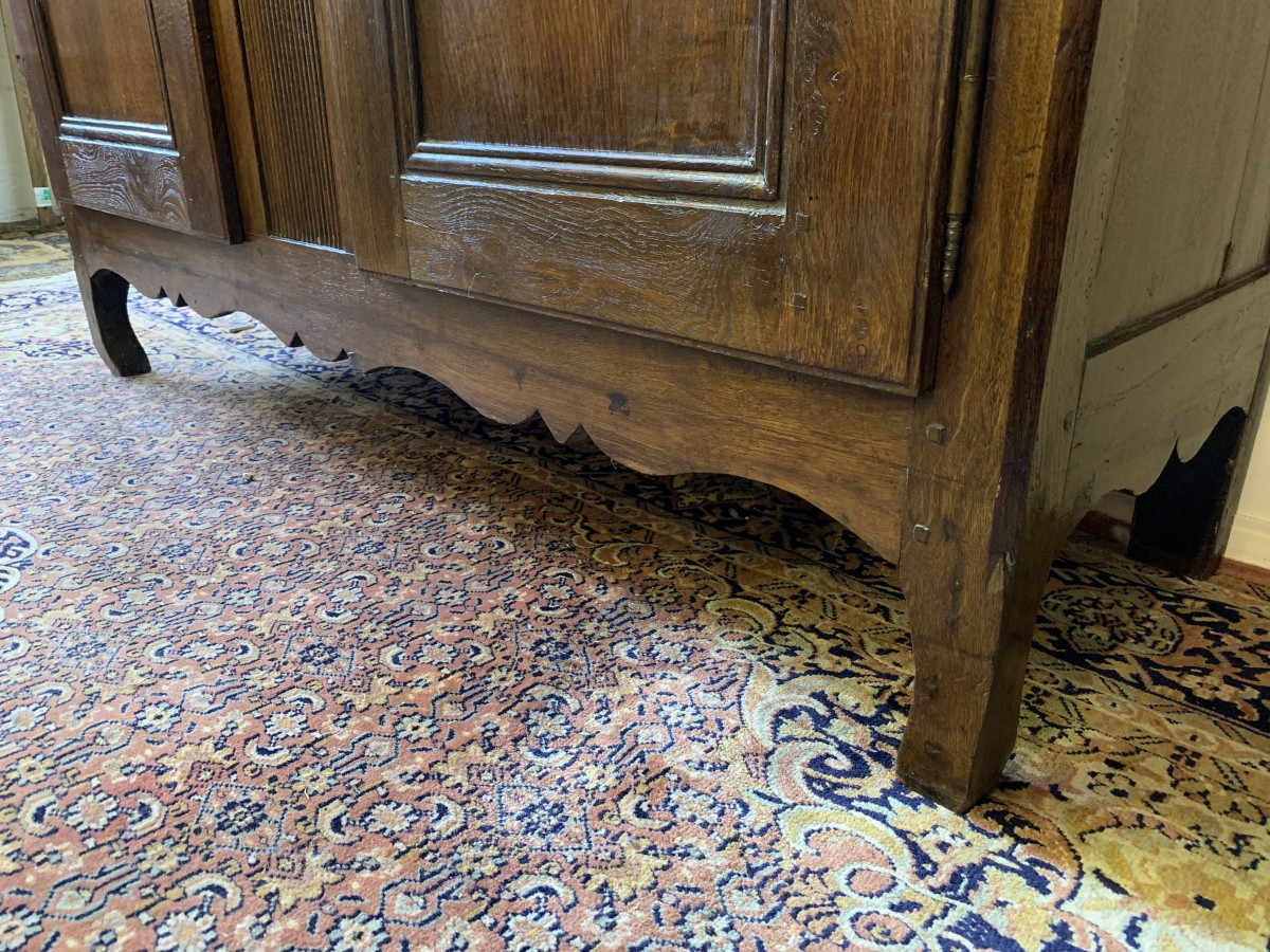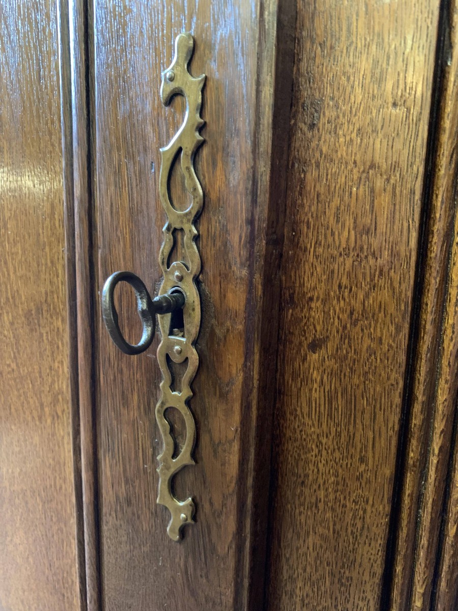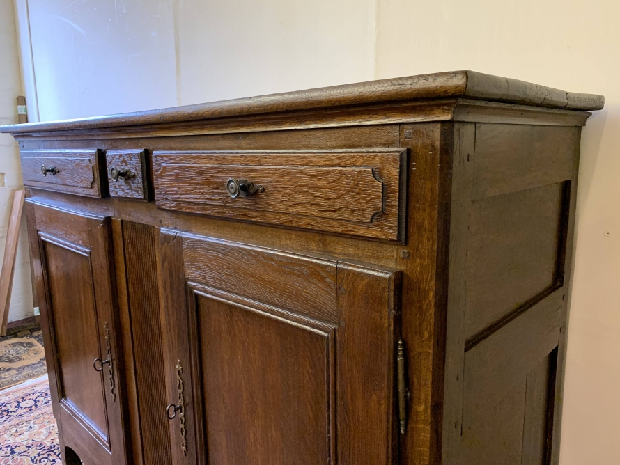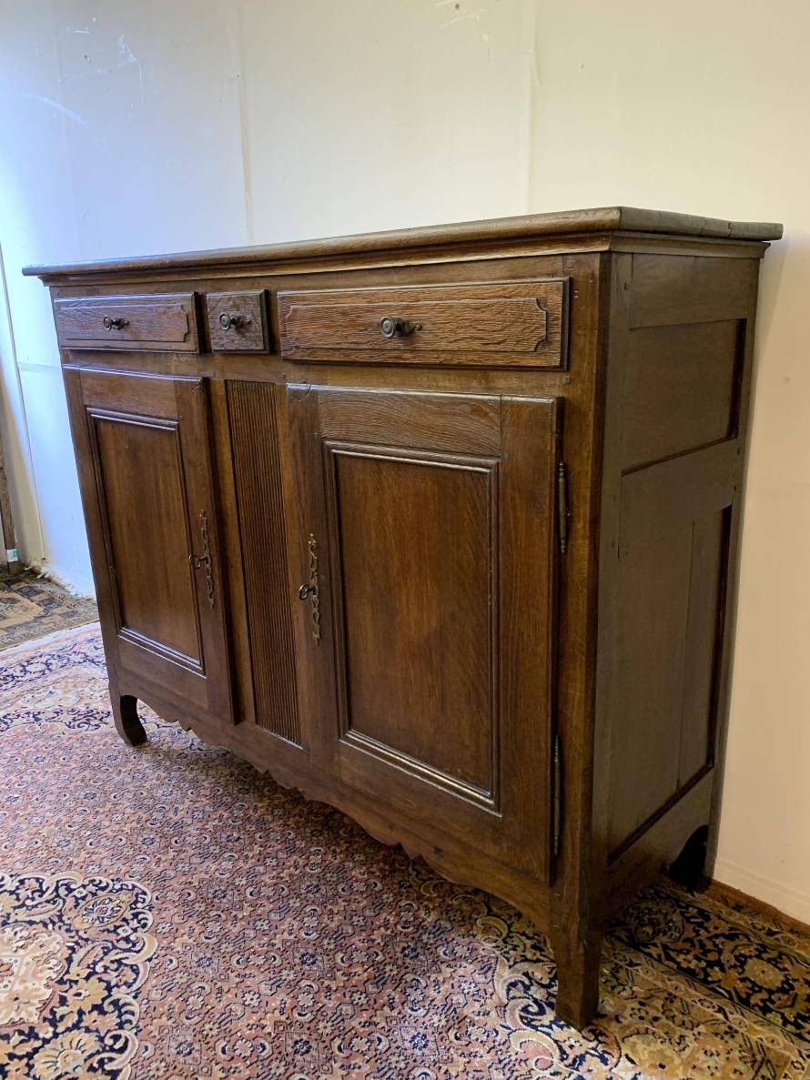 Made in glorious solid oak this rustic country dresser oozes style and quality. The oversailing top sits above a small central drawer which is flanked by a pair of larger drawers, each drawer having a turned knob handle. Central reeded decoration flanked by a pair of lockable recessed panelled cupboard doors, each door having brass hinges ornate escutcheon and key. The doors open to reveal a boarded back and base with wooden removable shelf. Recessed panelled sides the dresser stands on traditional block feet.