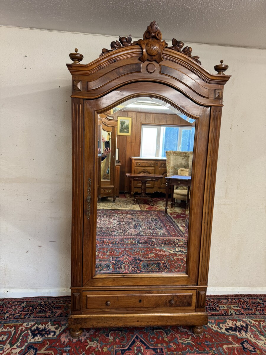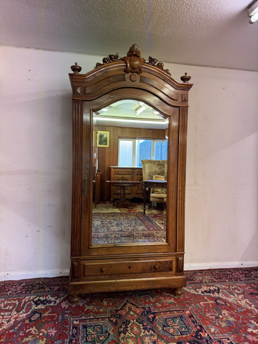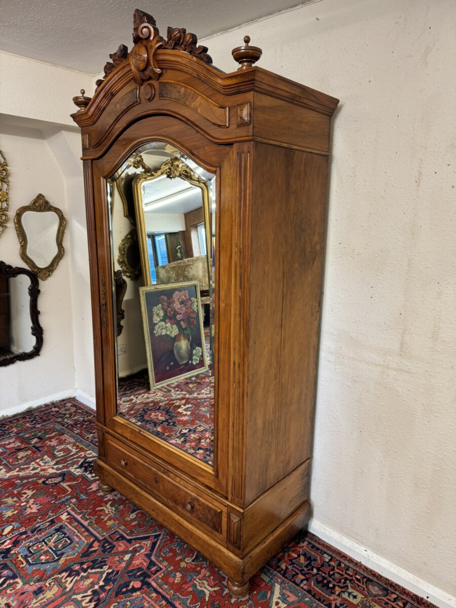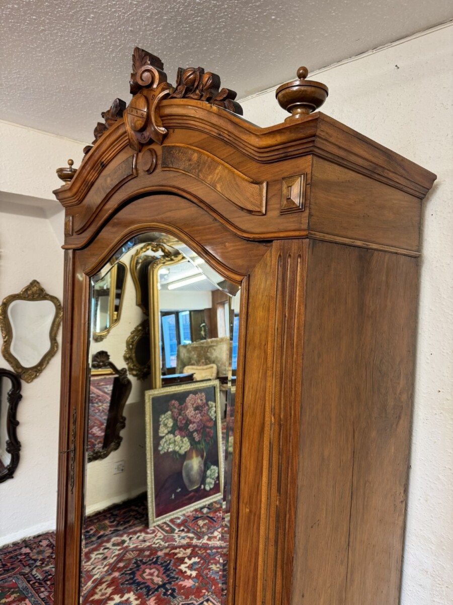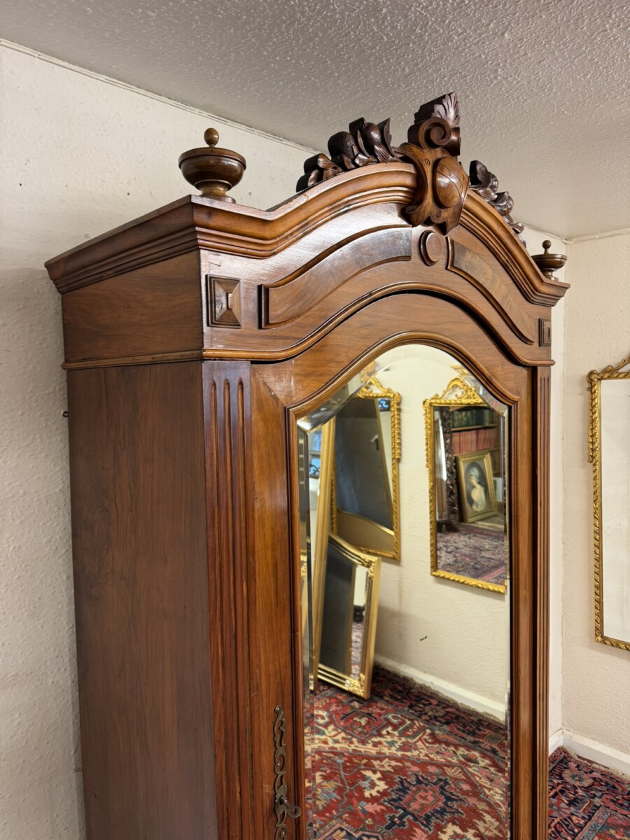 This fabulous French walnut armoire dates circa 1890. The shaped top has a central carved crest, carved decoration and two removable turned finials, below is a lockable bevel edged dressing mirror door, the door opens to reveal a hanging rail. Below is a drawer, the drawer having two turned handles. This fabulous armoire stands on turned feet to the front.