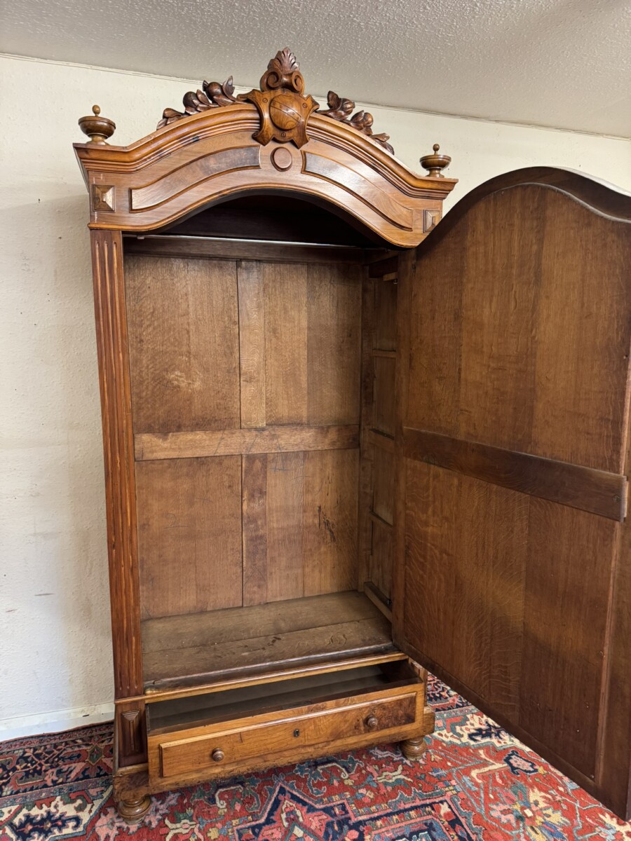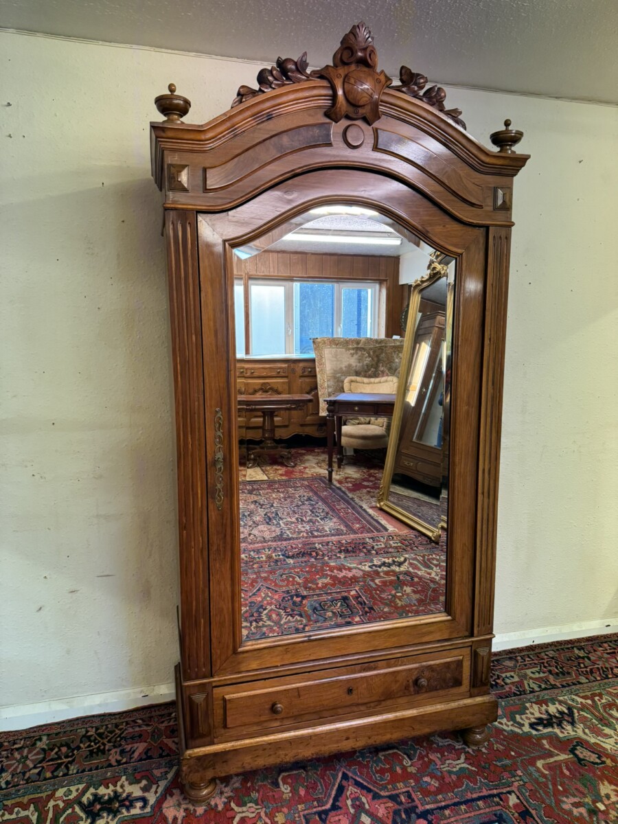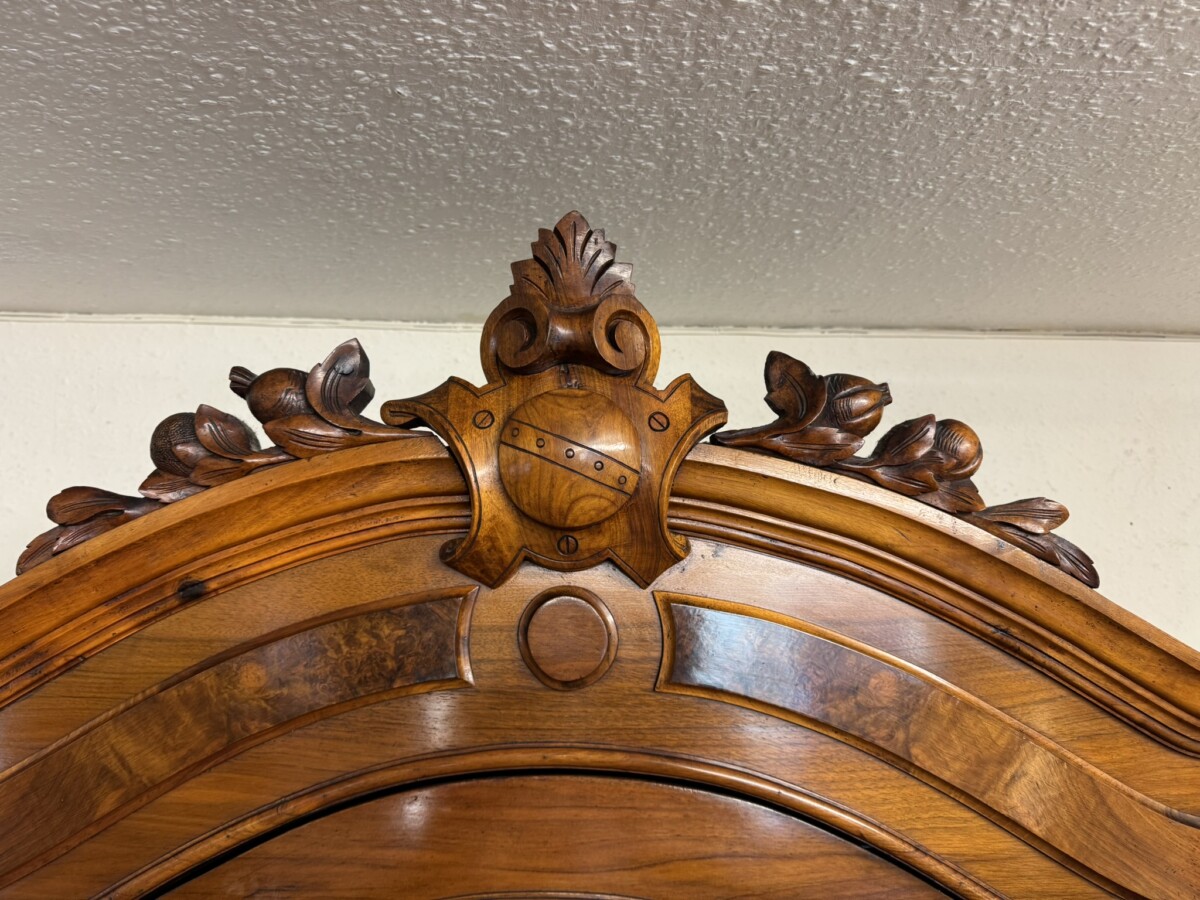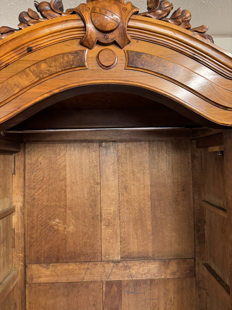 This fabulous French walnut armoire dates circa 1890. The shaped top has a central carved crest, carved decoration and two removable turned finials, below is a lockable bevel edged dressing mirror door, the door opens to reveal a hanging rail. Below is a drawer, the drawer having two turned handles. This fabulous armoire stands on turned feet to the front.