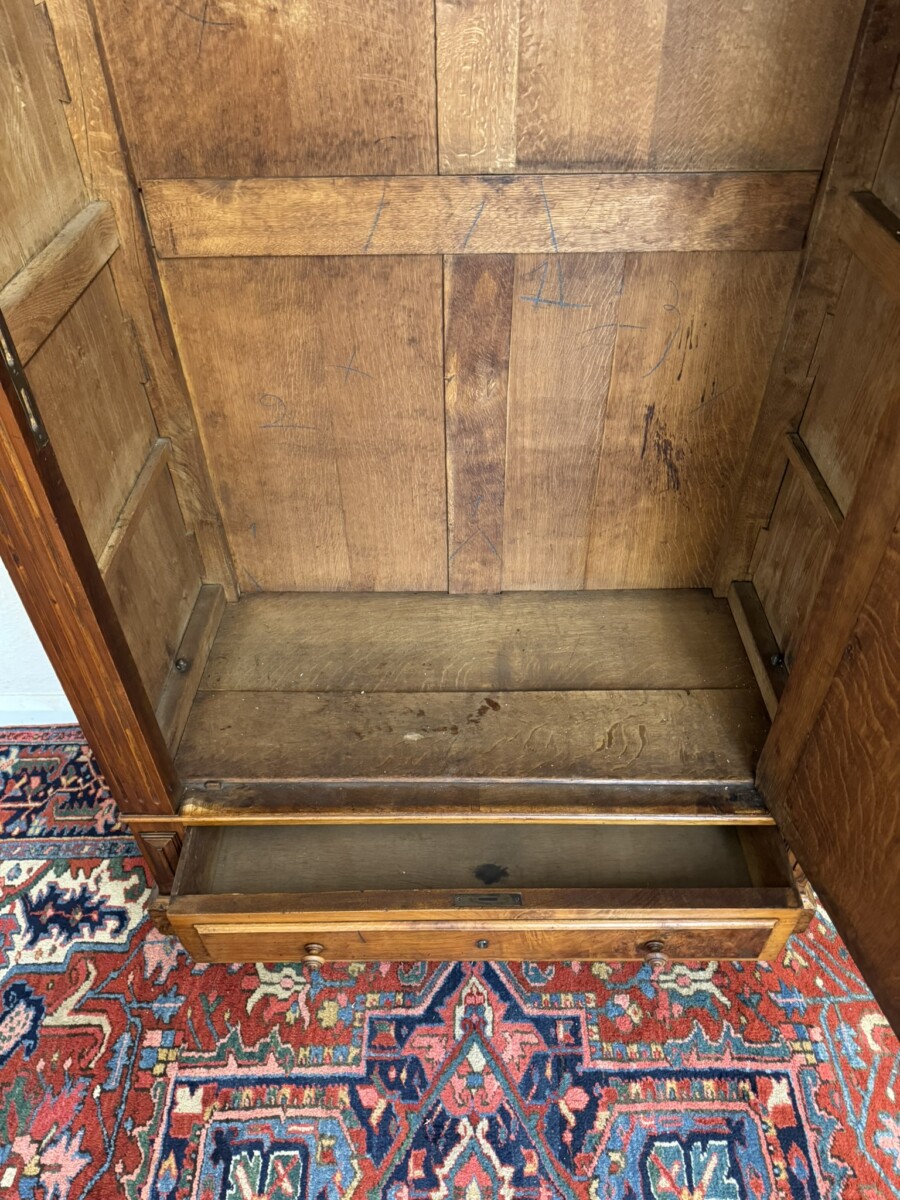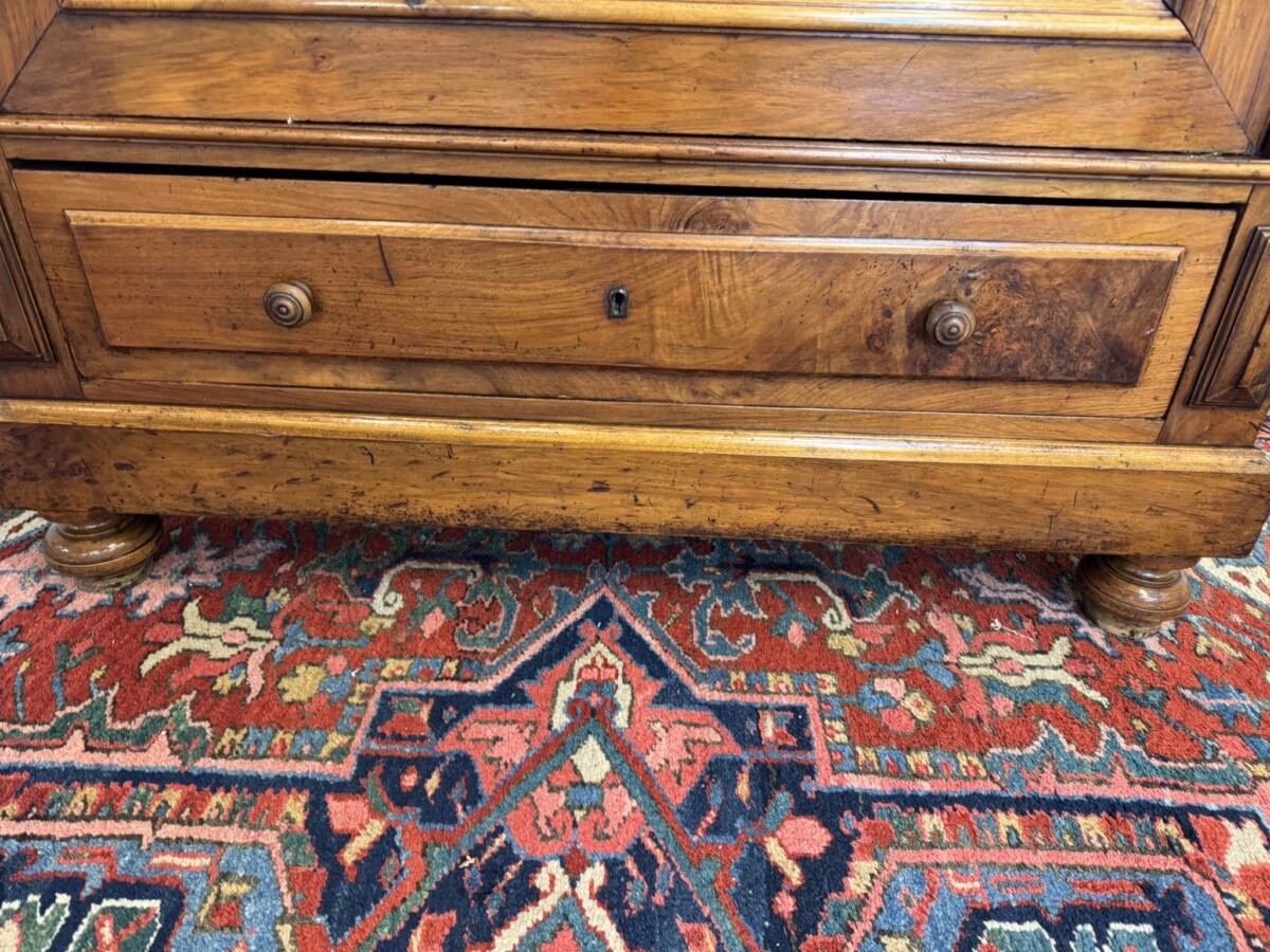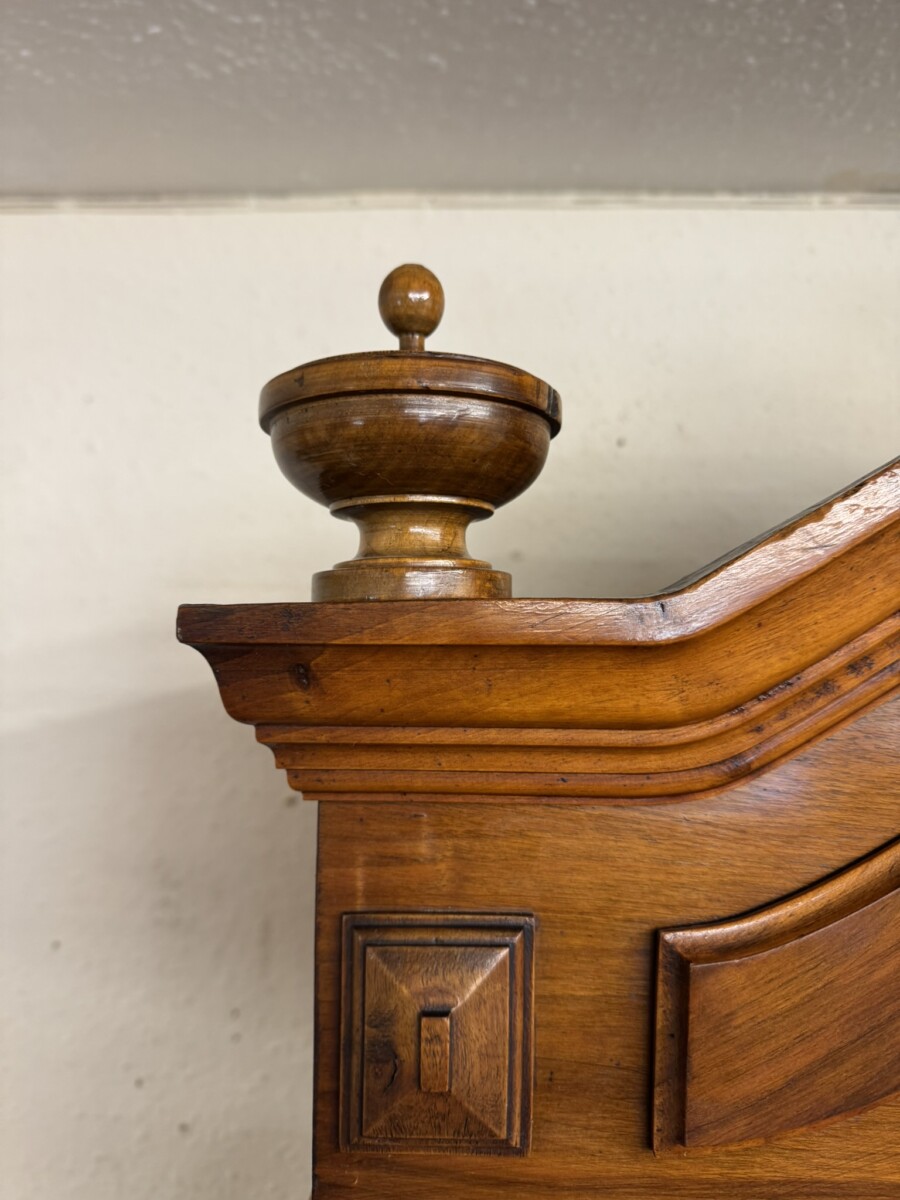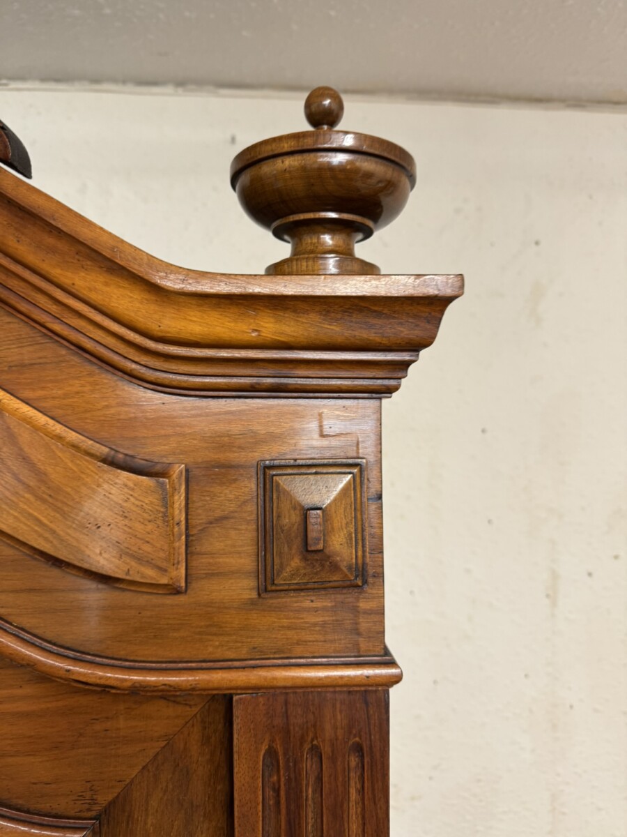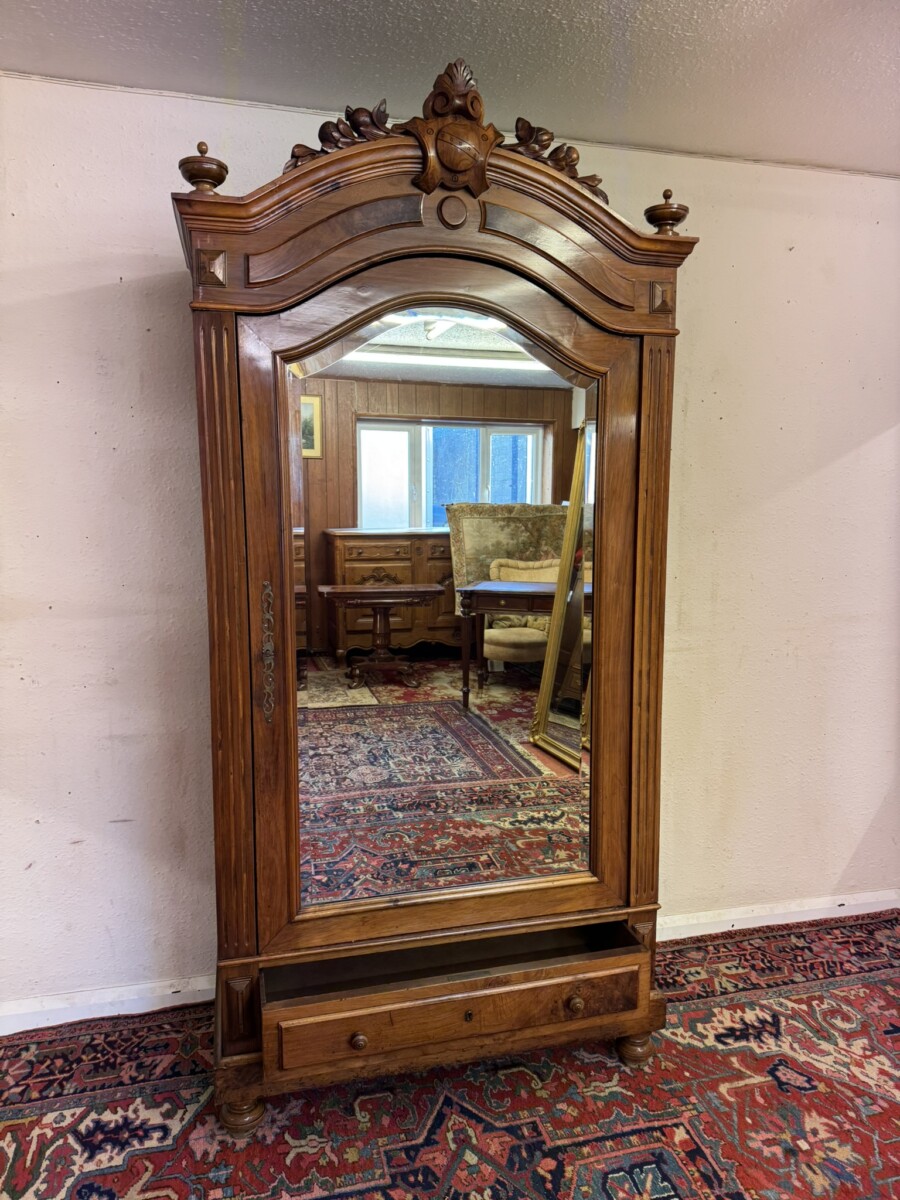This fabulous French walnut armoire dates circa 1890. The shaped top has a central carved crest, carved decoration and two removable turned finials, below is a lockable bevel edged dressing mirror door, the door opens to reveal a hanging rail. Below is a drawer, the drawer having two turned handles. This fabulous armoire stands on turned feet to the front.