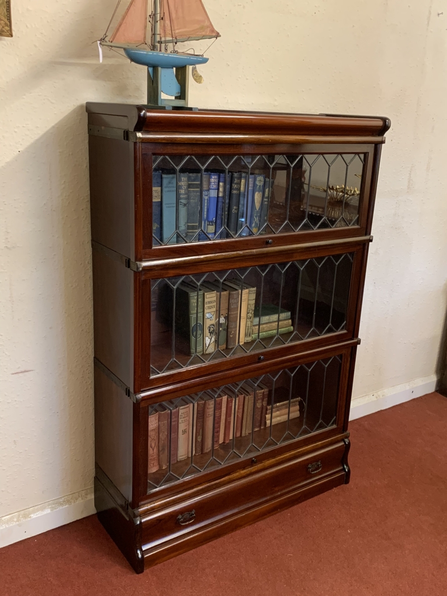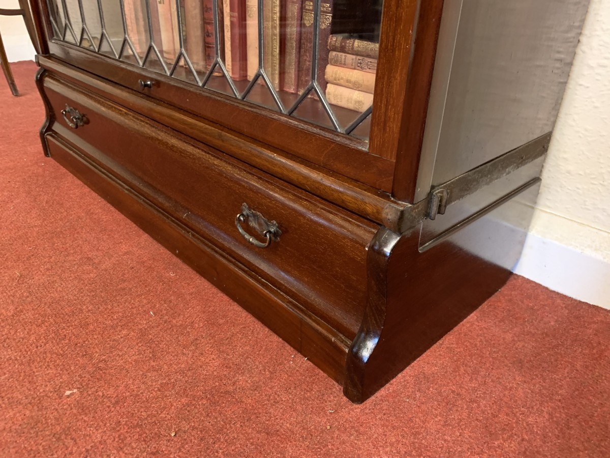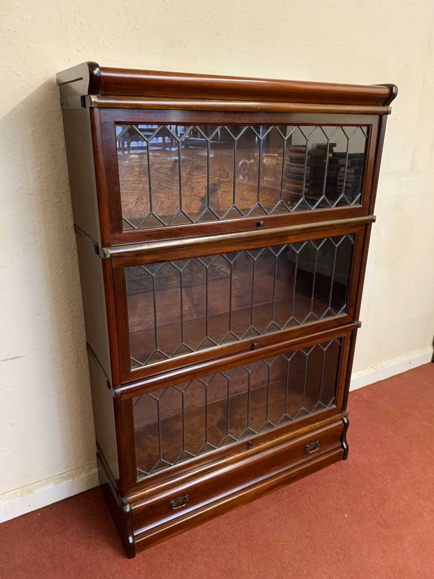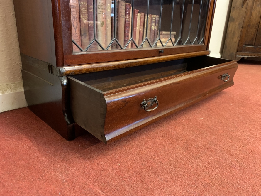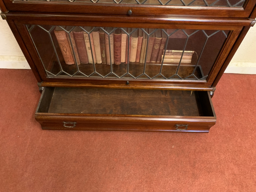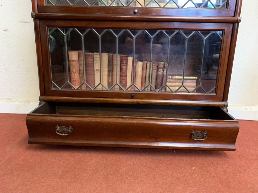 Dating circa 1910 this stylish stacking bookcase is in excellent condition. Having three leaded glass fronted sections with up and over doors with metal side straps. The drawer to the base having a par of drop handles.
