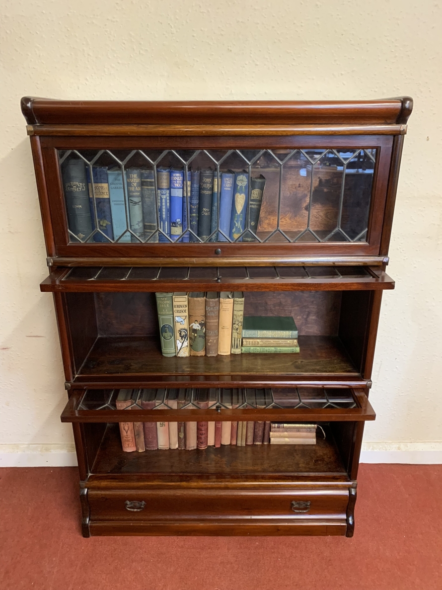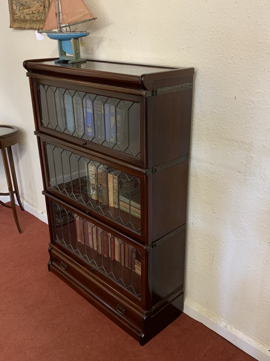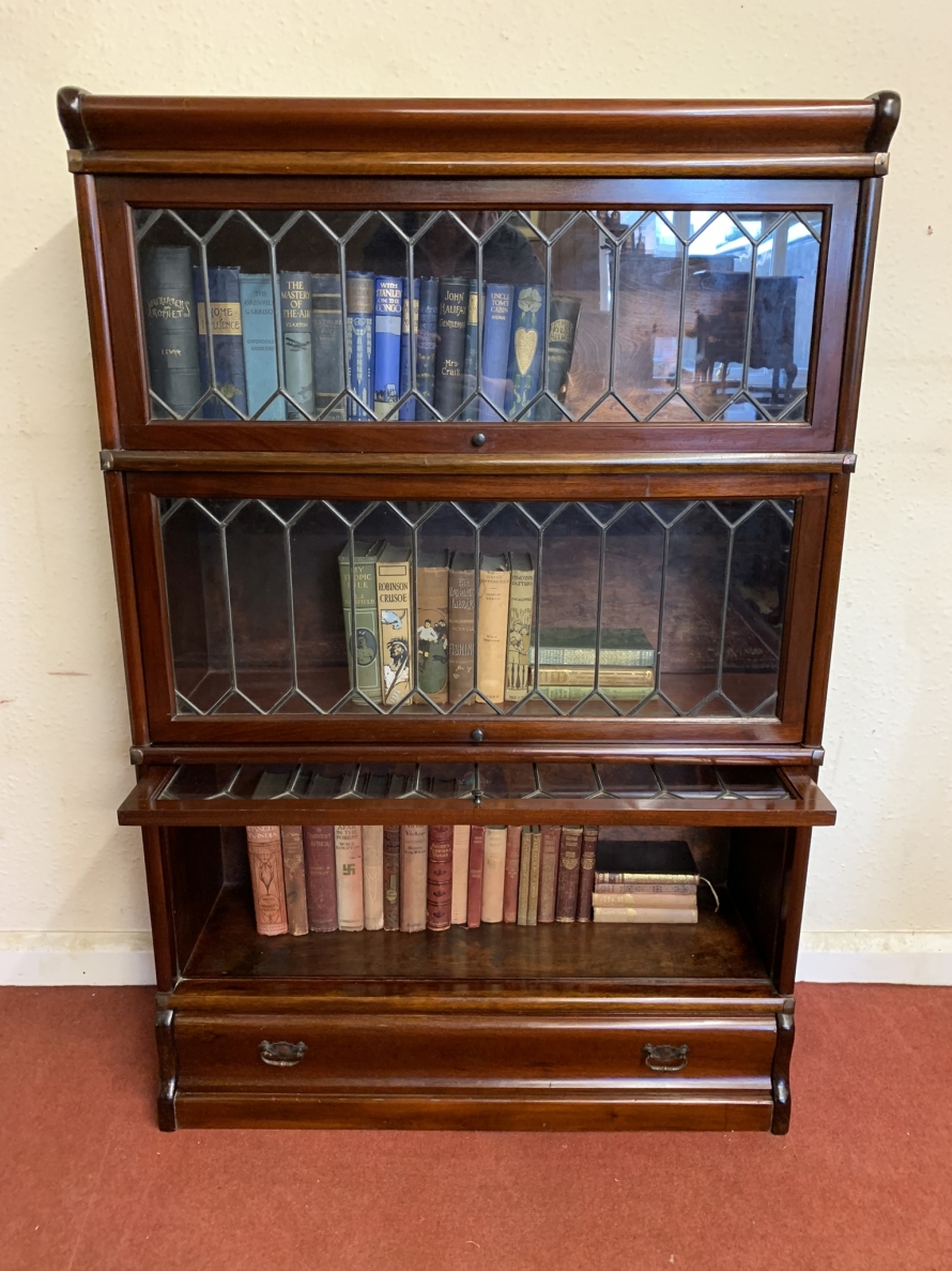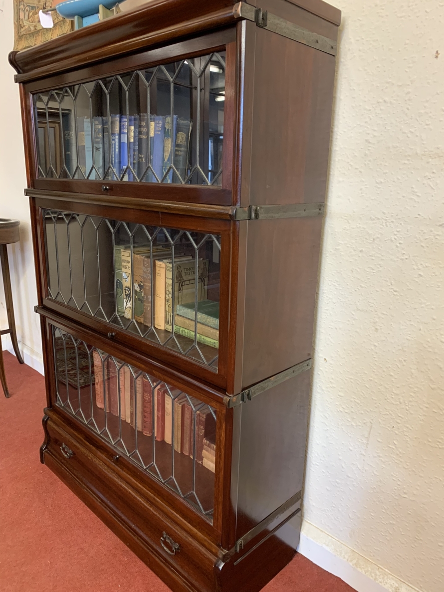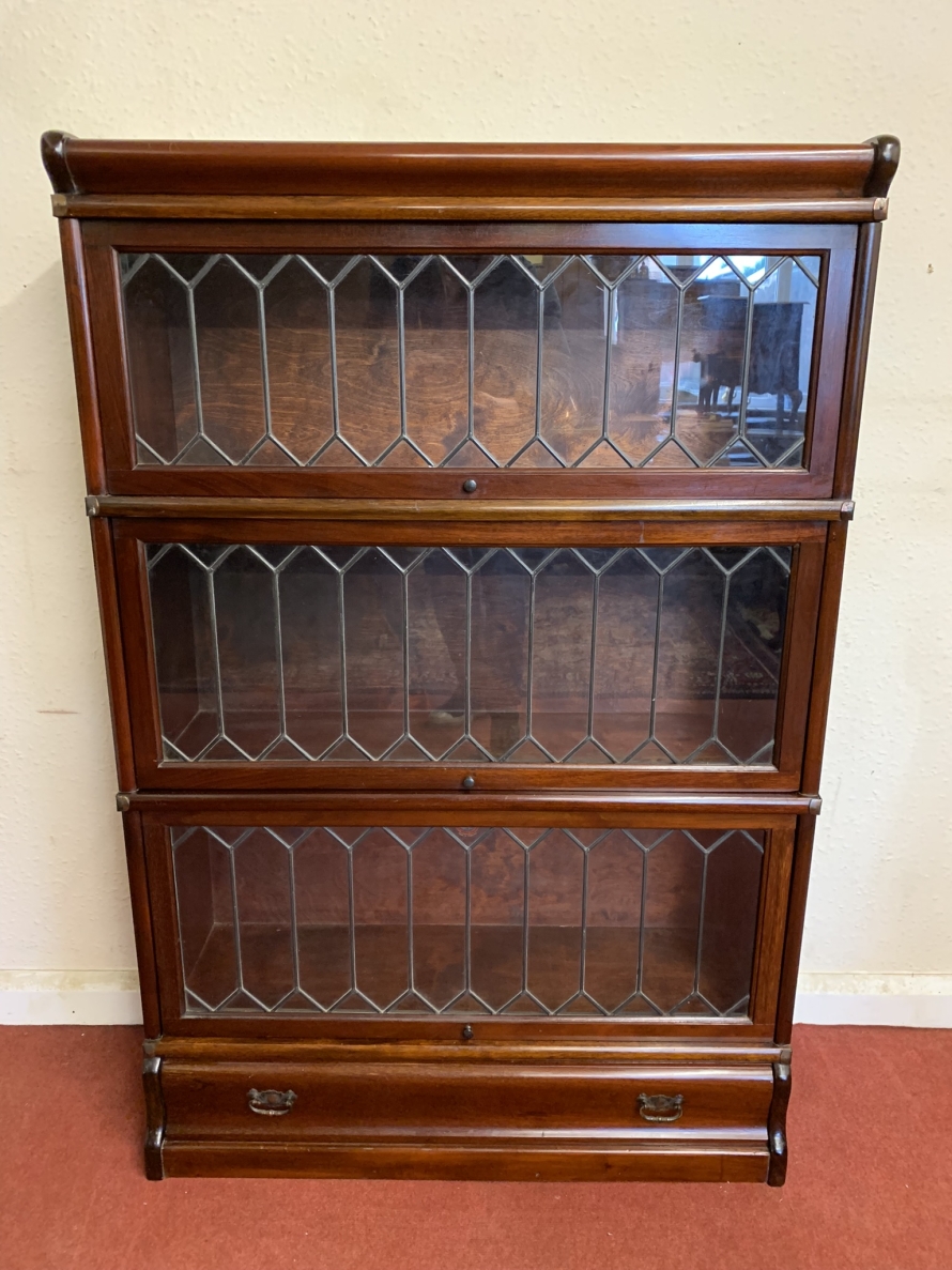 Dating circa 1910 this stylish stacking bookcase is in excellent condition. Having three leaded glass fronted sections with up and over doors with metal side straps. The drawer to the base having a par of drop handles.
