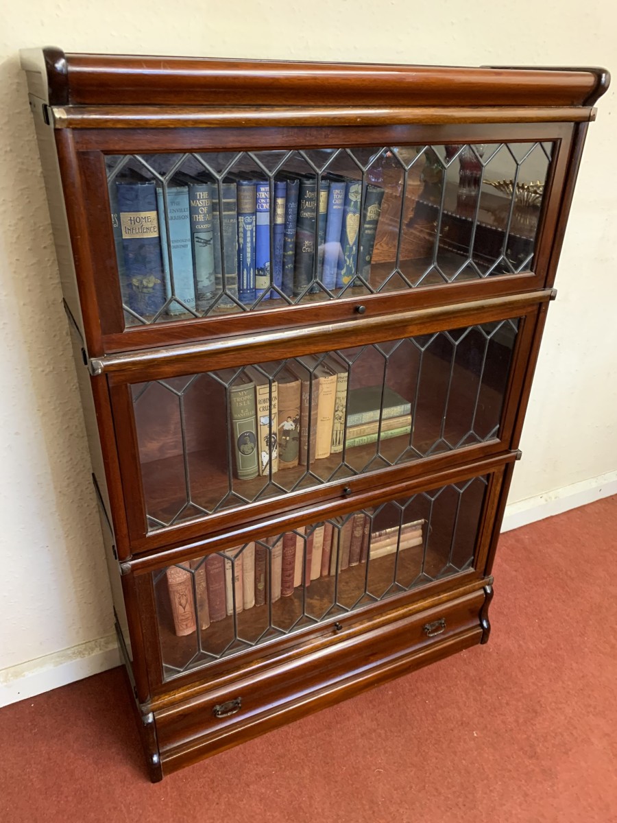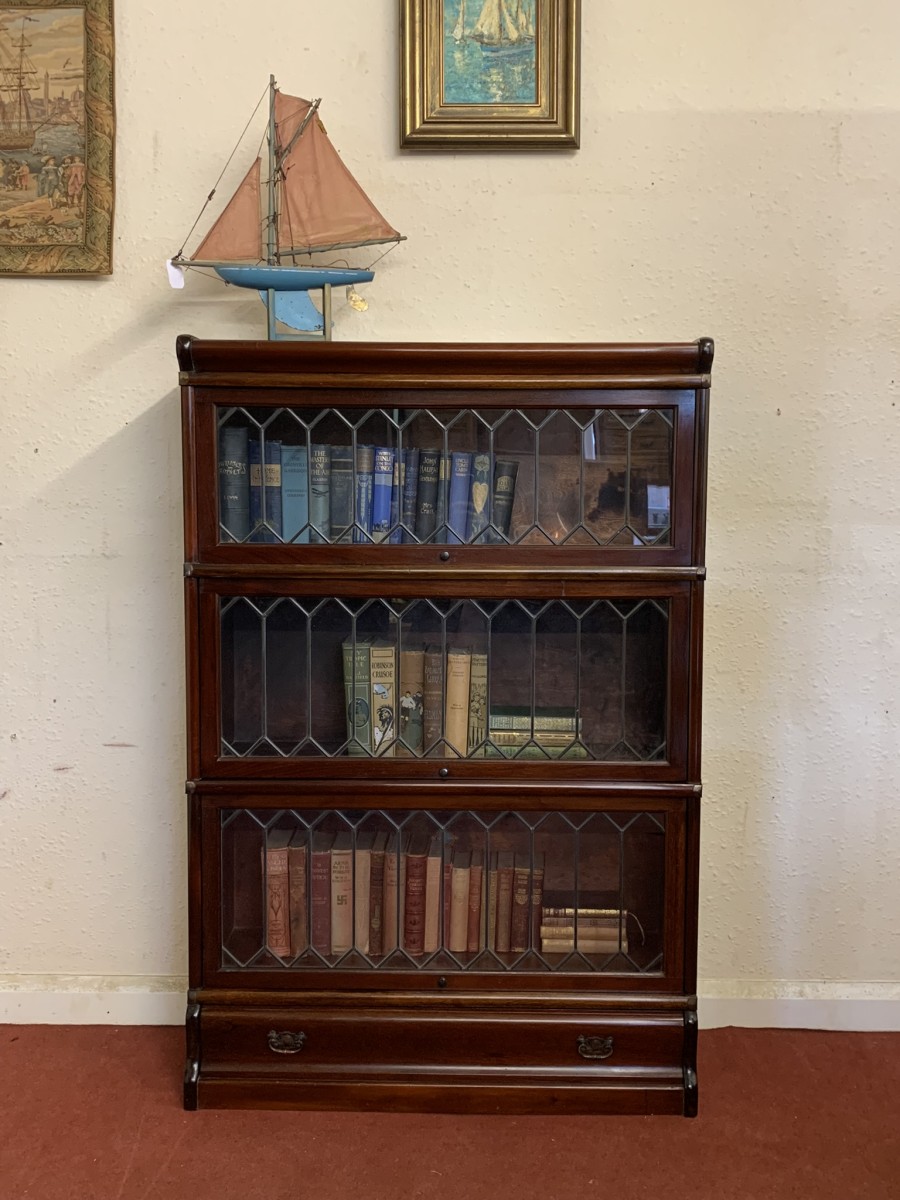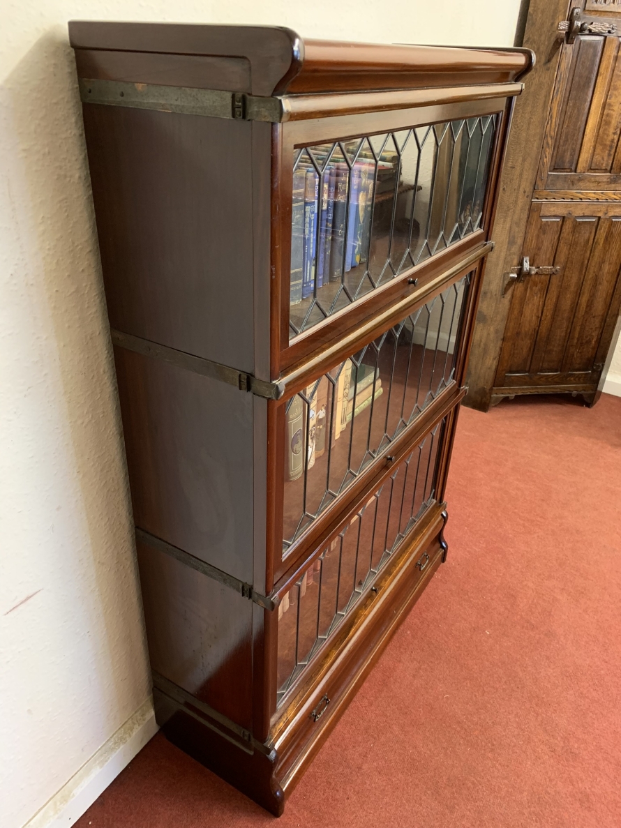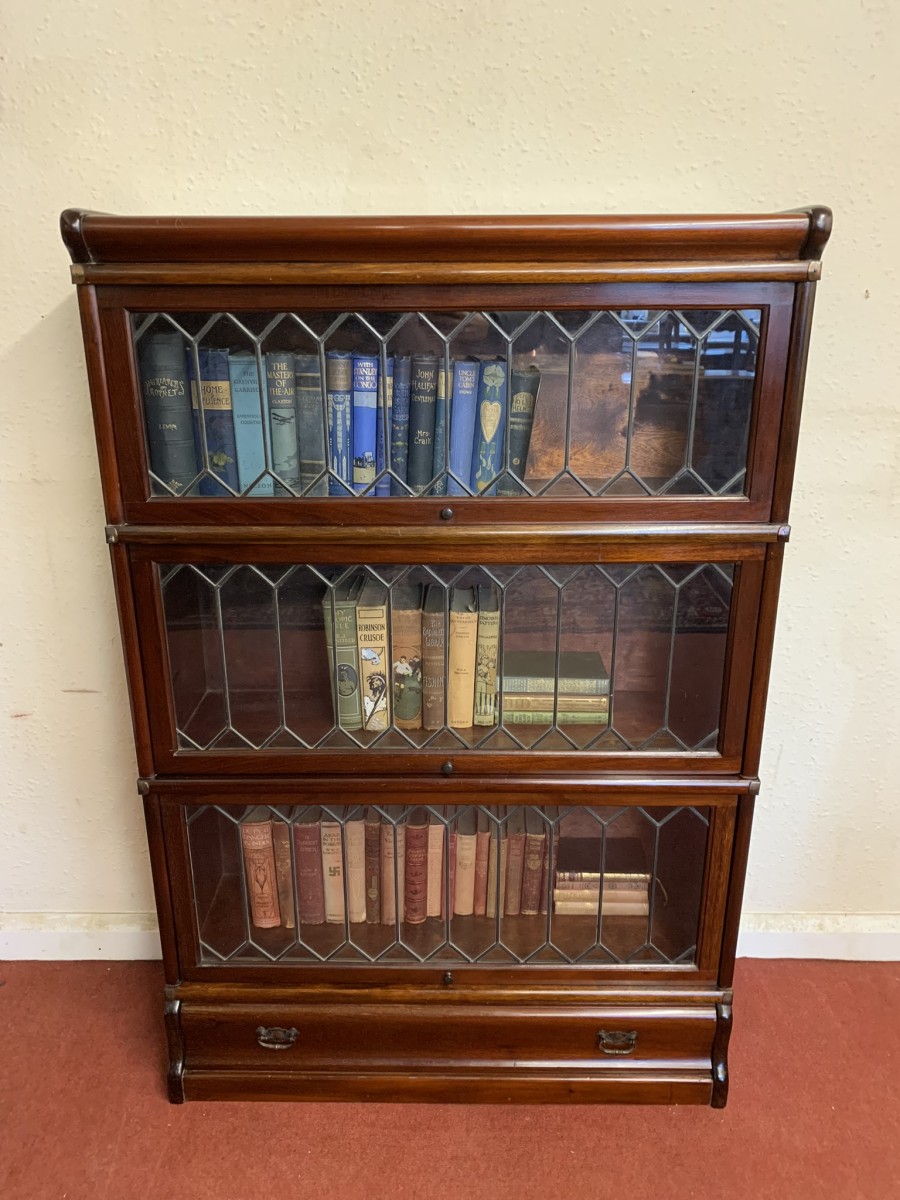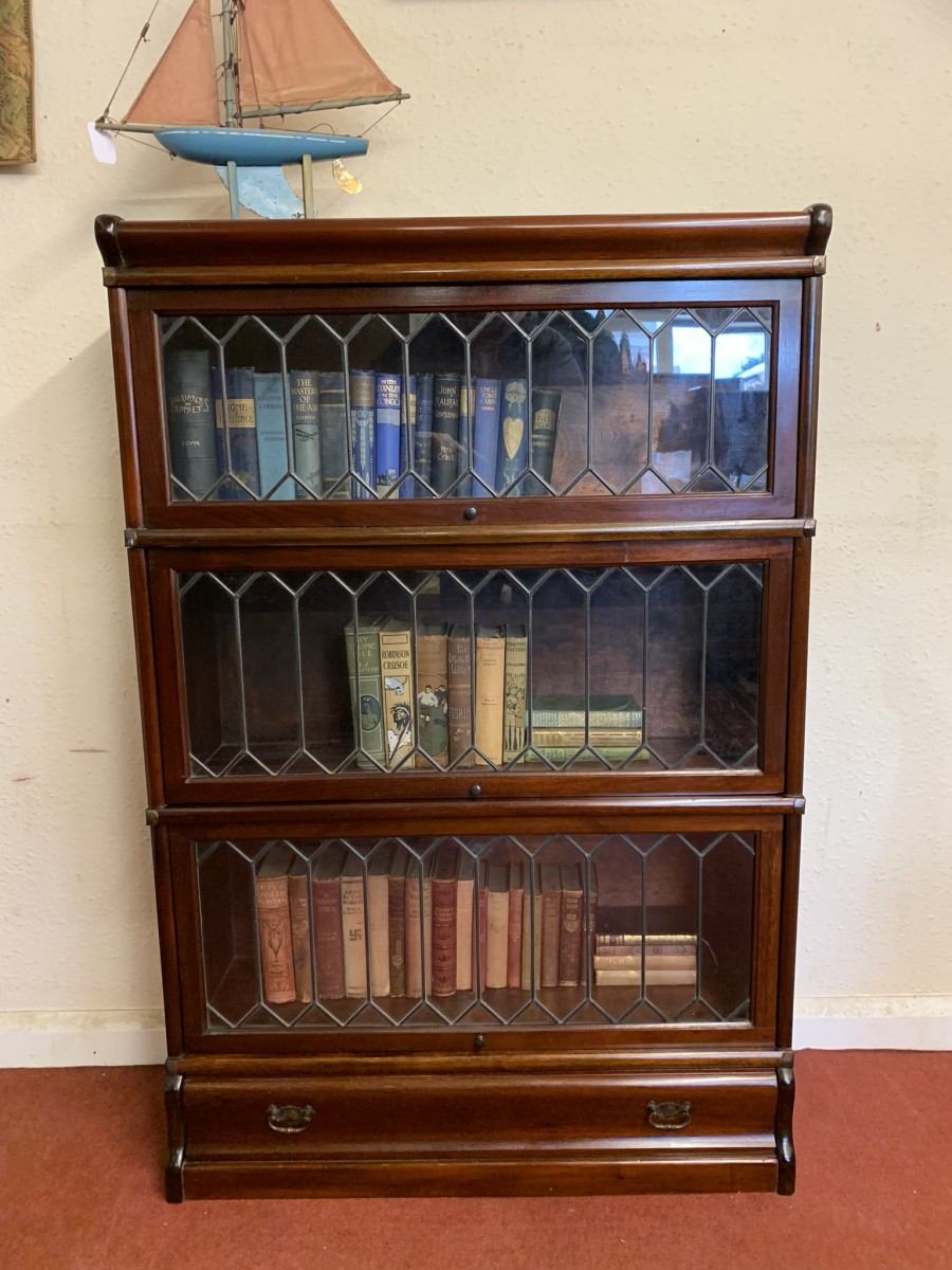 Dating circa 1910 this stylish stacking bookcase is in excellent condition. Having three leaded glass fronted sections with up and over doors with metal side straps. The drawer to the base having a par of drop handles.