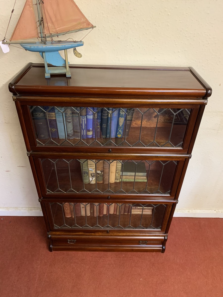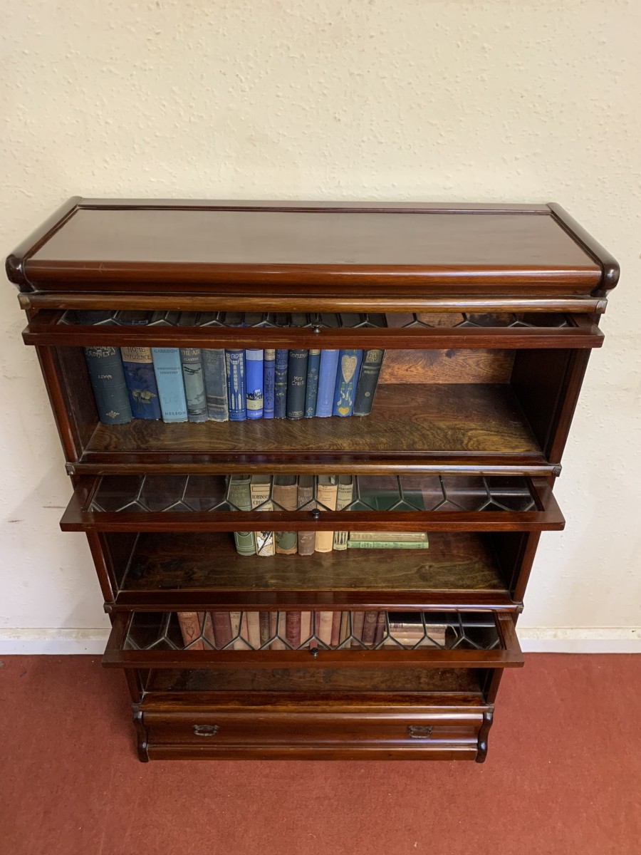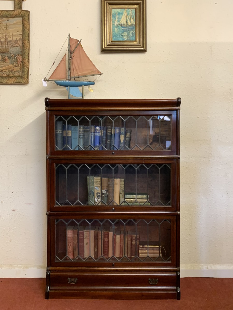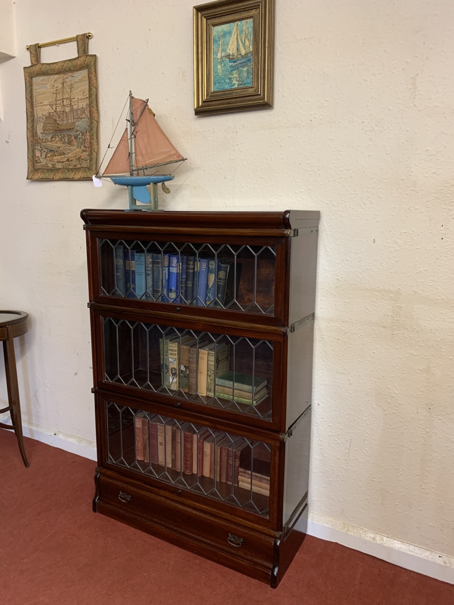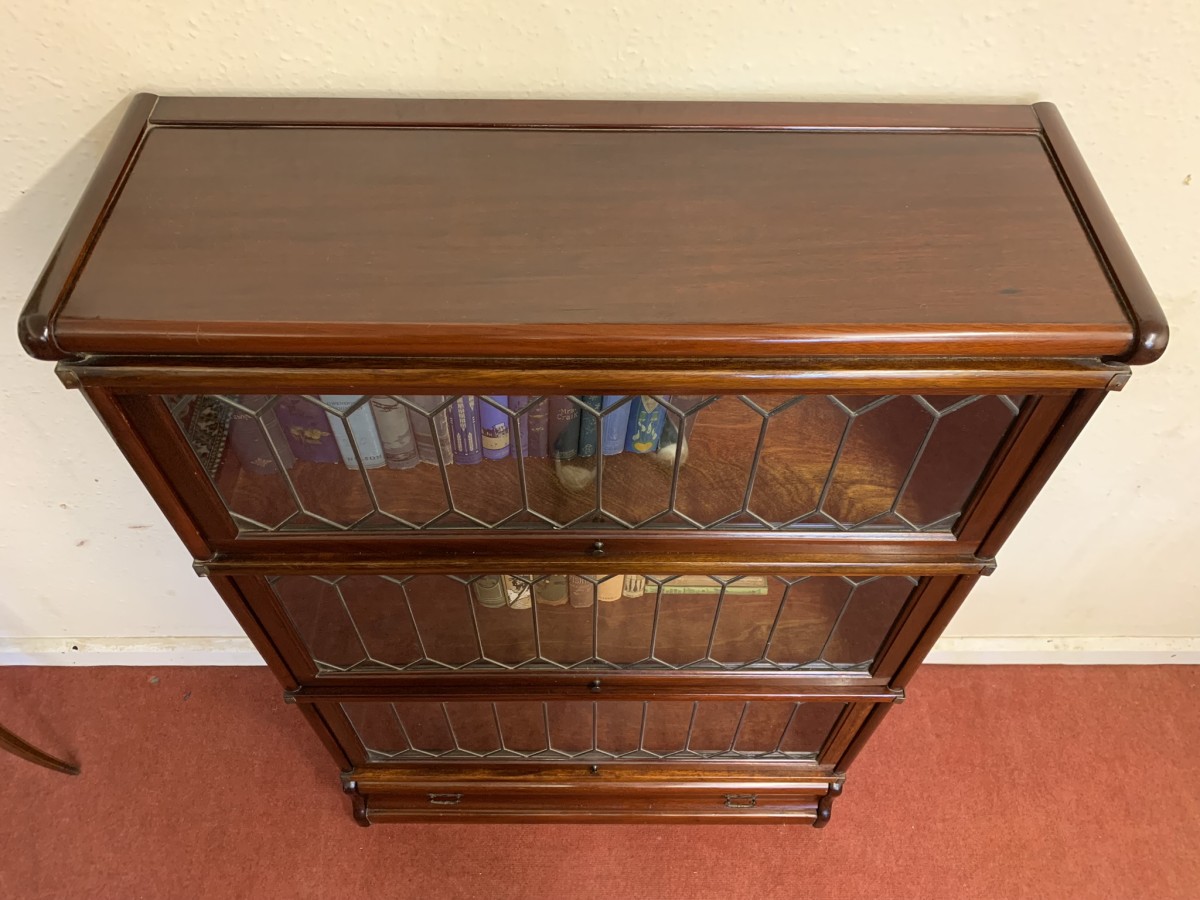 Dating circa 1910 this stylish stacking bookcase is in excellent condition. Having three leaded glass fronted sections with up and over doors with metal side straps. The drawer to the base having a par of drop handles.