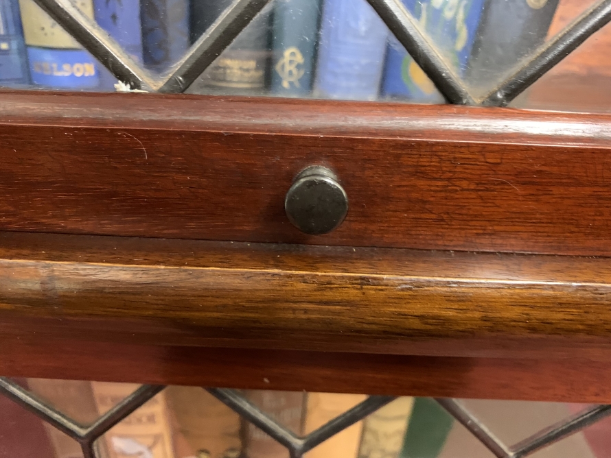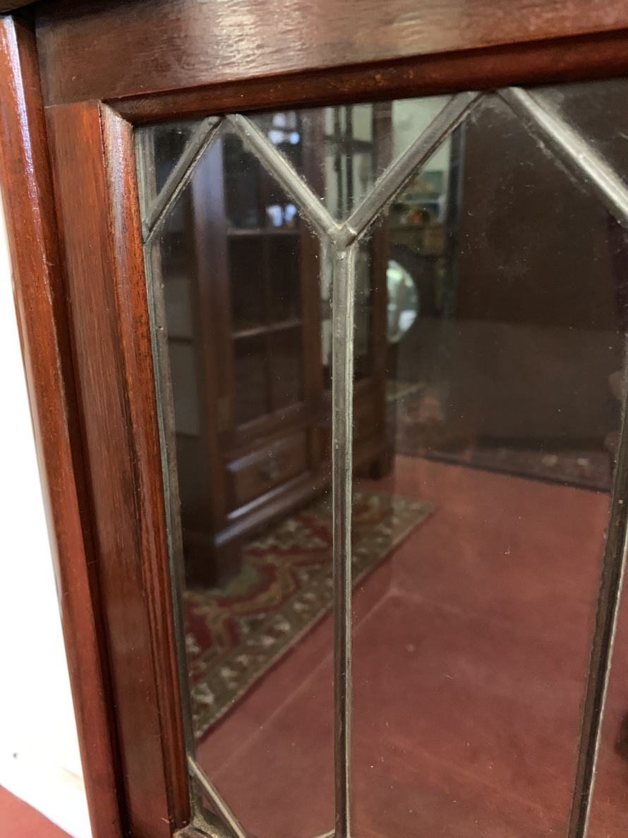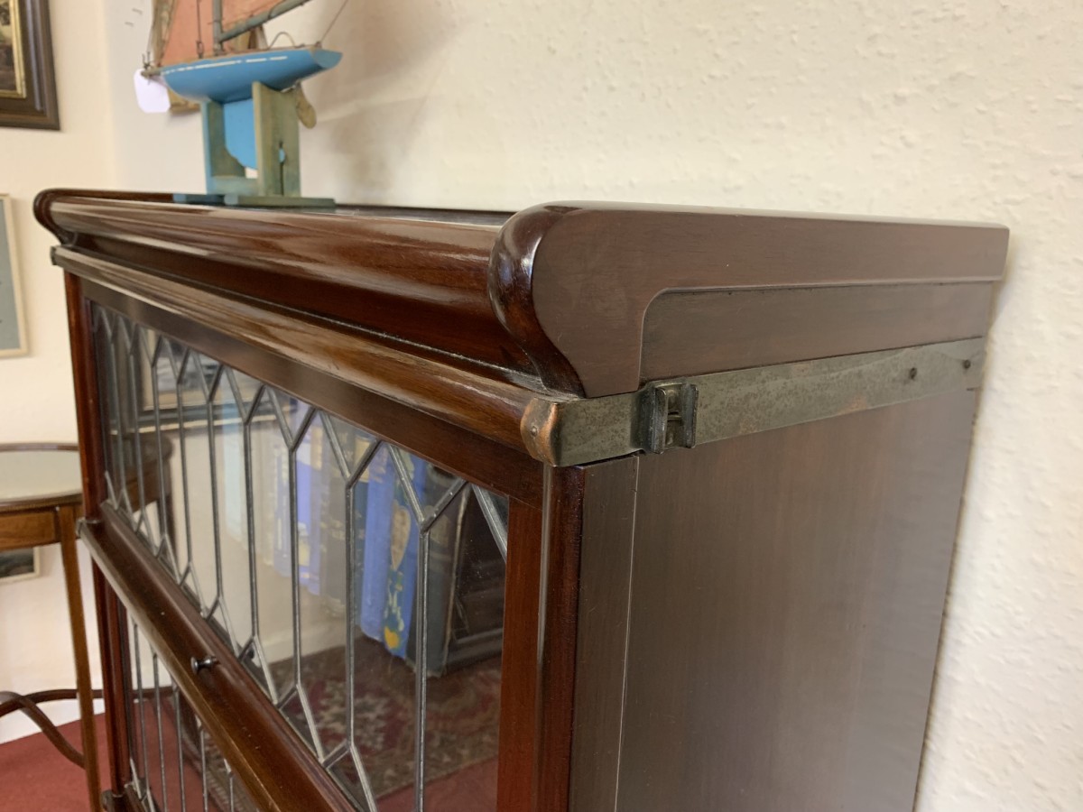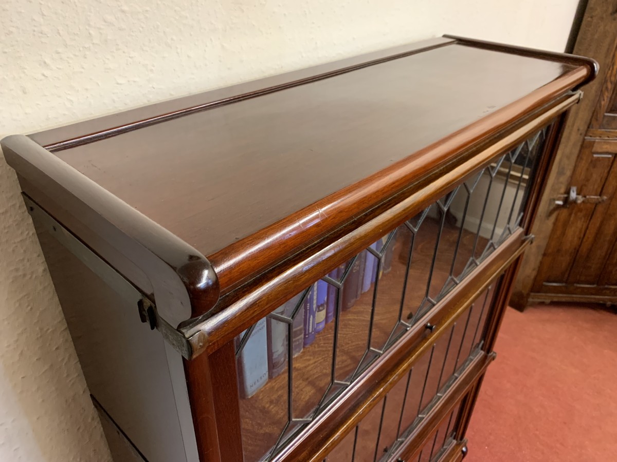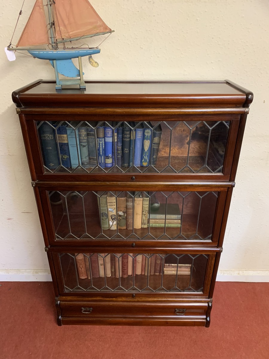 Dating circa 1910 this stylish stacking bookcase is in excellent condition. Having three leaded glass fronted sections with up and over doors with metal side straps. The drawer to the base having a par of drop handles.