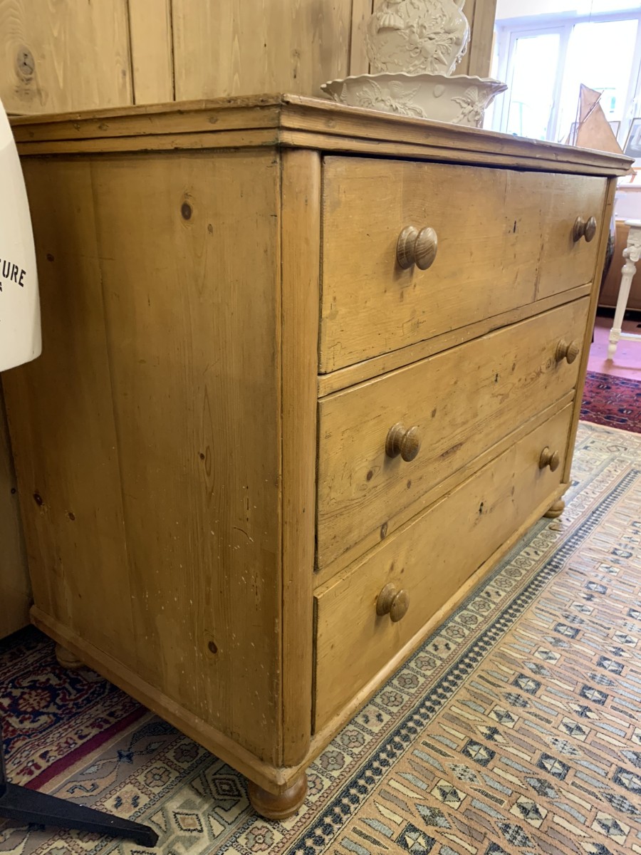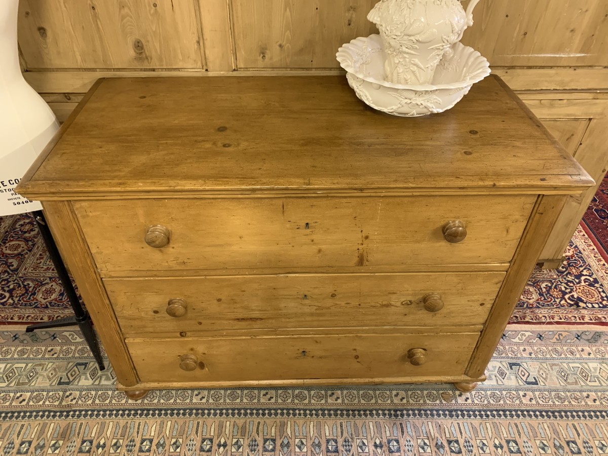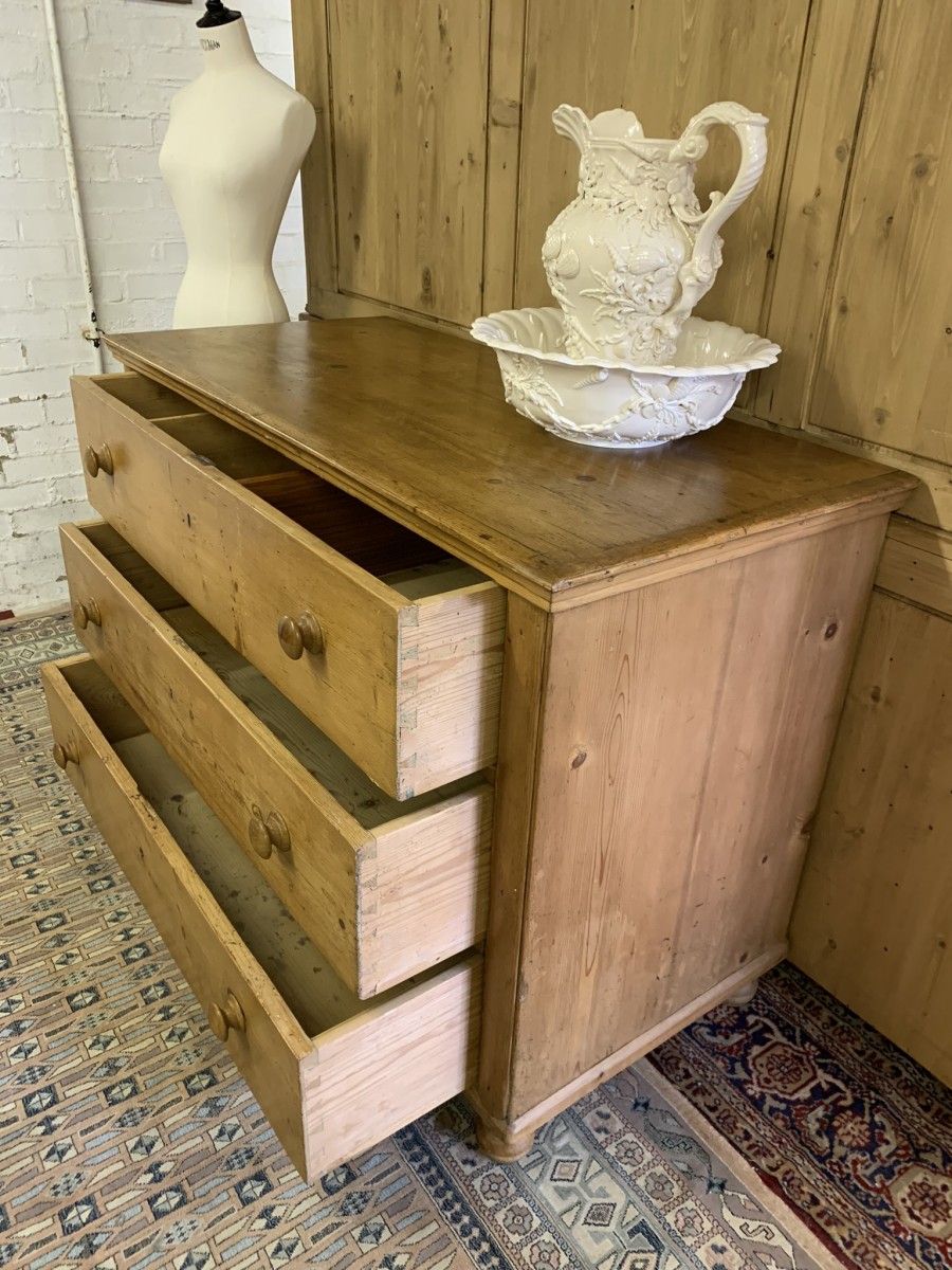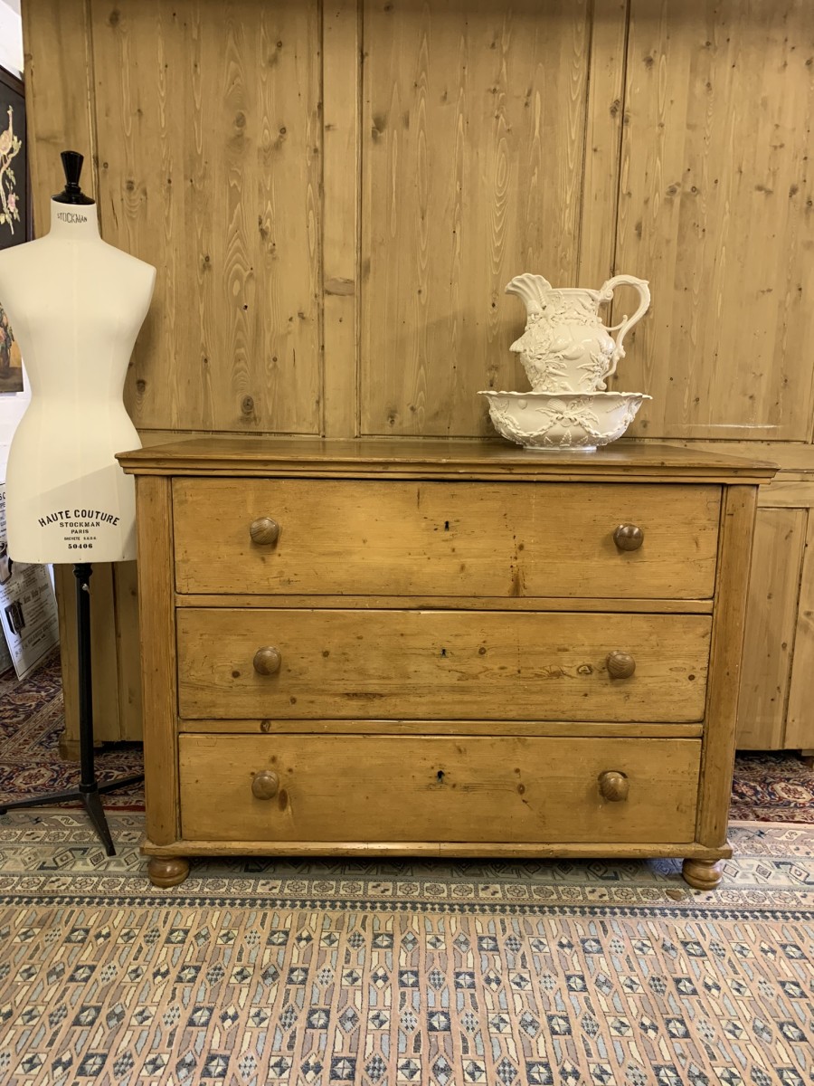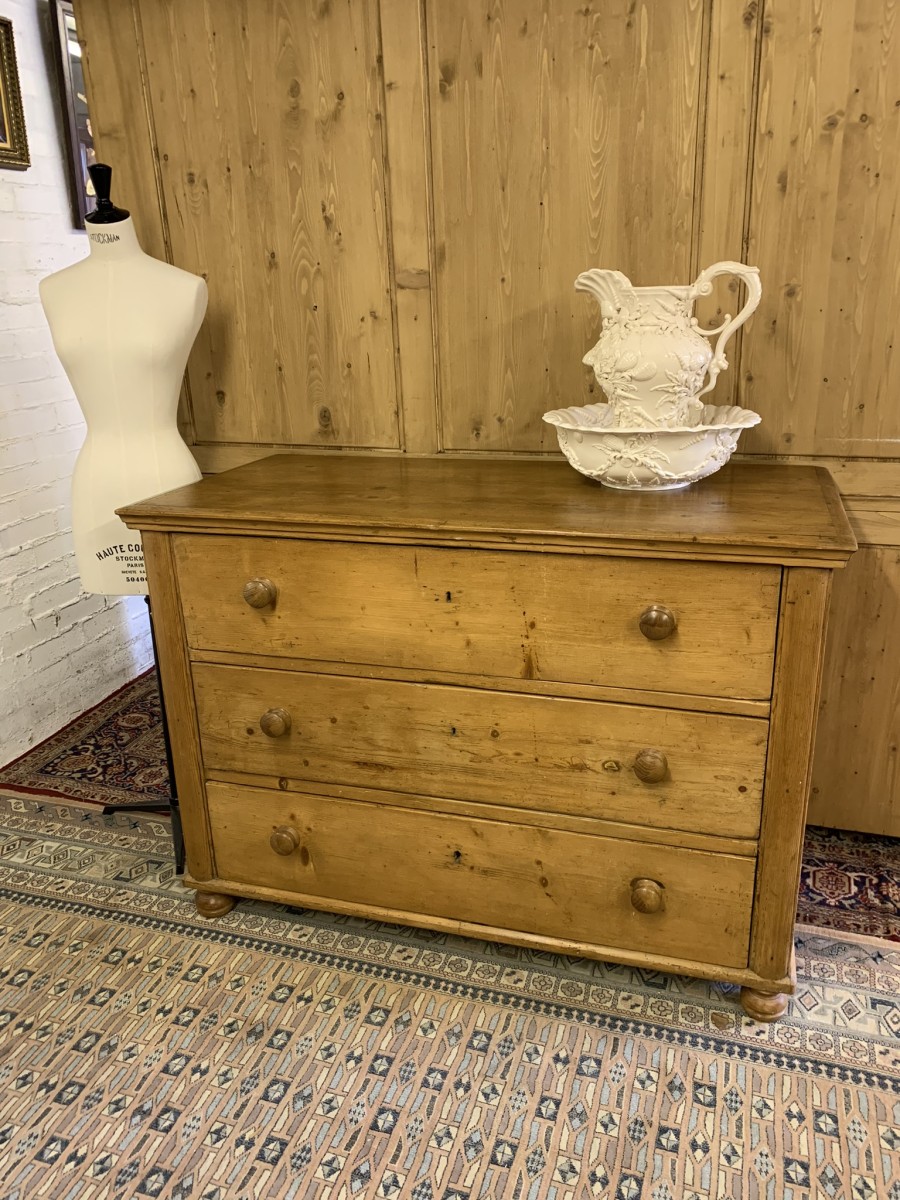 This fantastic chest of drawers dates circa 1900. The chest has three deep drawers, each drawer having a pair of turned handles. The chest stands on four turned feet.