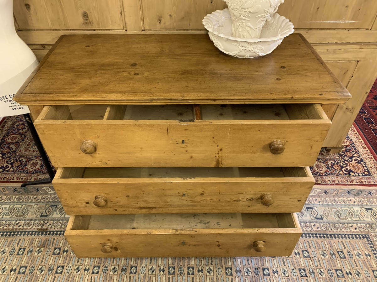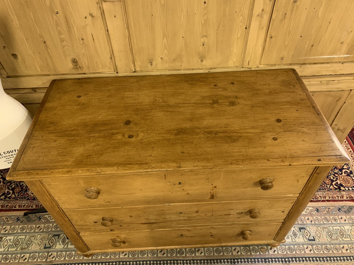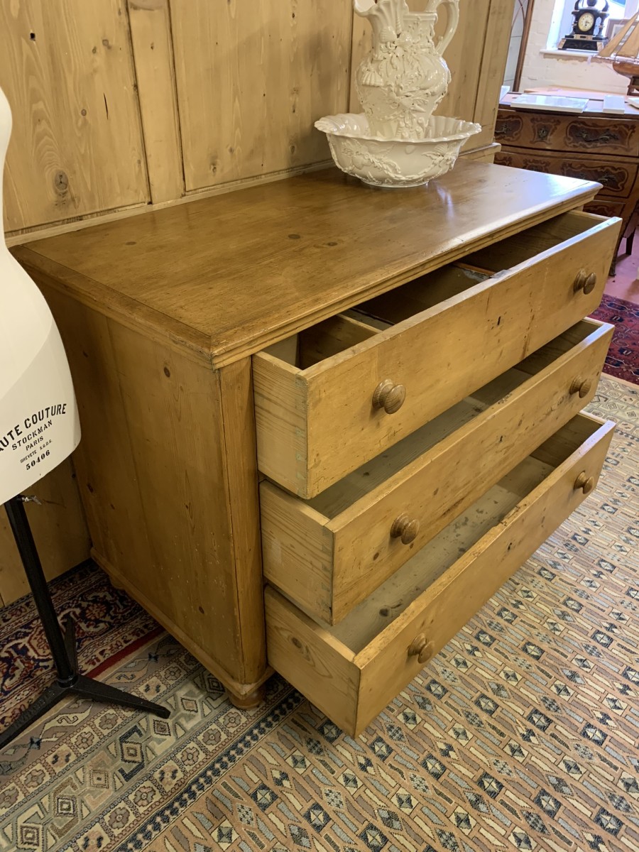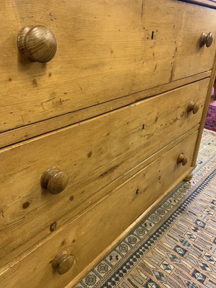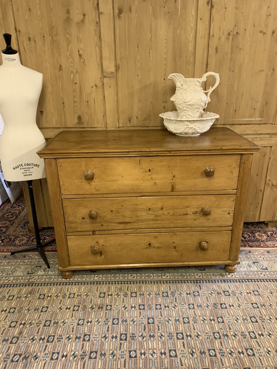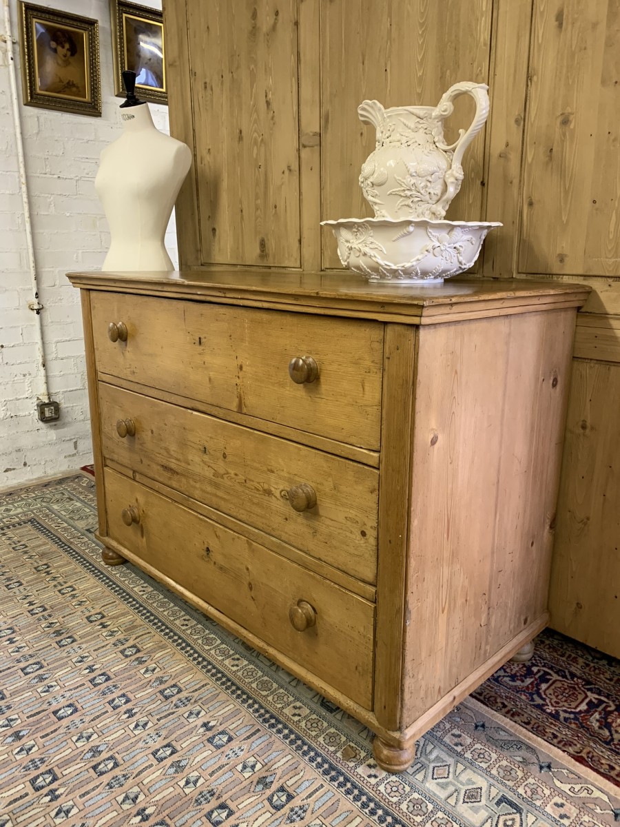This fantastic chest of drawers dates circa 1900. The chest has three deep drawers, each drawer having a pair of turned handles. The chest stands on four turned feet.