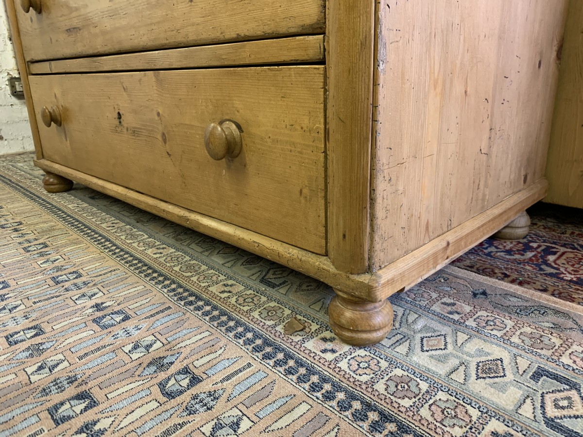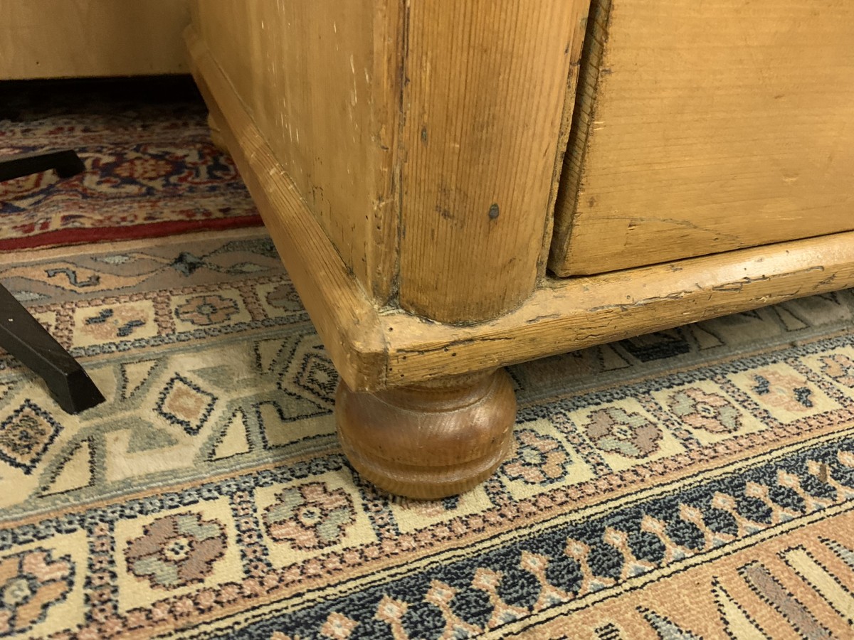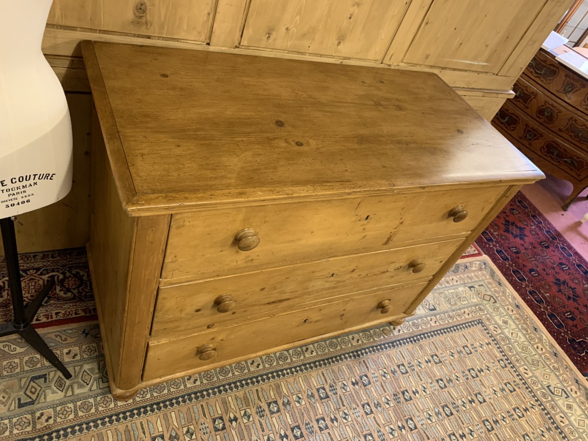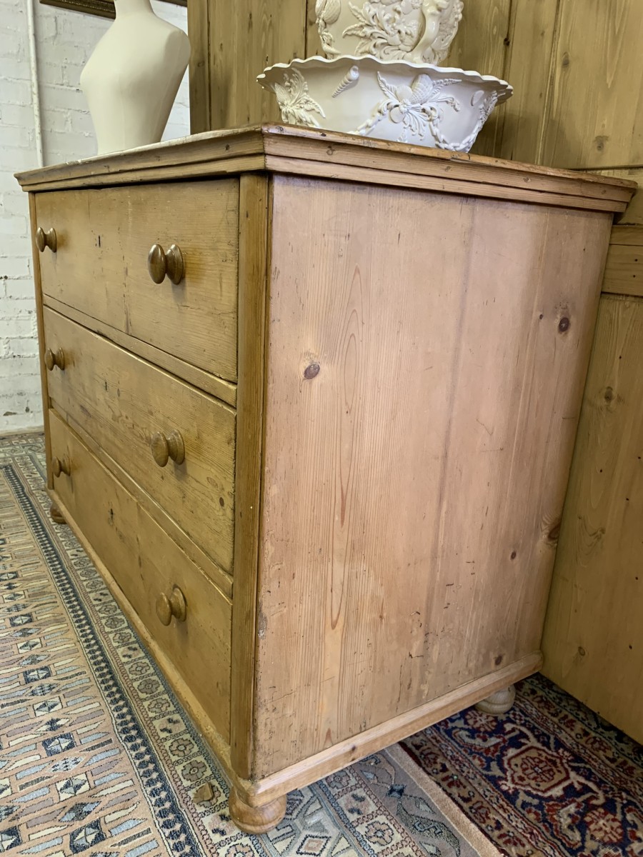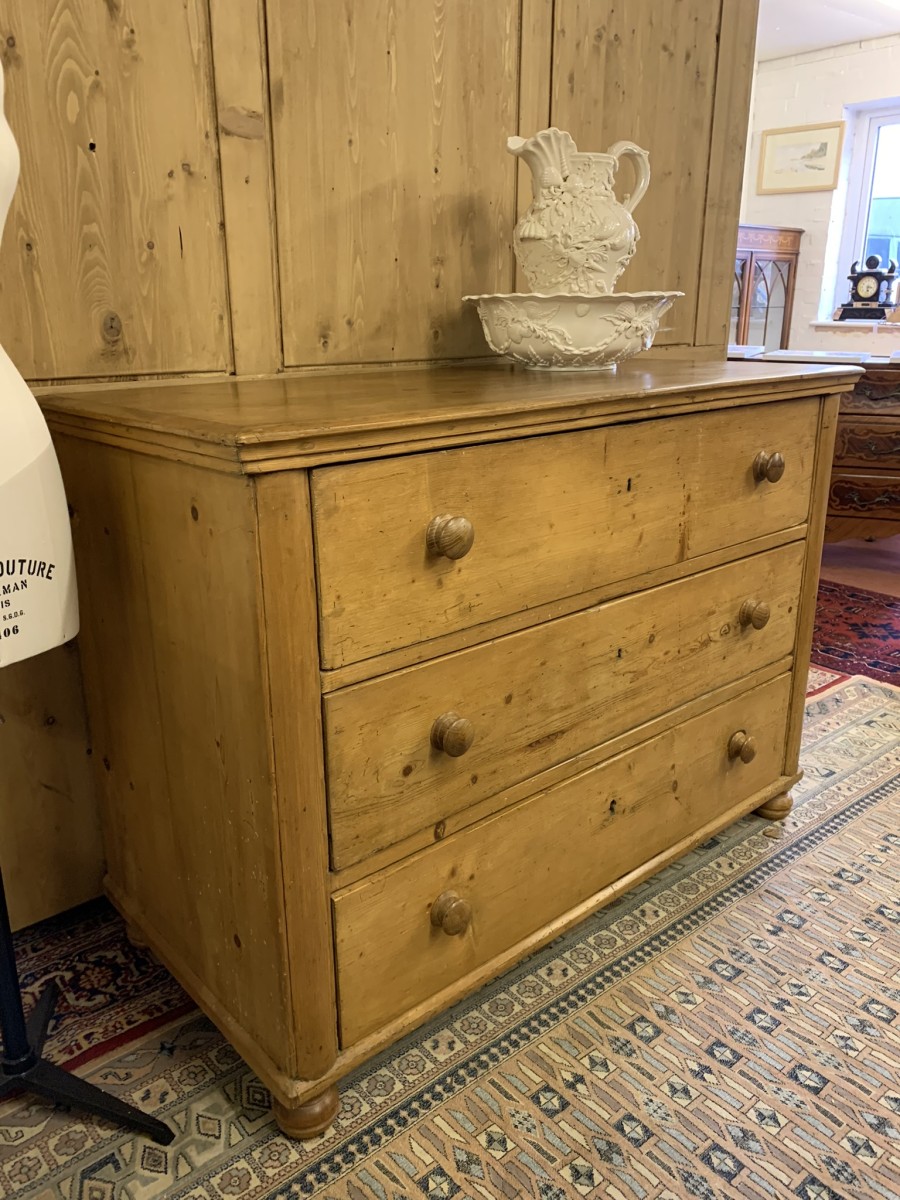 This fantastic chest of drawers dates circa 1900. The chest has three deep drawers, each drawer having a pair of turned handles. The chest stands on four turned feet.