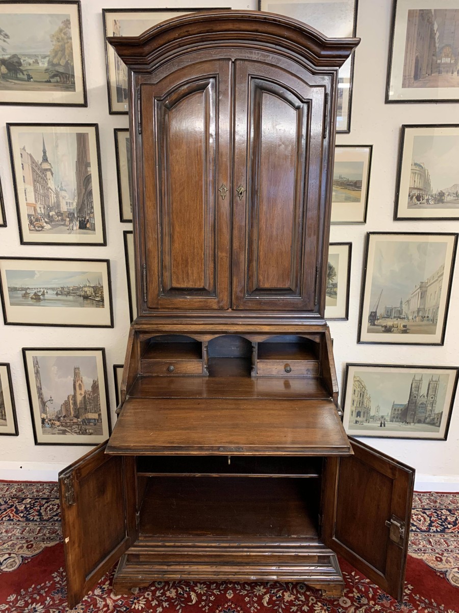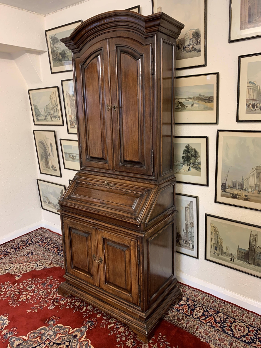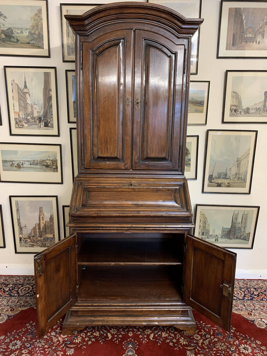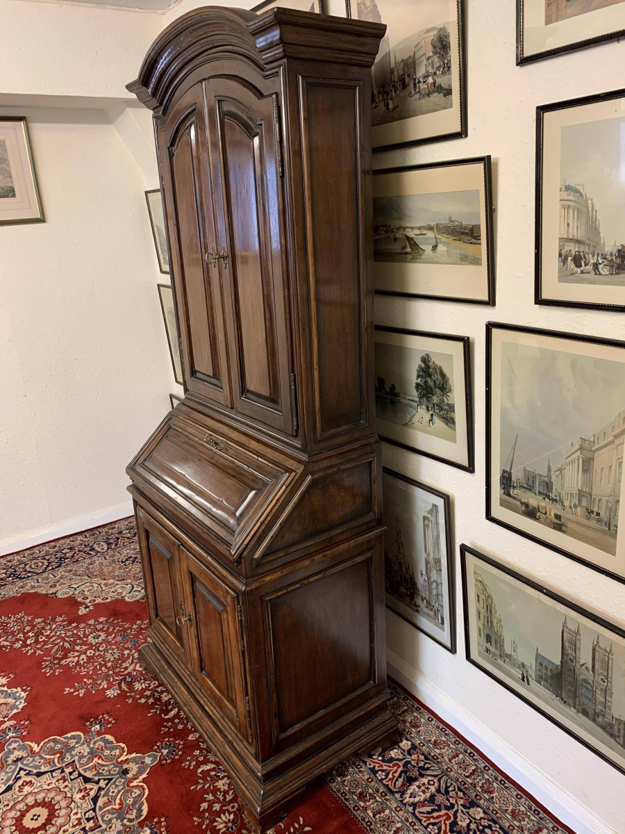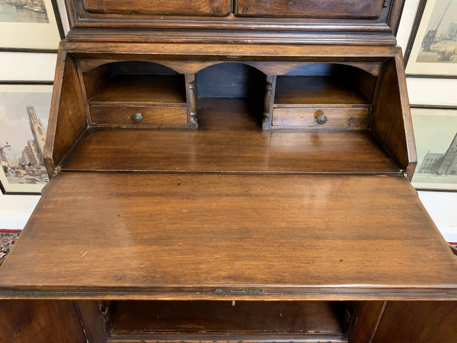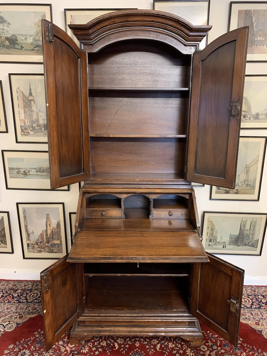 The arched top sits above a pair of lockable panelled doors, each door has brass hinges, escutcheons and key. The doors open to reveal two removable shelves. The lockable fall front opens to reveal two drawers and pigeon holes. There are two lockable cupboard cupboard doors, each door has brass hinges, escutcheon and key. The doors open to reveal a removable shelf. this great bureau/bookcase sits on bracket feet
