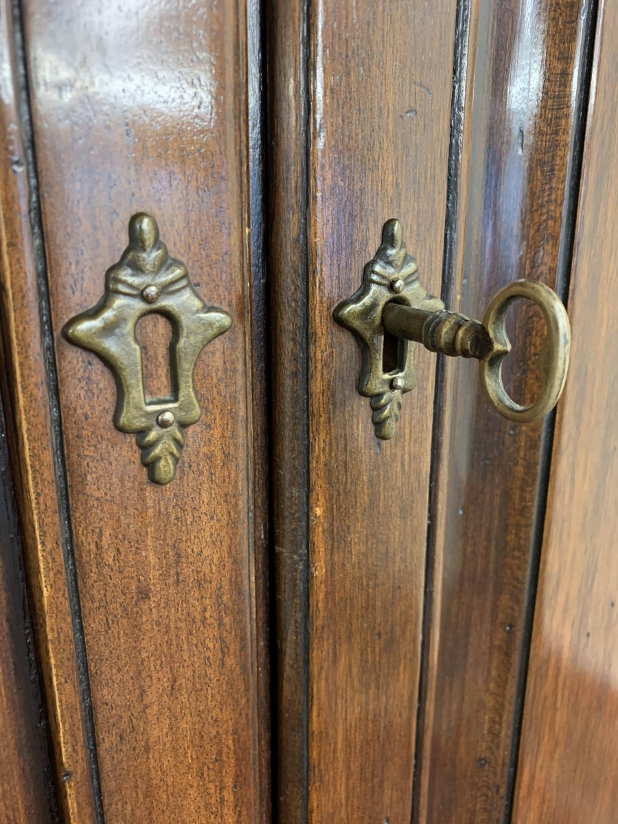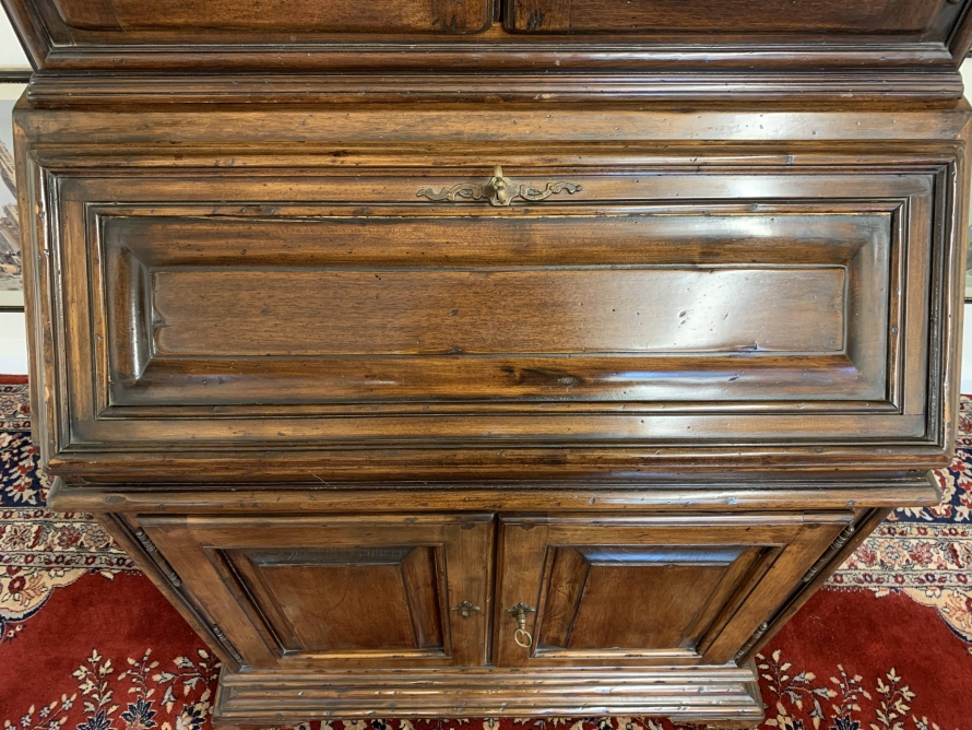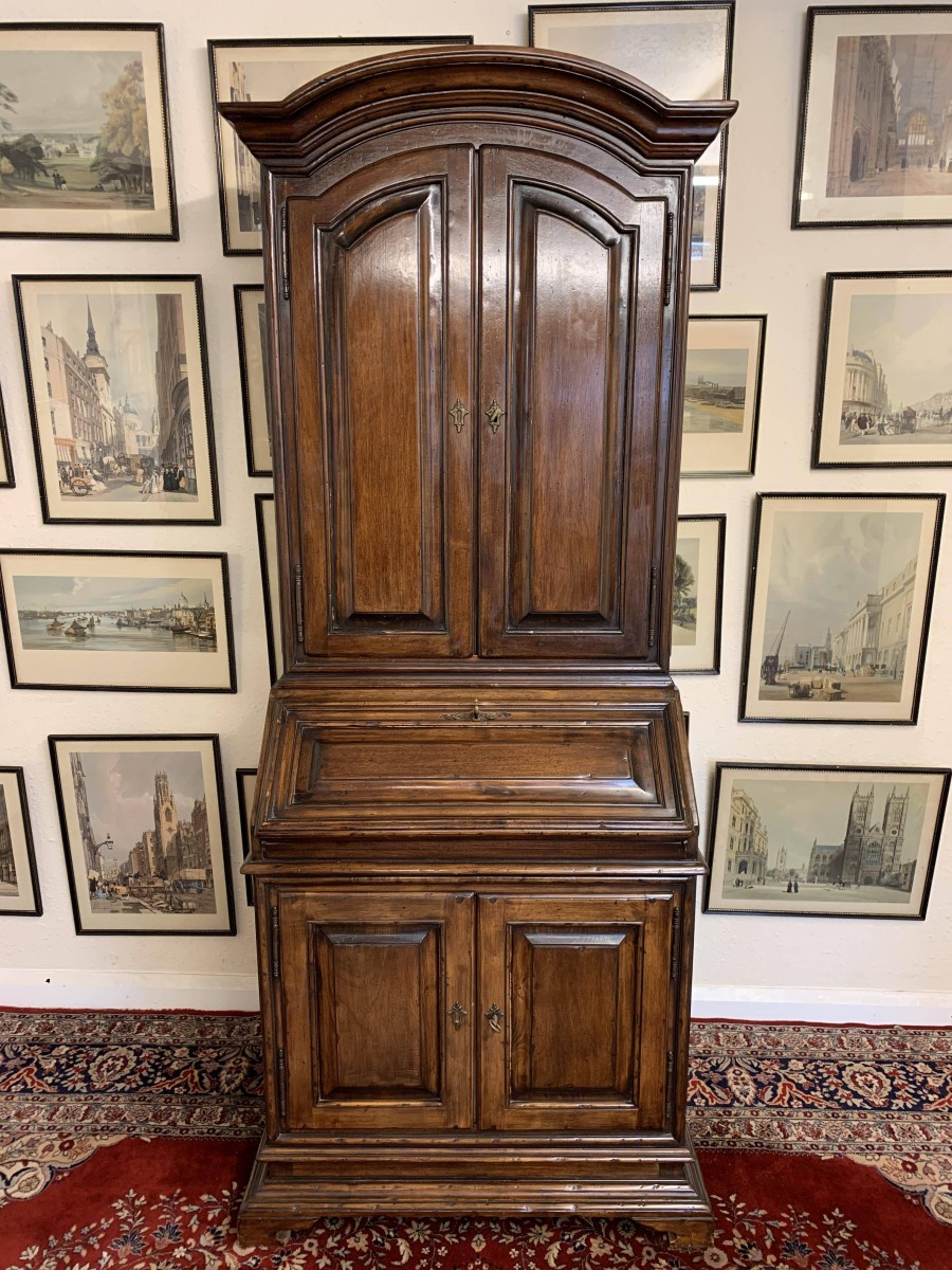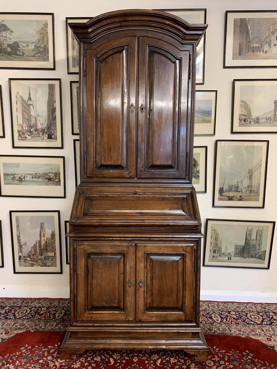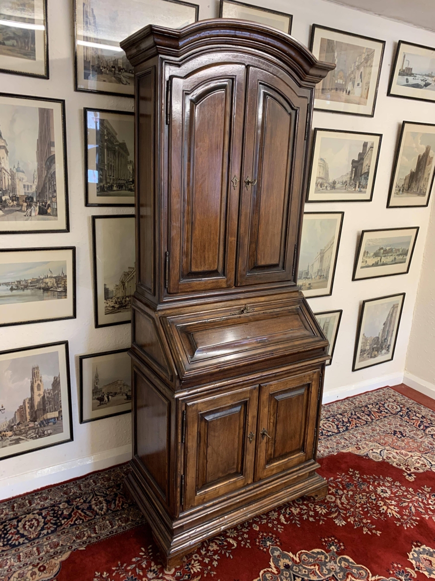 The arched top sits above a pair of lockable panelled doors, each door has brass hinges, escutcheons and key. The doors open to reveal two removable shelves. The lockable fall front opens to reveal two drawers and pigeon holes. There are two lockable cupboard cupboard doors, each door has brass hinges, escutcheon and key. The doors open to reveal a removable shelf. this great bureau/bookcase sits on bracket feet