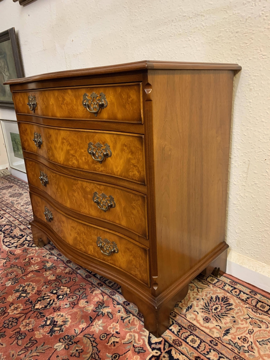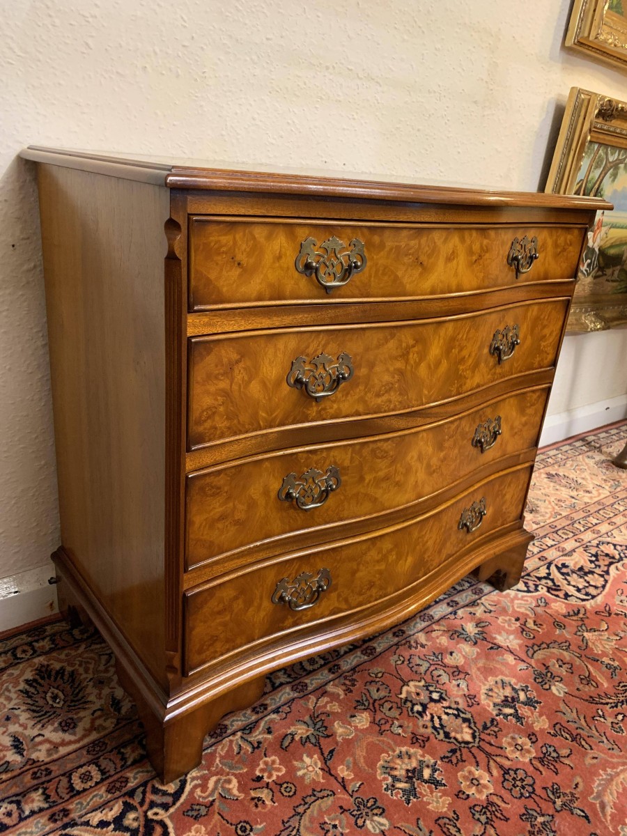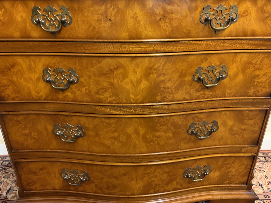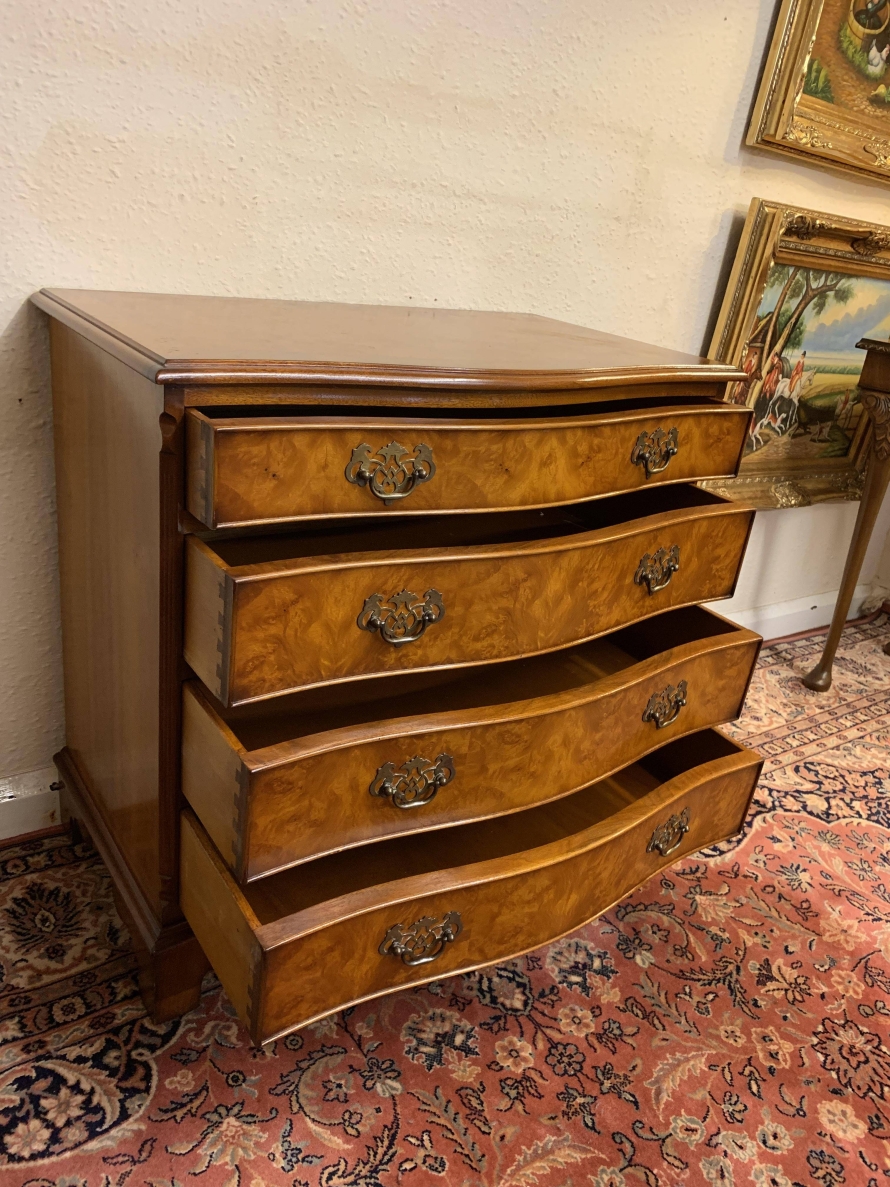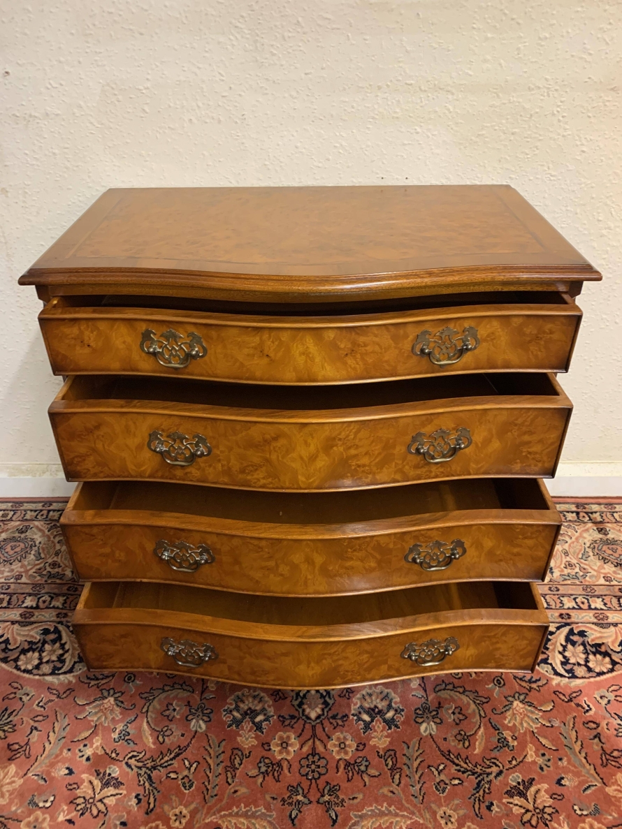 This chest is made in striking burr walnut. The shaped oversailing top has a crossbanded edging with herring bone decoration. Below are four serpentine shaped drawers, each drawer having a pair of brass handles. Carved decoration to the front edging this fabulous quality chest of drawers stands on four bracket feet. Please note the chest is in excellent condition.