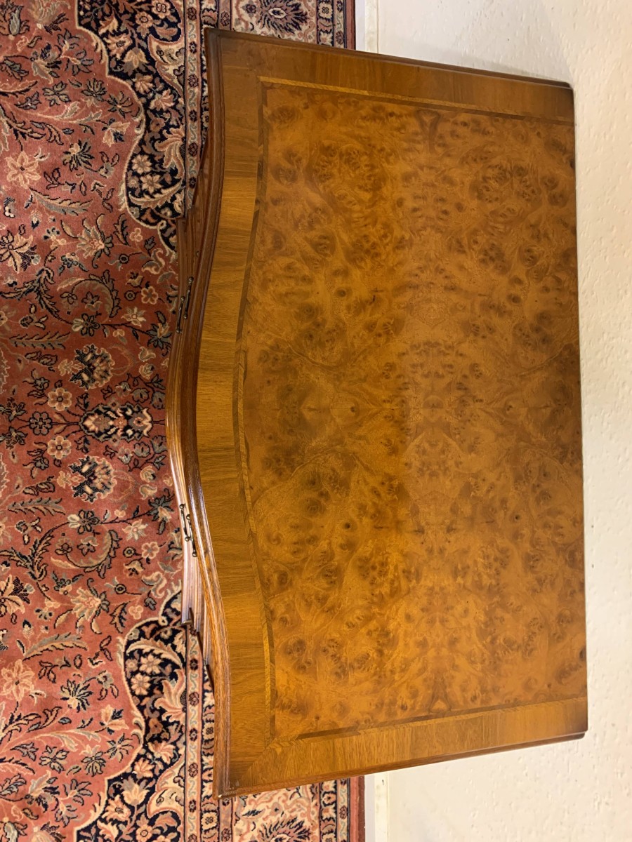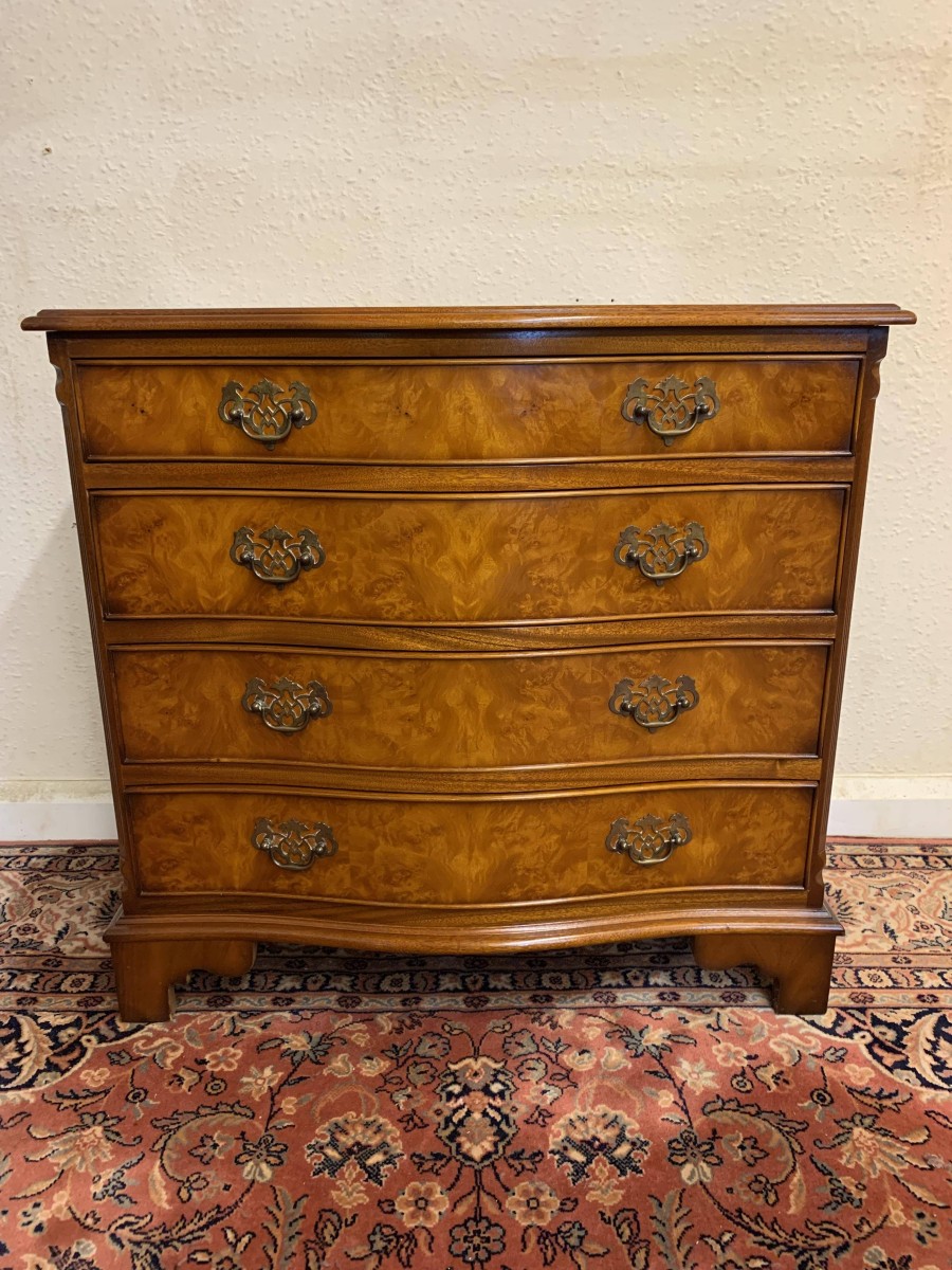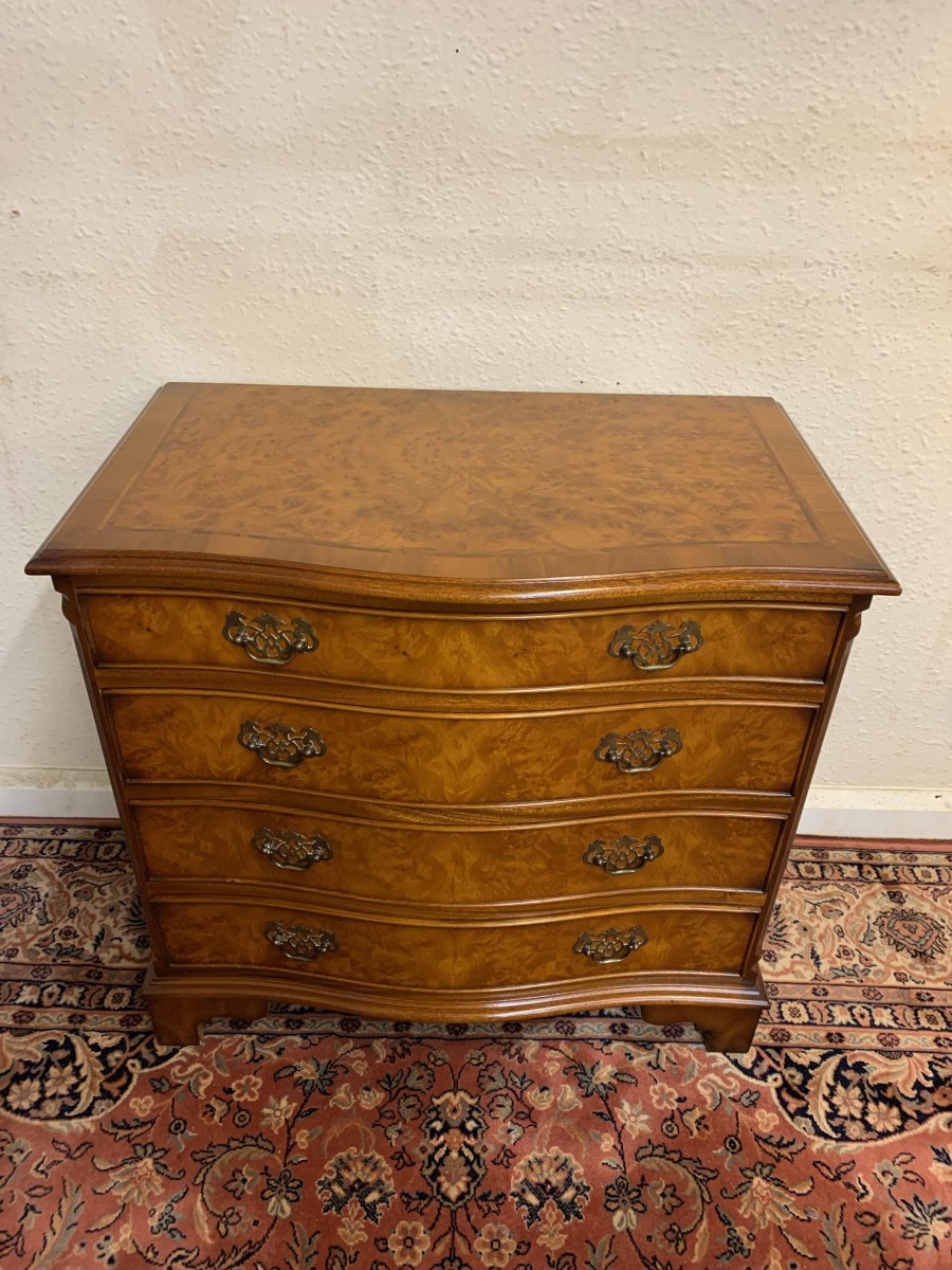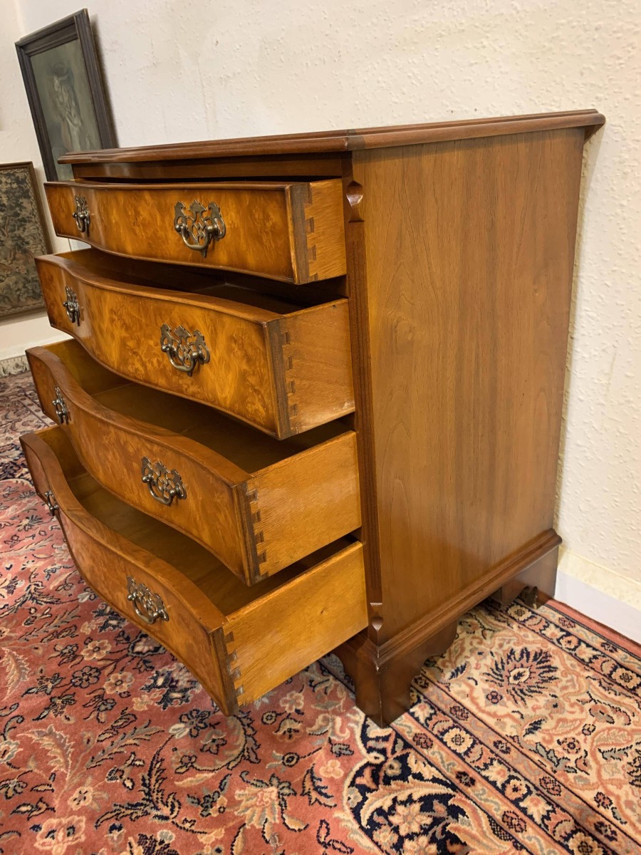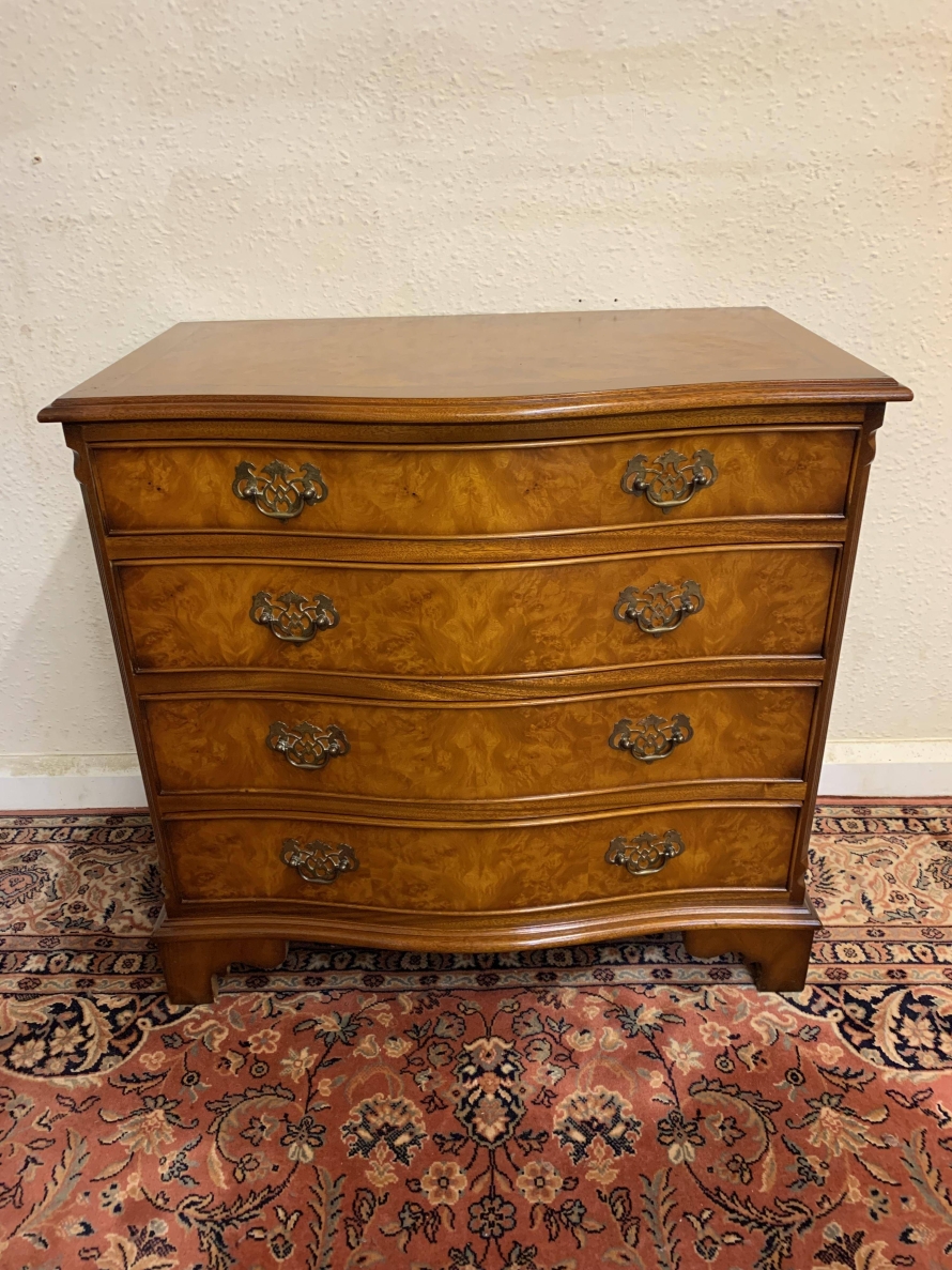 This chest is made in striking burr walnut. The shaped oversailing top has a crossbanded edging with herring bone decoration. Below are four serpentine shaped drawers, each drawer having a pair of brass handles. Carved decoration to the front edging this fabulous quality chest of drawers stands on four bracket feet. Please note the chest is in excellent condition.