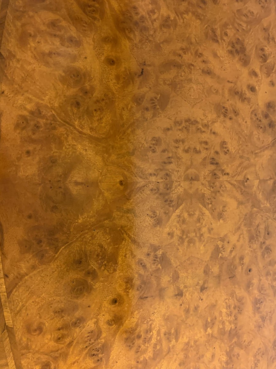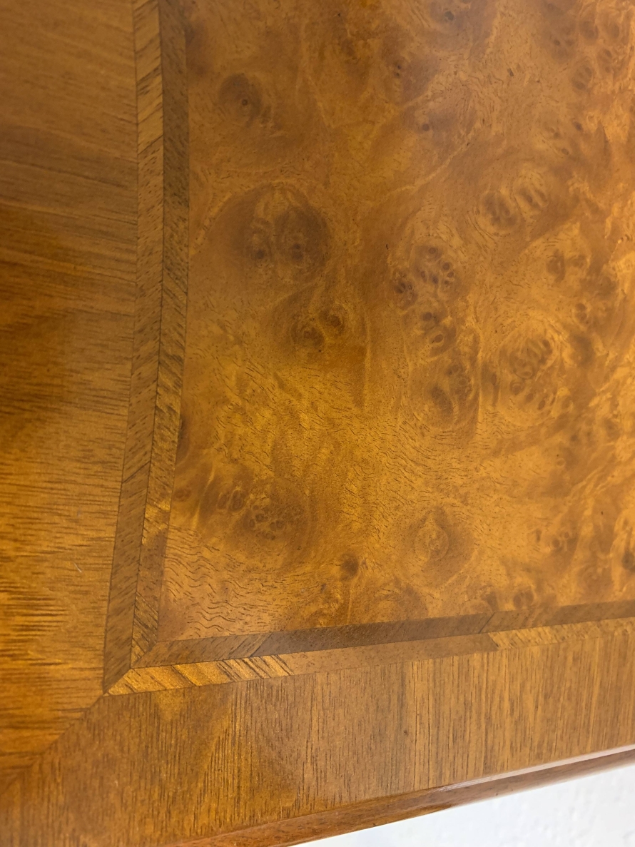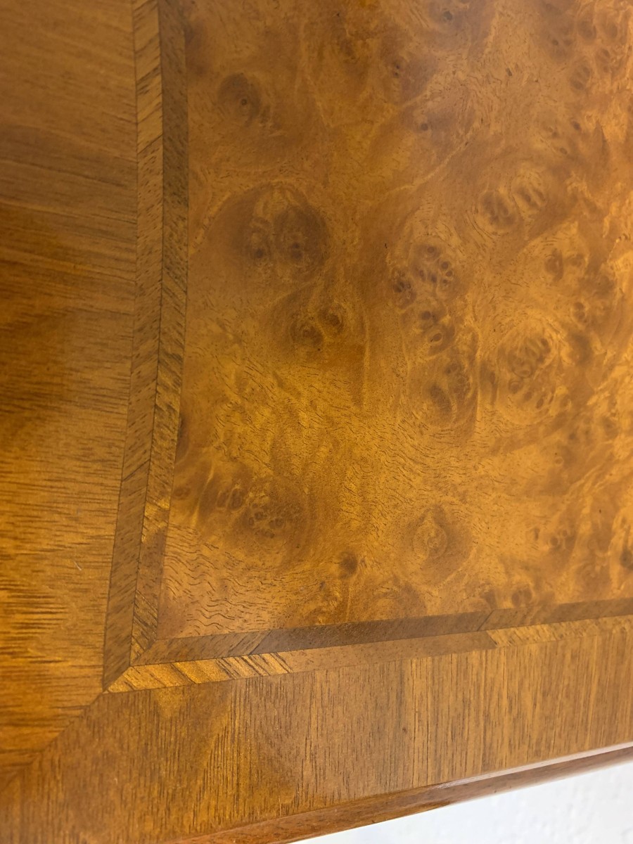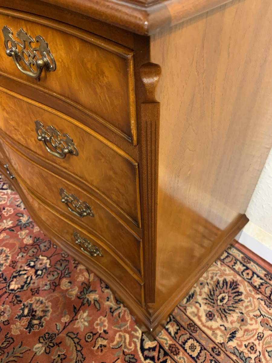 This chest is made in striking burr walnut. The shaped oversailing top has a crossbanded edging with herring bone decoration. Below are four serpentine shaped drawers, each drawer having a pair of brass handles. Carved decoration to the front edging this fabulous quality chest of drawers stands on four bracket feet. Please note the chest is in excellent condition.