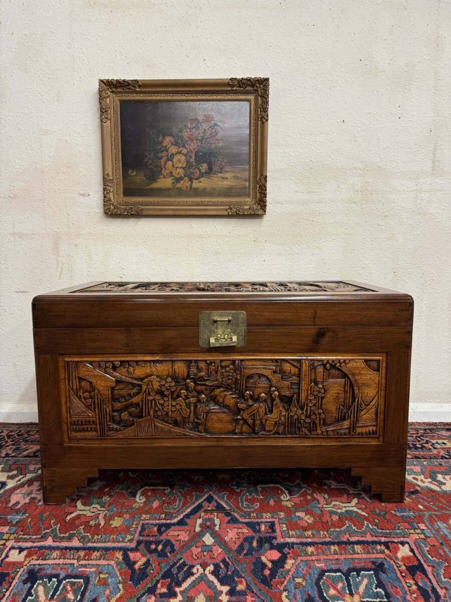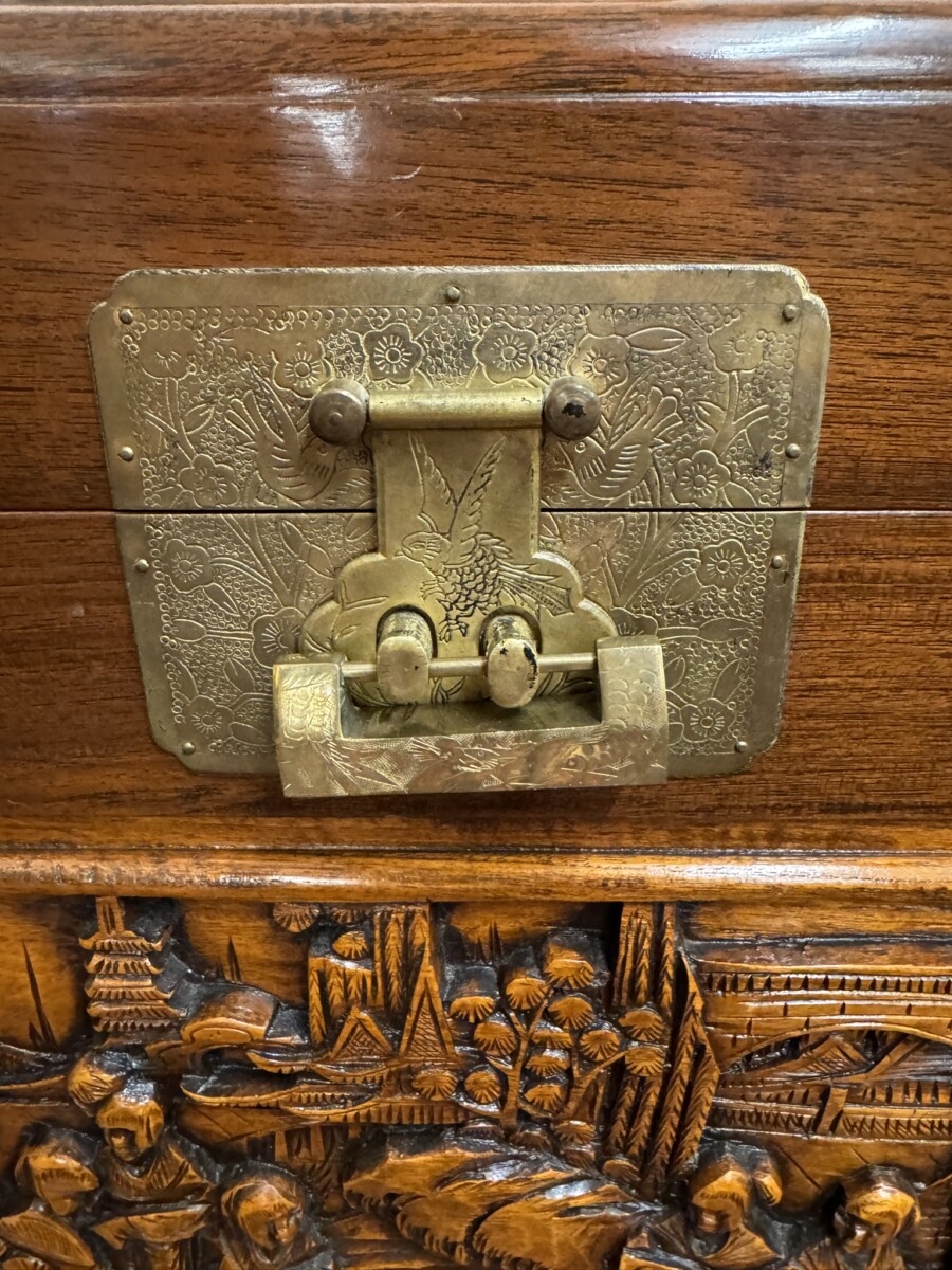 This good sized camphor wood trunk has fine oriental carved scenes to the top front back and sides. The lift up lid opens to reveal ample storage.. Brass clasp with own lock and key, lovely brass fittings and standing on four shaped feet.