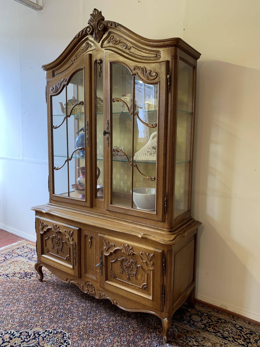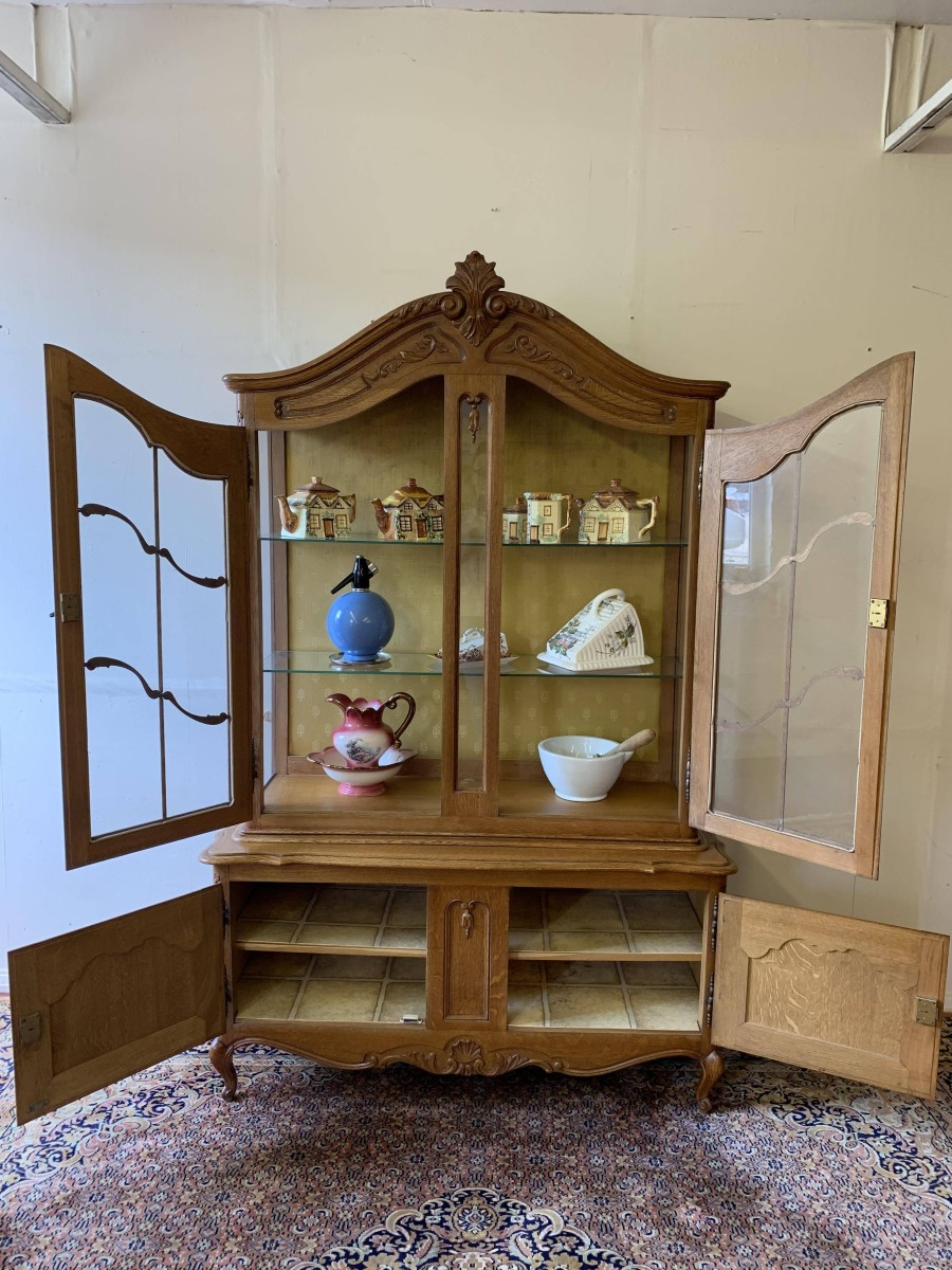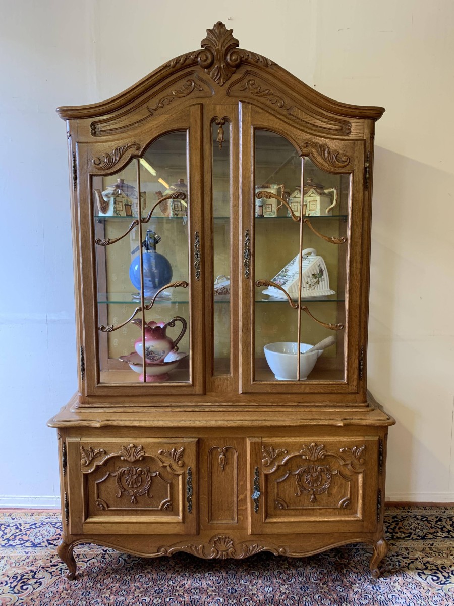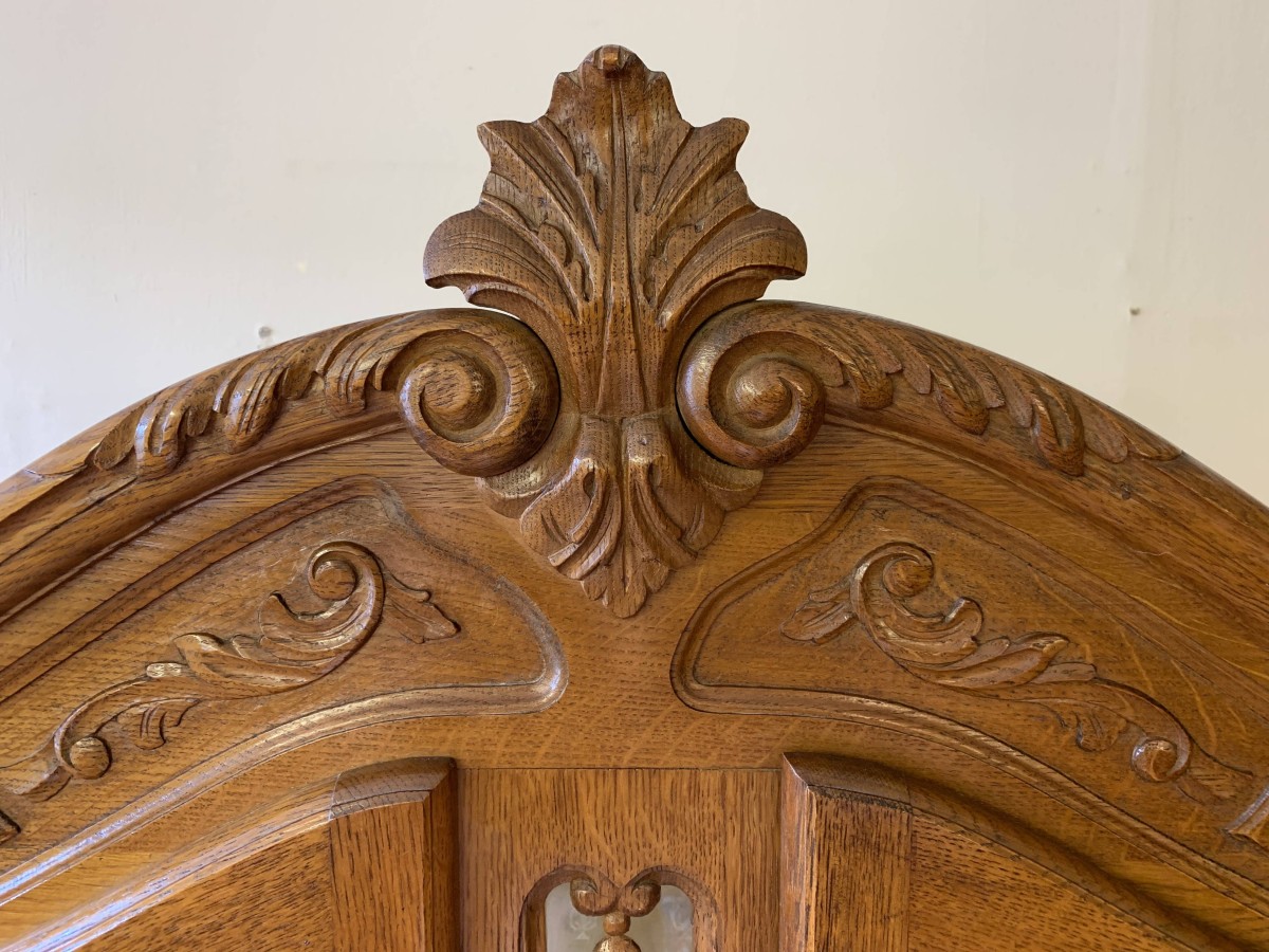 Shaped oversailing top rises to a decorative carving. Below are two lockable glazed doors, each door having brass hinges, brass escutcheon, brass key and carved wood barring. The doors open to reveal two glass shelves. Below are a pair of carved recessed panelled doors each door having brass hinges and decorative escutcheon. The doors open to reveal a removable wooden shelf. Recessed panelled sides shaped skirt with central ornate carvings this fabulous oak French antique cabinet stands on two carved cabriole shaped legs to the front.
