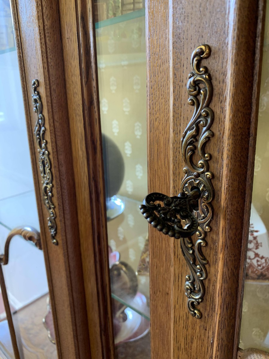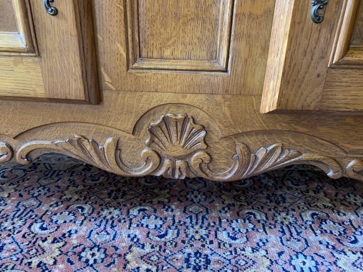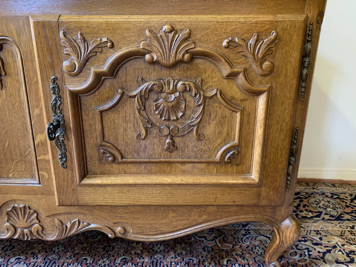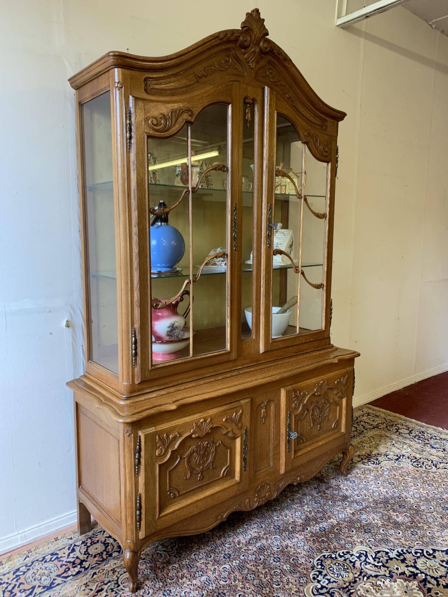 Shaped oversailing top rises to a decorative carving. Below are two lockable glazed doors, each door having brass hinges, brass escutcheon, brass key and carved wood barring. The doors open to reveal two glass shelves. Below are a pair of carved recessed panelled doors each door having brass hinges and decorative escutcheon. The doors open to reveal a removable wooden shelf. Recessed panelled sides shaped skirt with central ornate carvings this fabulous oak French antique cabinet stands on two carved cabriole shaped legs to the front.