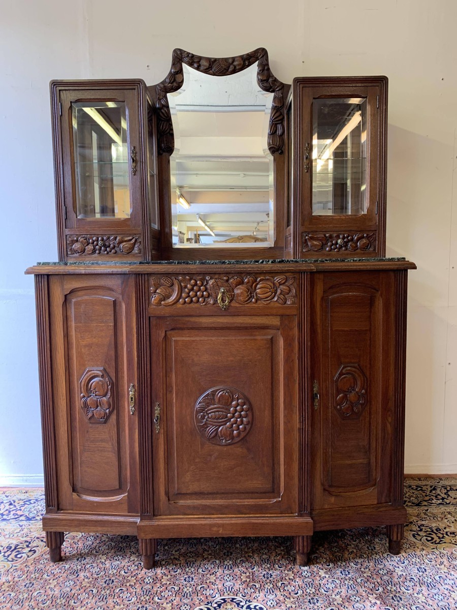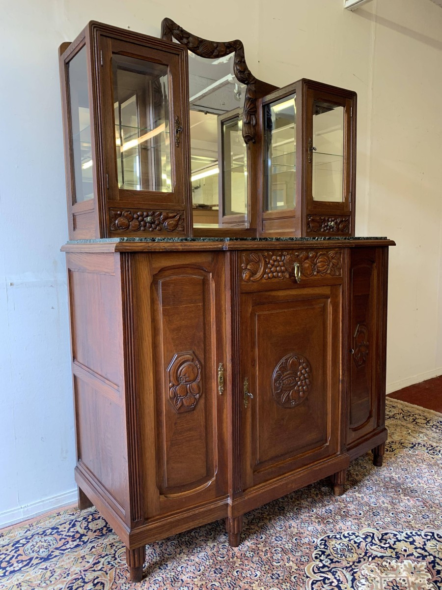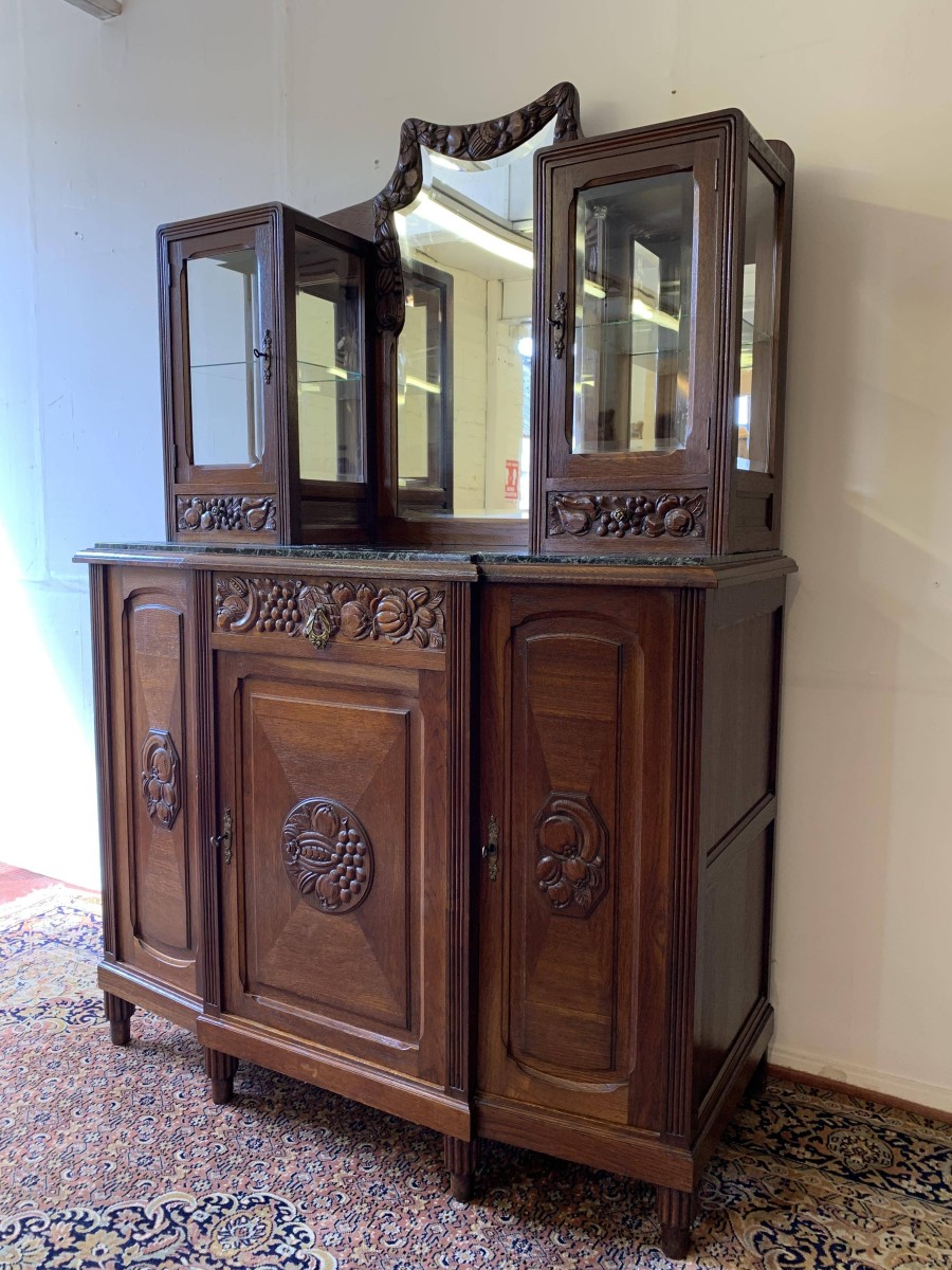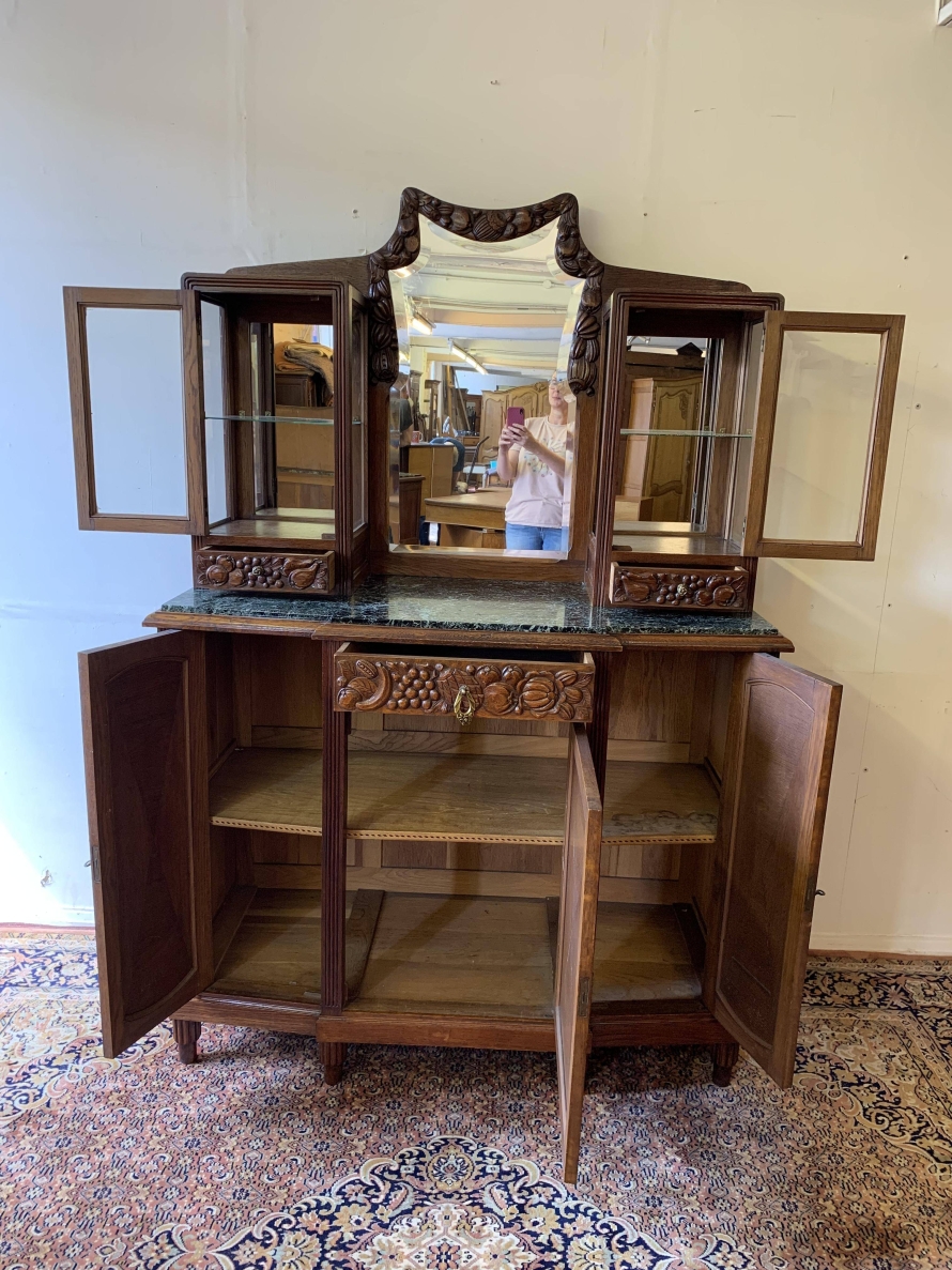 The removable top section has a central carved bevel edged mirror which is flanked by a pair of glass sided cabinets, the doors open to reveal a glass shelf. There are two carved drawers below. The base section has a marble top which sits above a central carved drawer which in turn sits above a carved recessed panelled cupboard door, this door is flanked by a pair of carved recessed panelled doors. The doors open to reveal a wooden removable shelf. This super cabinet sits on four carved turned legs to the front.