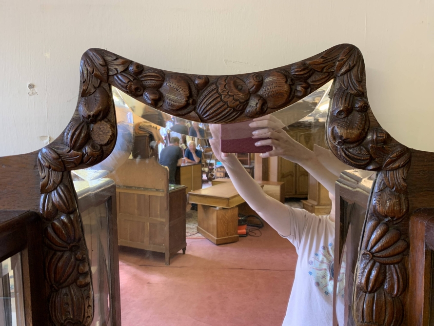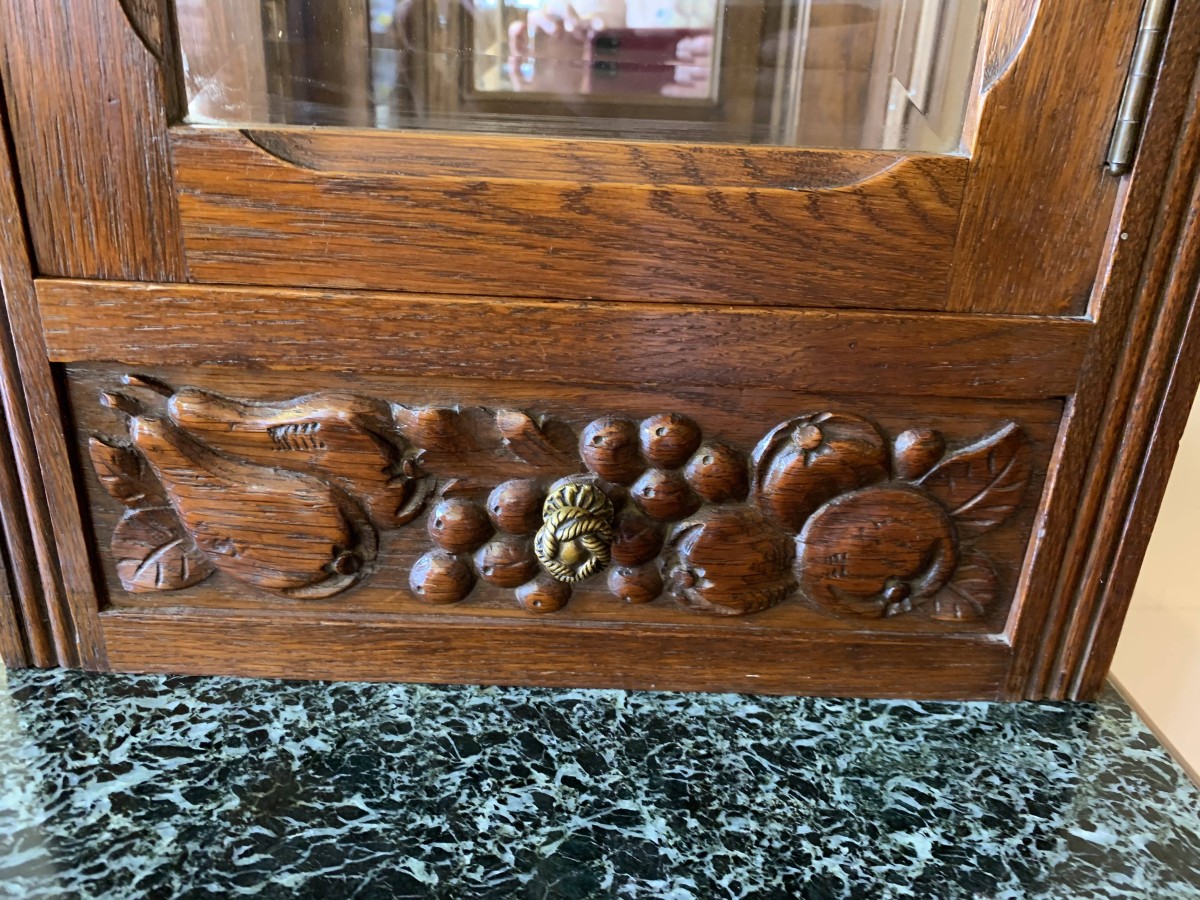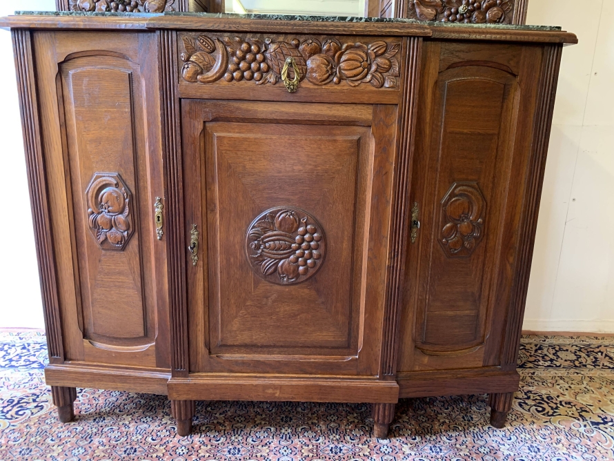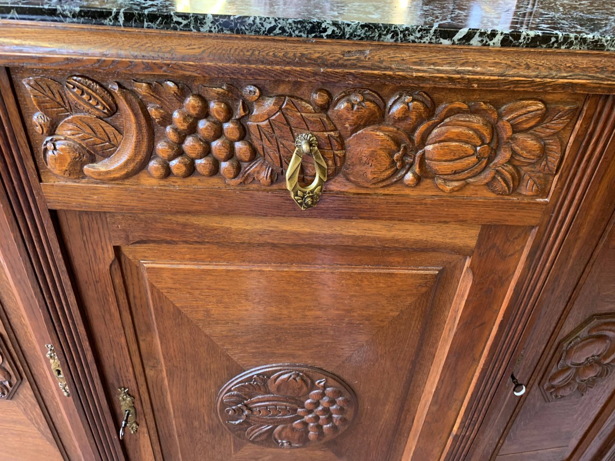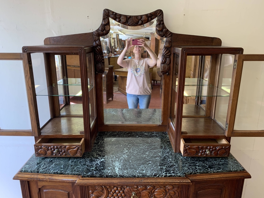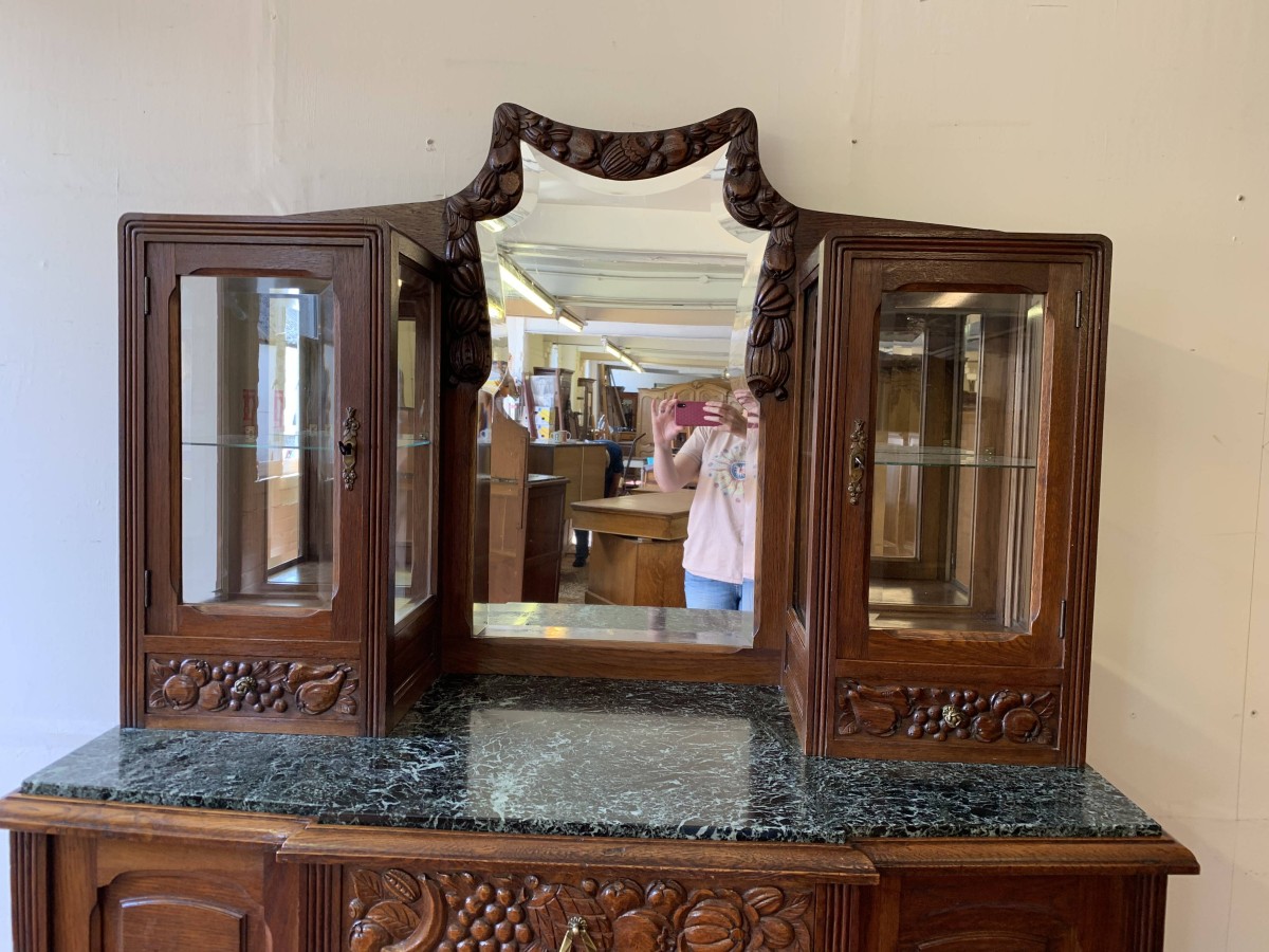 The removable top section has a central carved bevel edged mirror which is flanked by a pair of glass sided cabinets, the doors open to reveal a glass shelf. There are two carved drawers below. The base section has a marble top which sits above a central carved drawer which in turn sits above a carved recessed panelled cupboard door, this door is flanked by a pair of carved recessed panelled doors. The doors open to reveal a wooden removable shelf. This super cabinet sits on four carved turned legs to the front.
