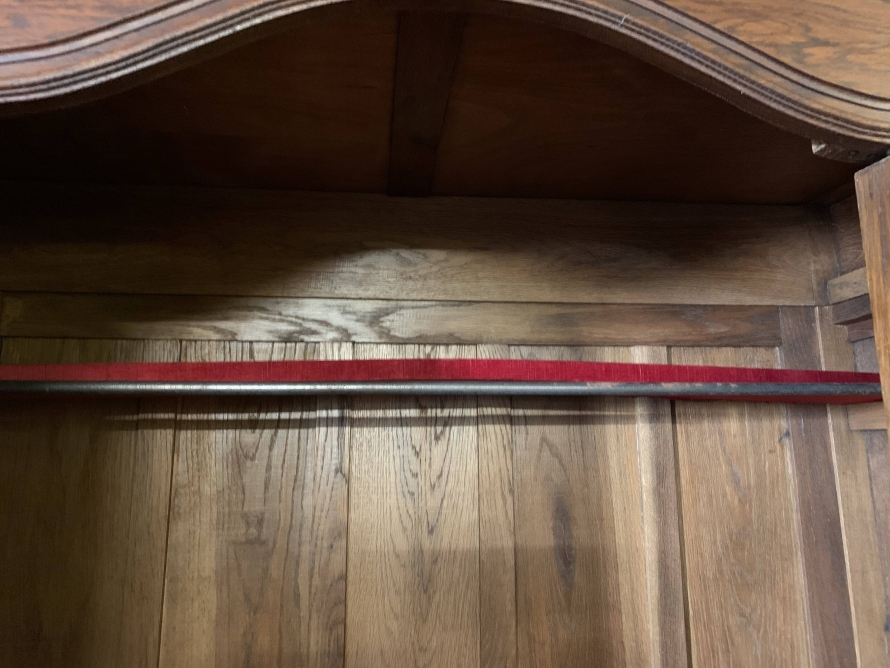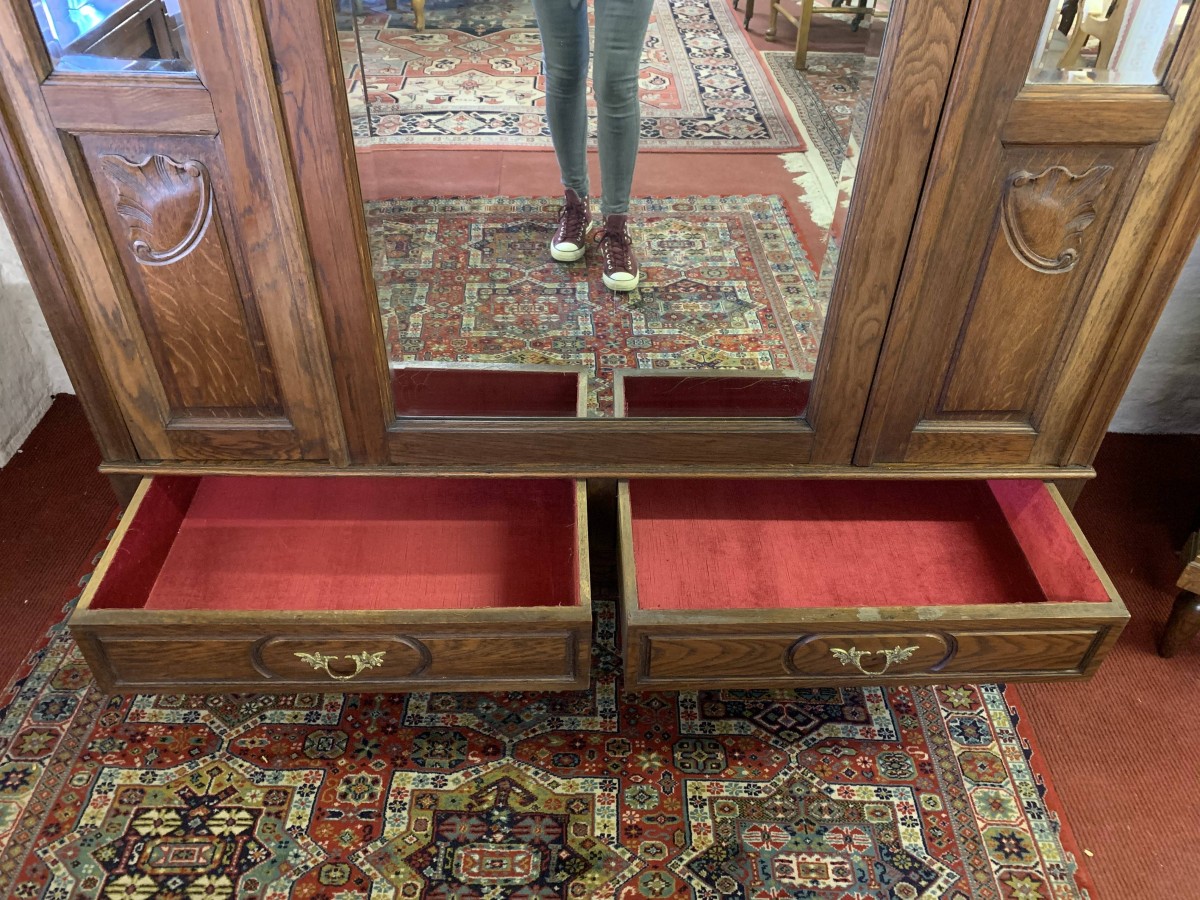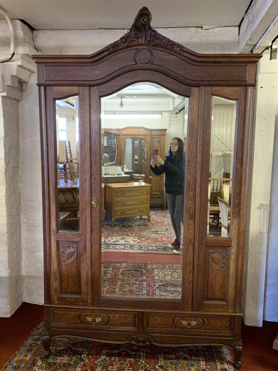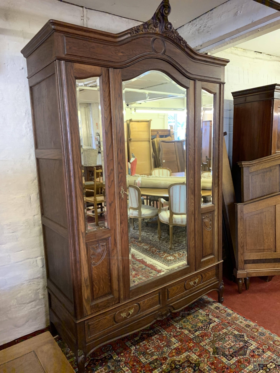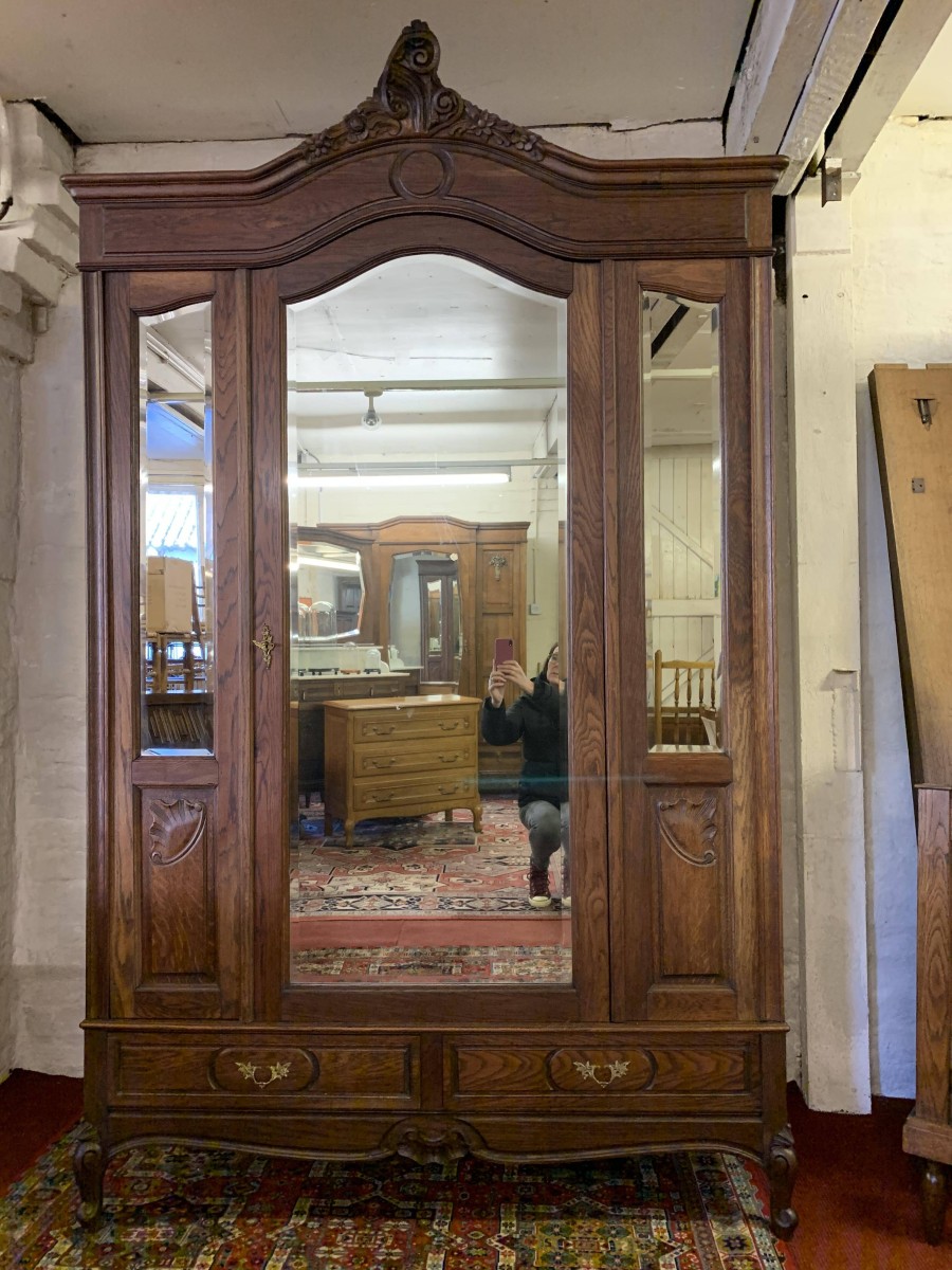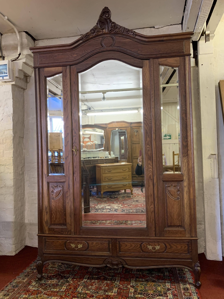 The shaped over sailing top rises to a highly decorative central carving. Below is a full length bevelled edged lockable mirror door, the door opens to reveal a hanging rail with shelf above. The central mirror door is flanked by a pair of mirrors with carved panels below. Below the mirrors are a pair of handy storage drawers, each drawer having ornate brass handles. Recessed panelled sides, shaped skirt with central carved decoration. This super armoire stands on a pair of shaped carved cabriole legs to the front. Please note this wardrobe splits down for easy transportation and delivery into any home.