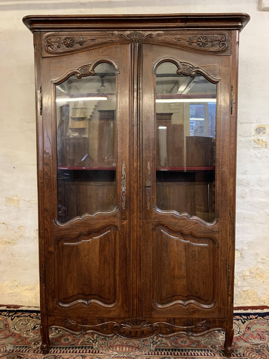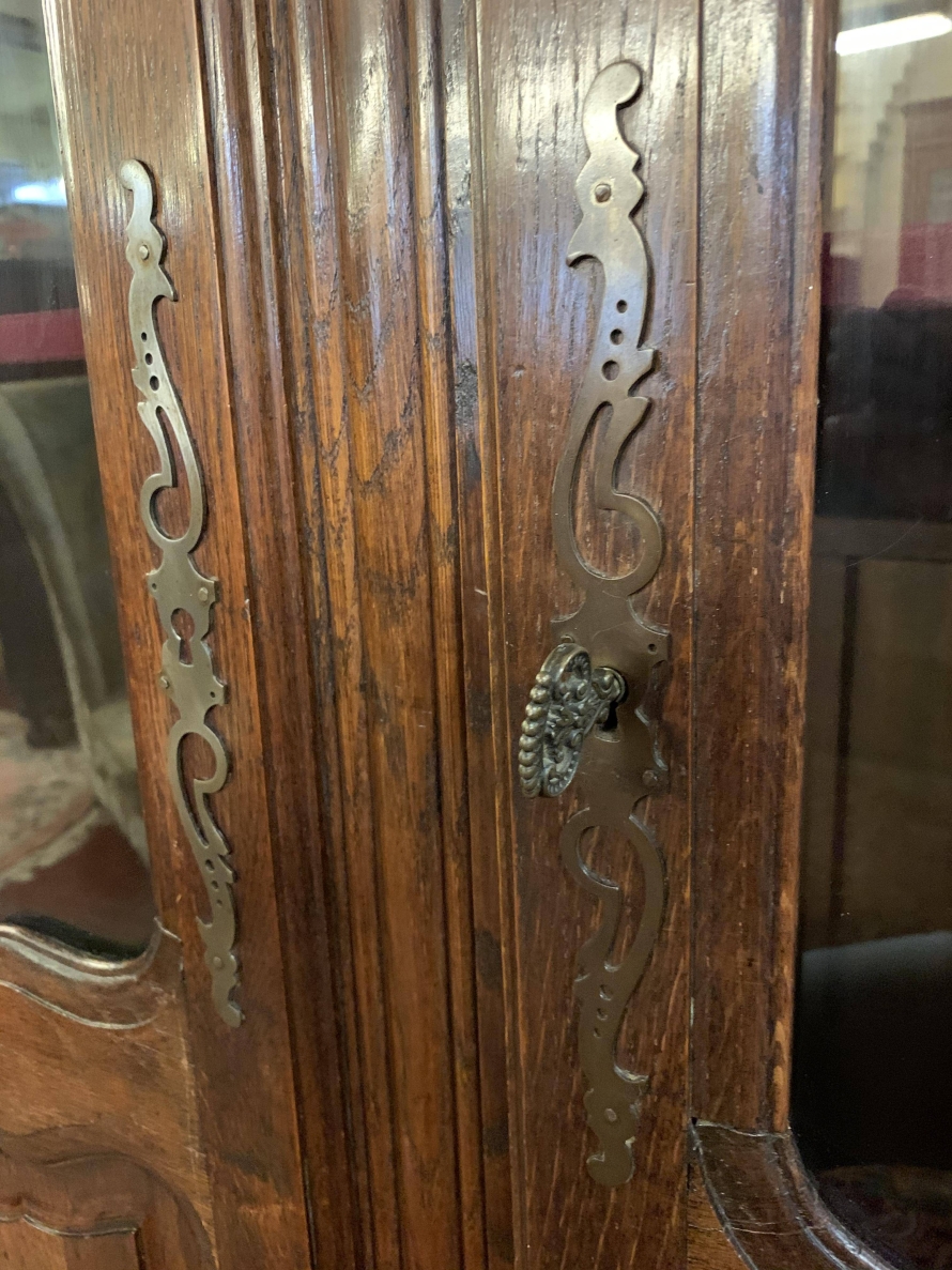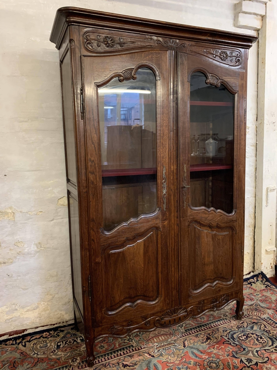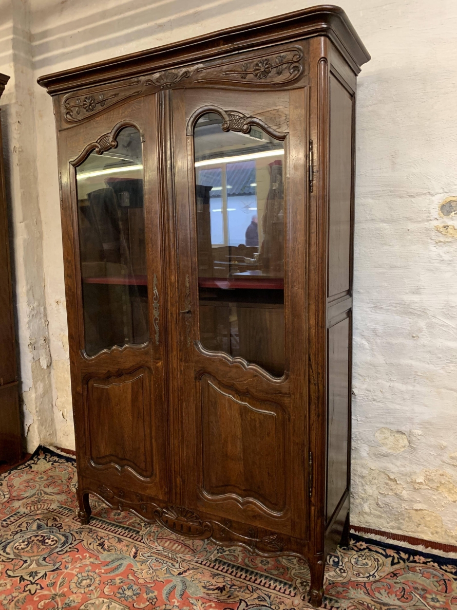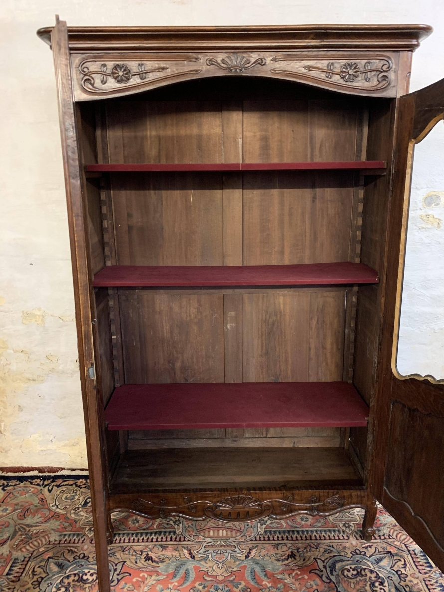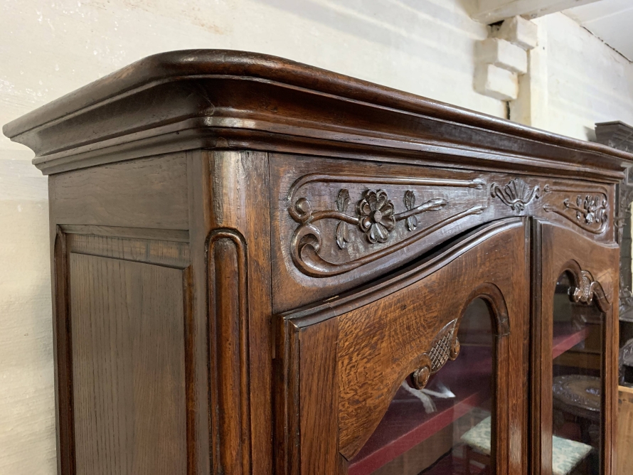 The over sailing top sits above a pair of recessed panelled and glazed lockable doors. There is a decorative ornate carving above the doors. Each door has brass hinges and decorative brass escutcheon. The door opens to reveal three adjustable and removable shelves, recessed panelled sides, shaped skirt with ornate carvings. This beautiful bookcase stands on two shaped carved cabriole legs to the front.