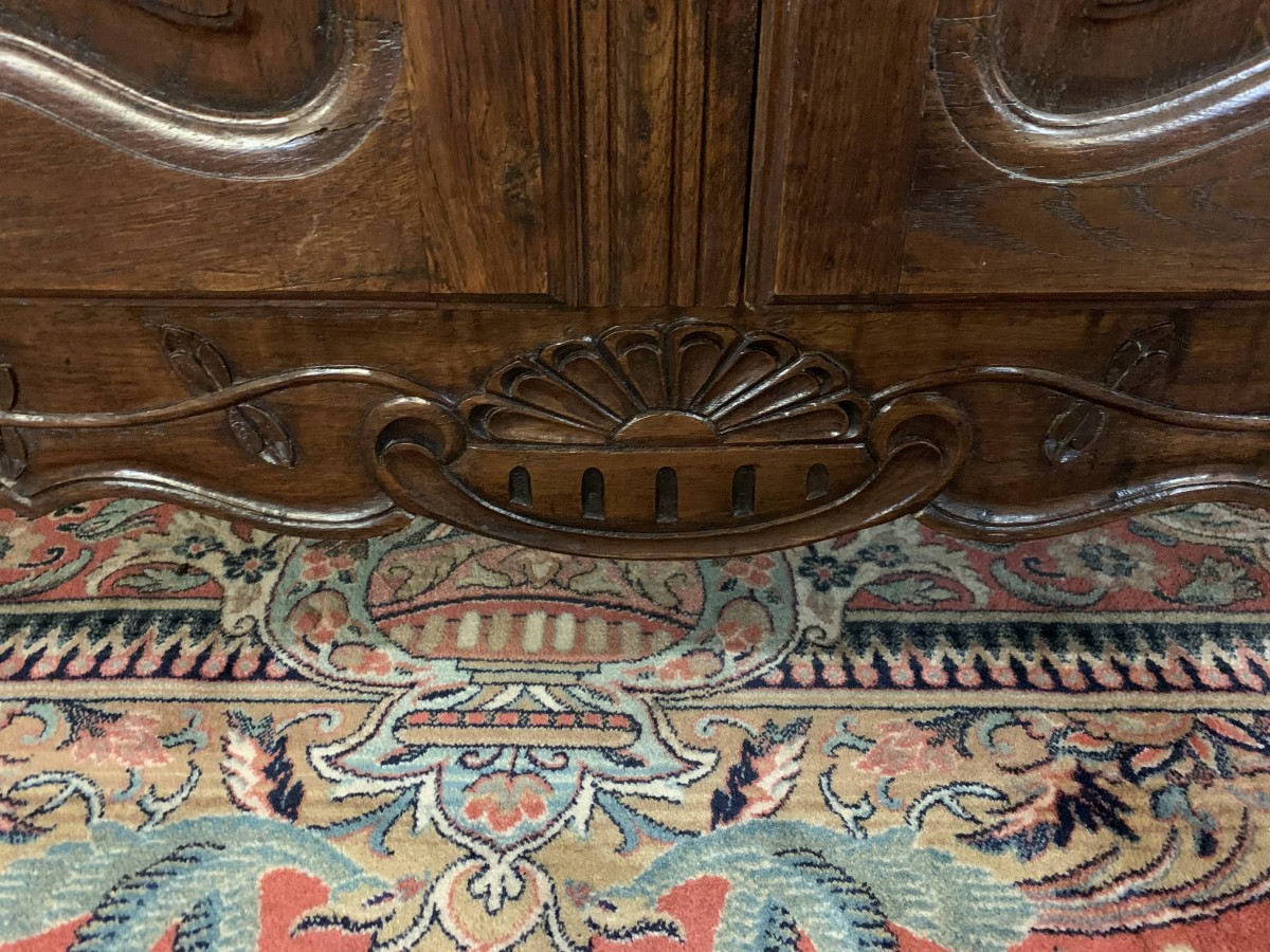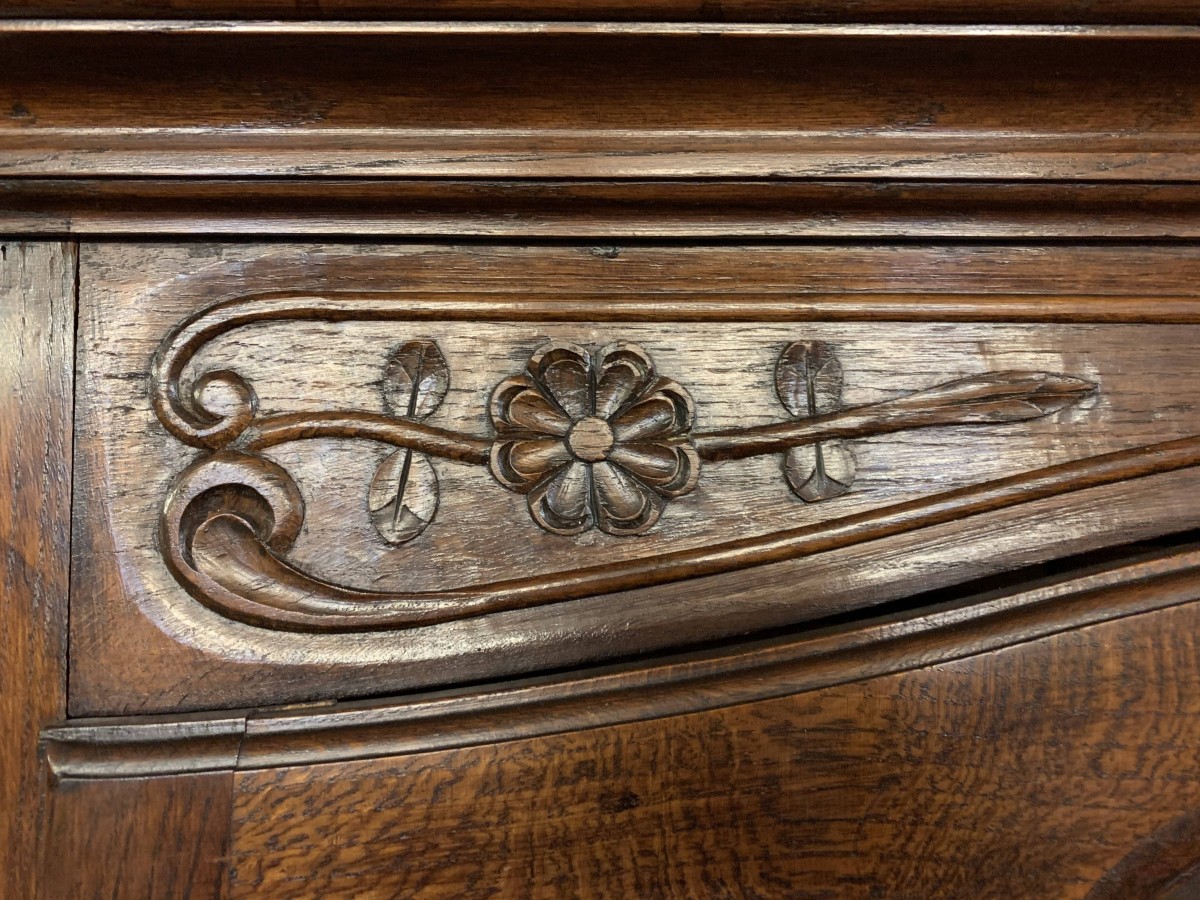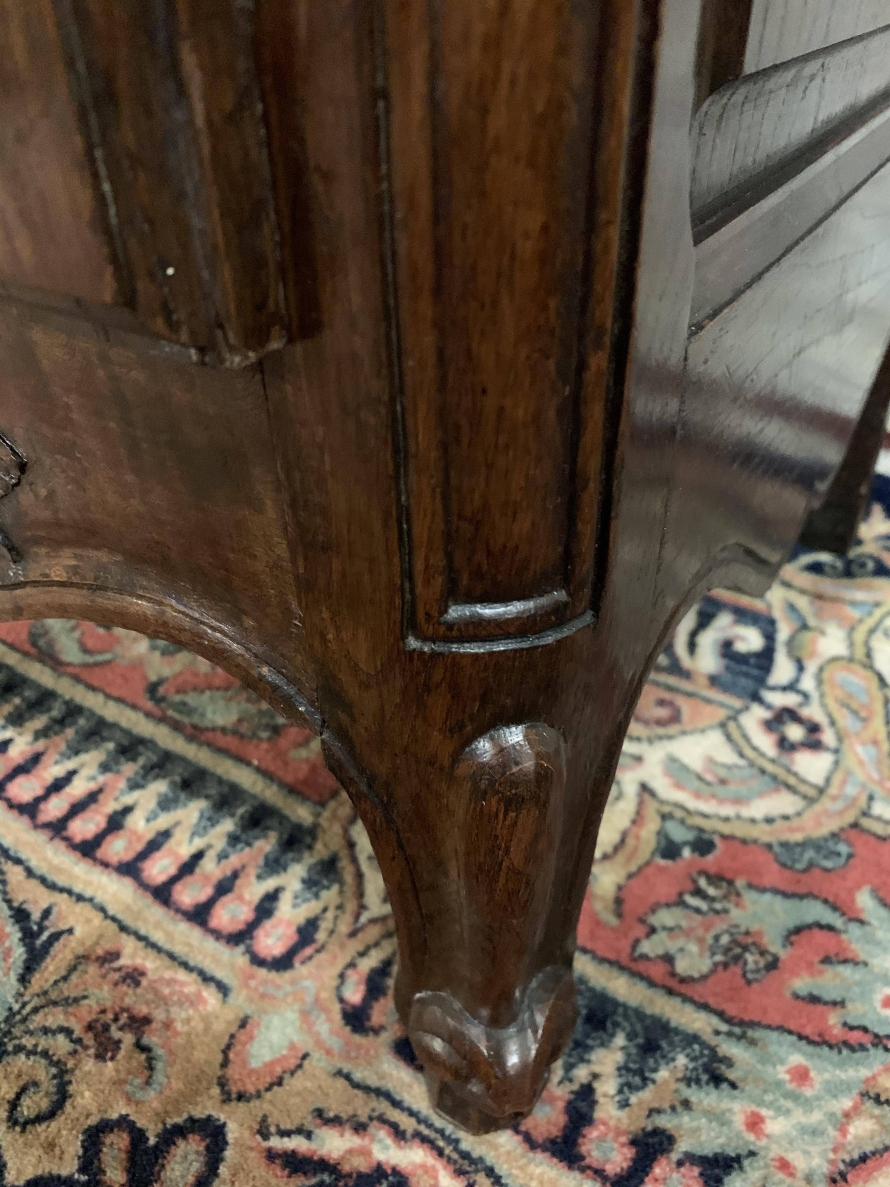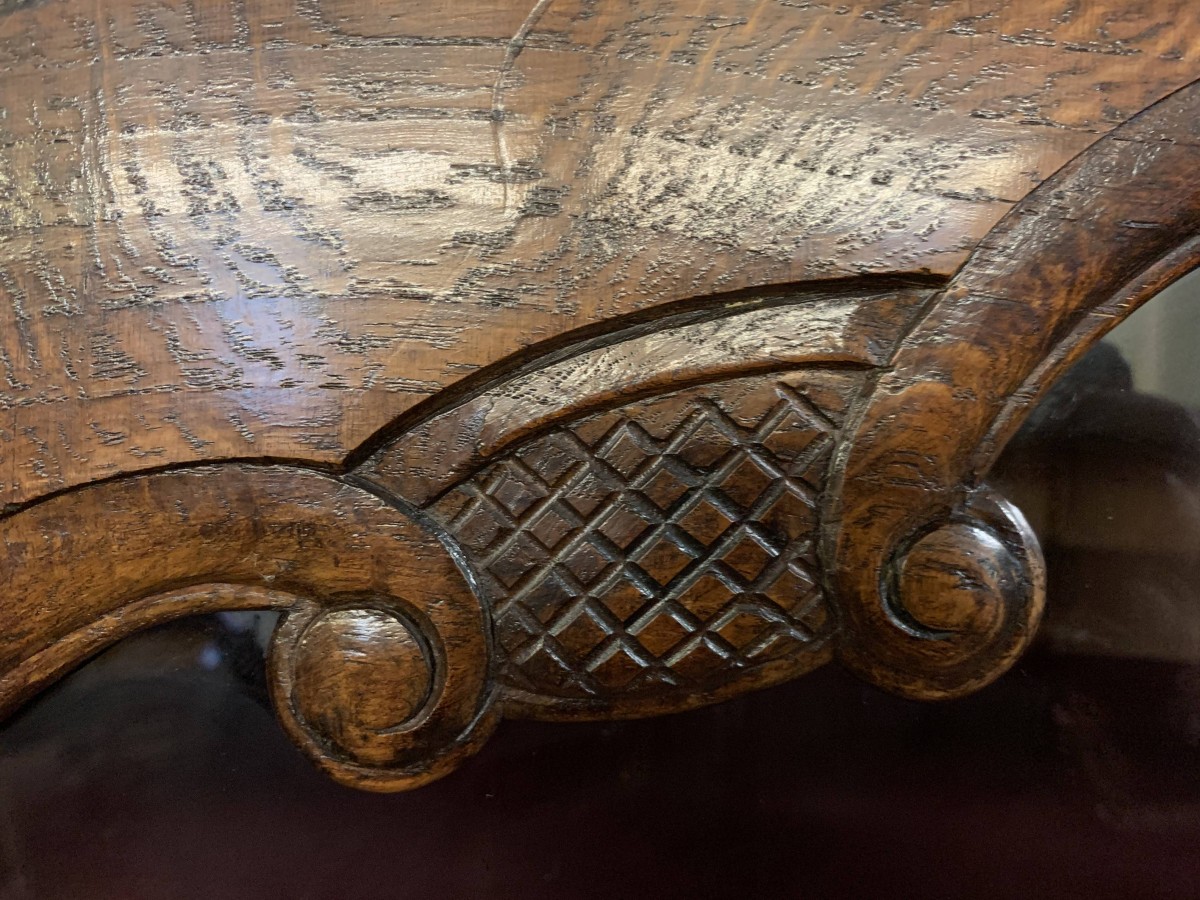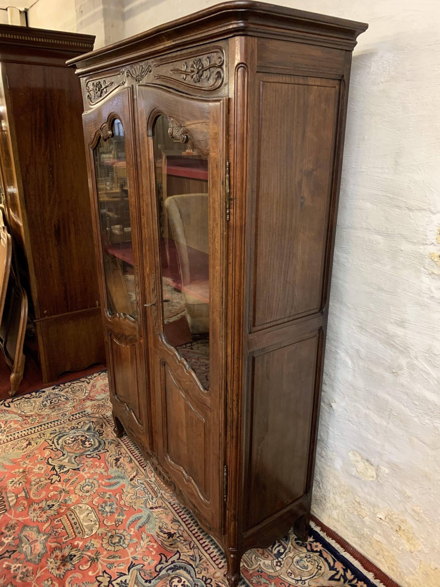 The over sailing top sits above a pair of recessed panelled and glazed lockable doors. There is a decorative ornate carving above the doors. Each door has brass hinges and decorative brass escutcheon. The door opens to reveal three adjustable and removable shelves, recessed panelled sides, shaped skirt with ornate carvings. This beautiful bookcase stands on two shaped carved cabriole legs to the front.