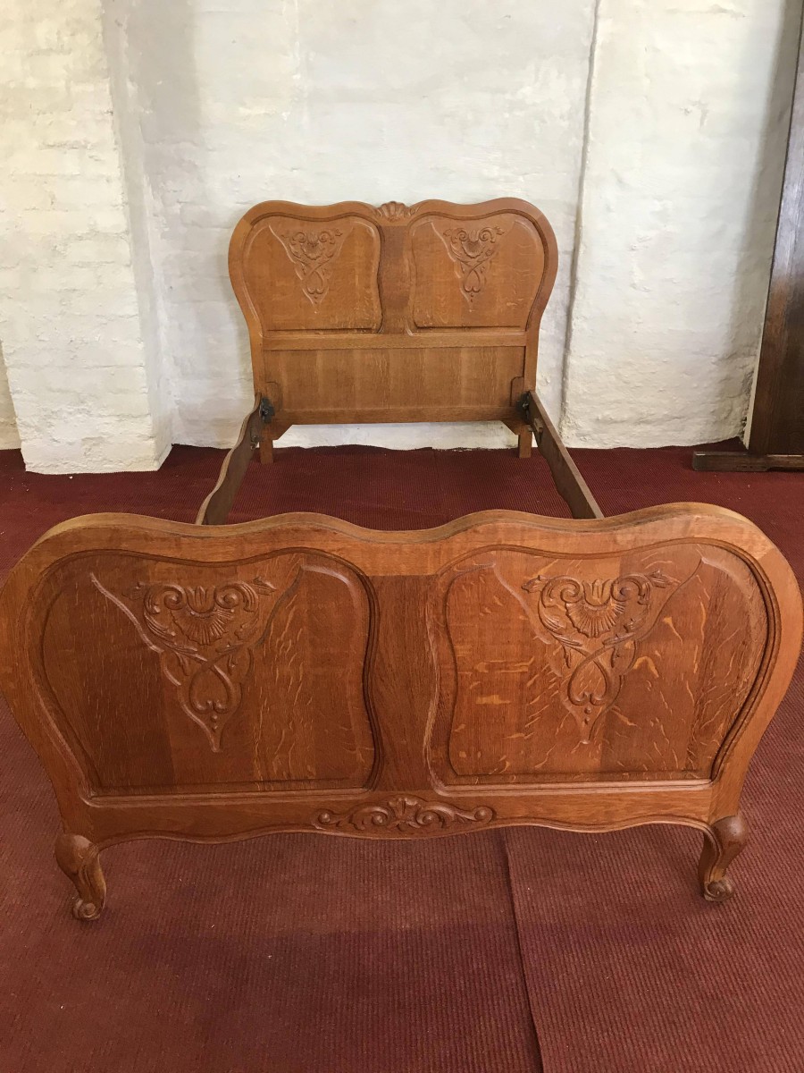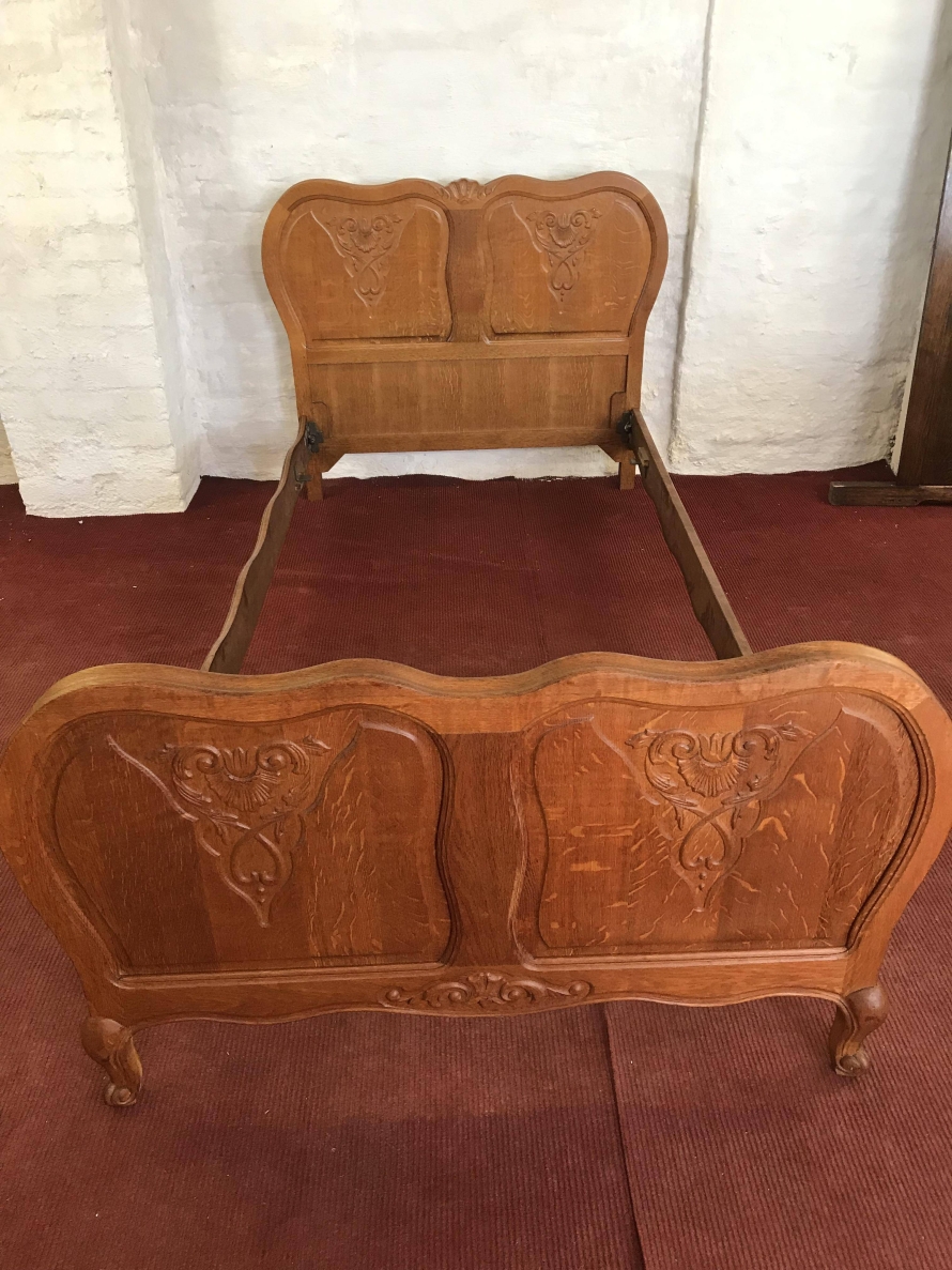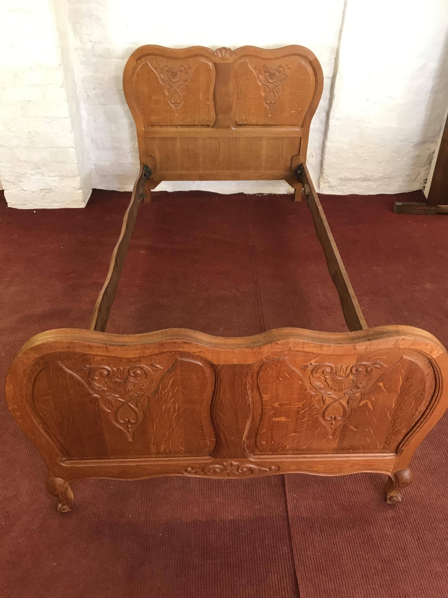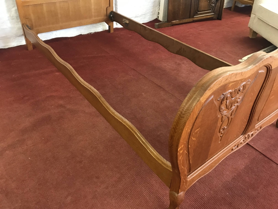 We are delighted to offer this gorgeous carved French golden oak single bed. The headboard is shaped and rises to a central decorative carving, below are a pair of shaped recessed panels each panel having fine decorative carving. The footboard is also shaped and has a decorative carving to the base. To shaped recessed panels with matching carvings to the headboard, this stylish bed has carved cabriole legs to the footboard. The bed takes a standard single mattress.
