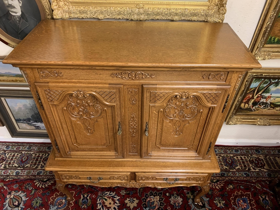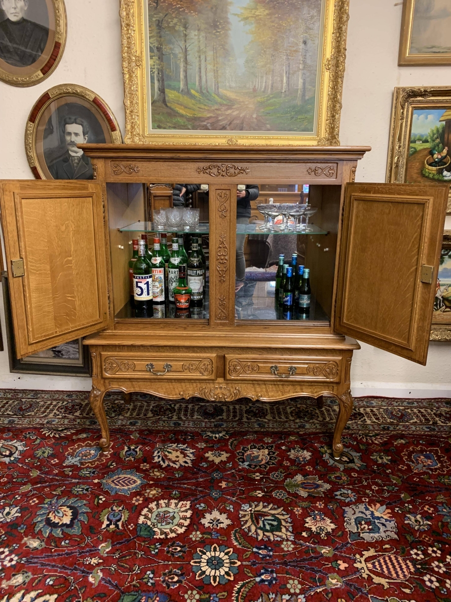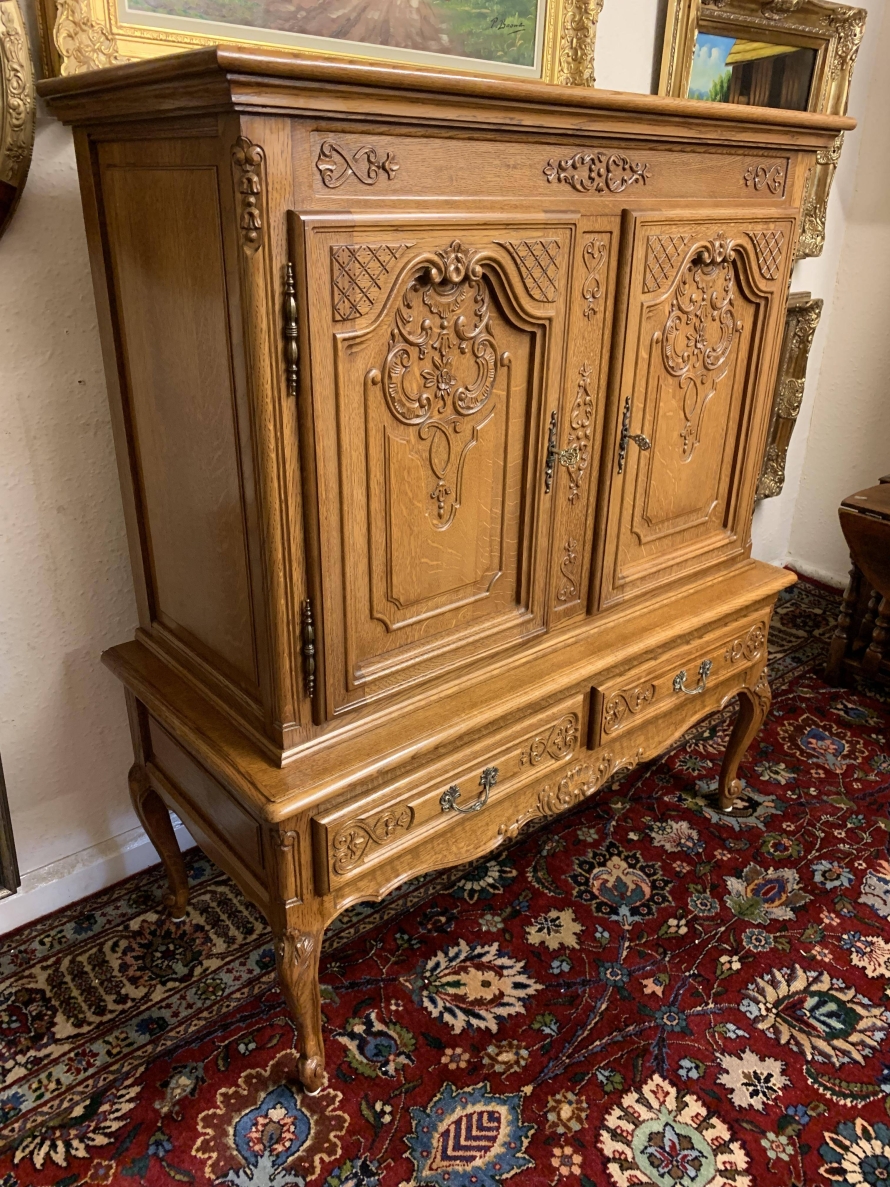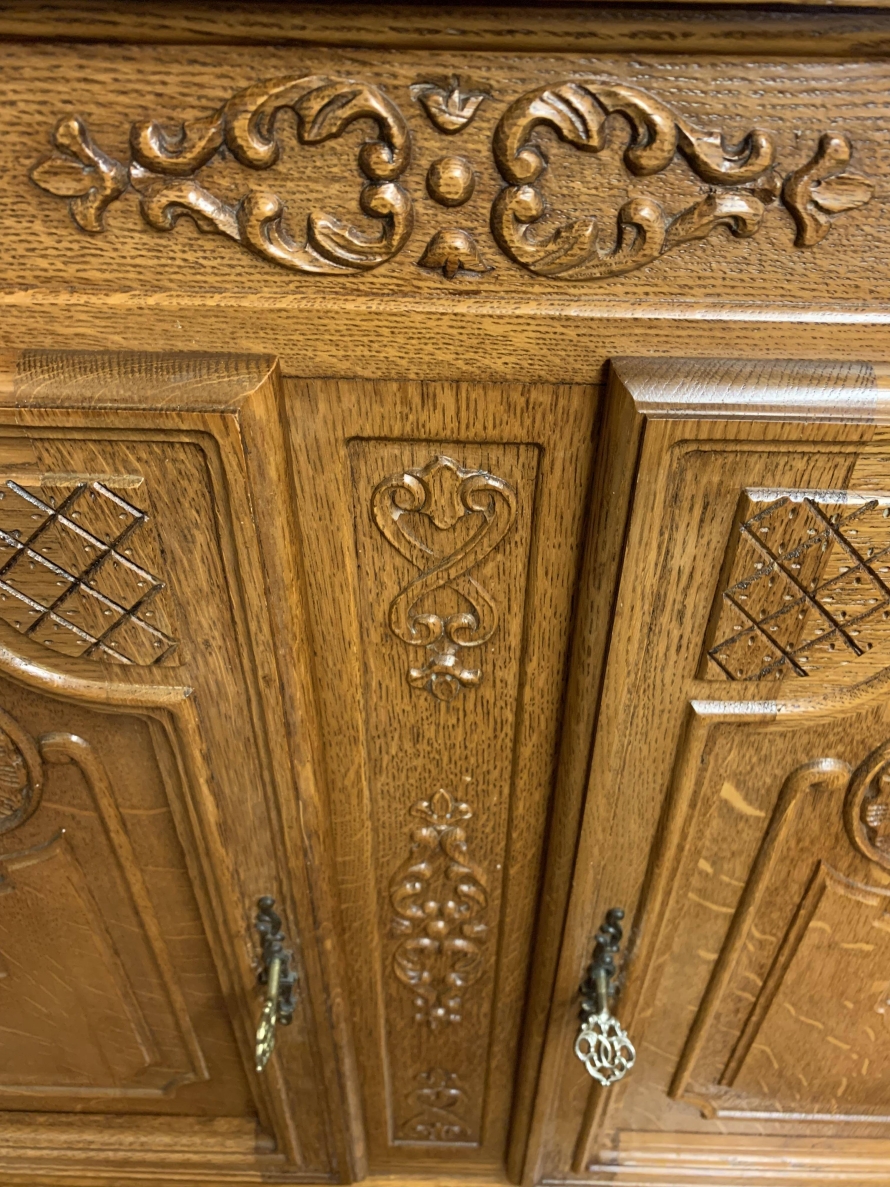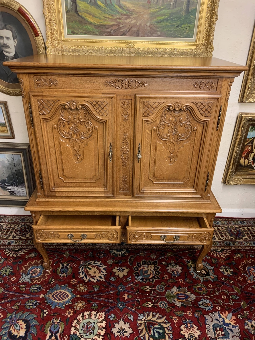 This beautiful carved oak French drinks cabinet is in excellent condition. The shaped oversailing top has decorative carvings below. Having two stunning carved recessed panelled lockable doors, each door having brass hinges, escutcheon and key. There is a carved fixed panel between the doors. The doors open to reveal a glass base, mirrored back and a glass removable shelf. Below are a pair of carved drawers, each drawer having a decorative brass shaped handle. Recessed panelled sides, shaped skirt with central decorative carving this fantastic drinks cabinet stands on four carved cabriole shaped legs.