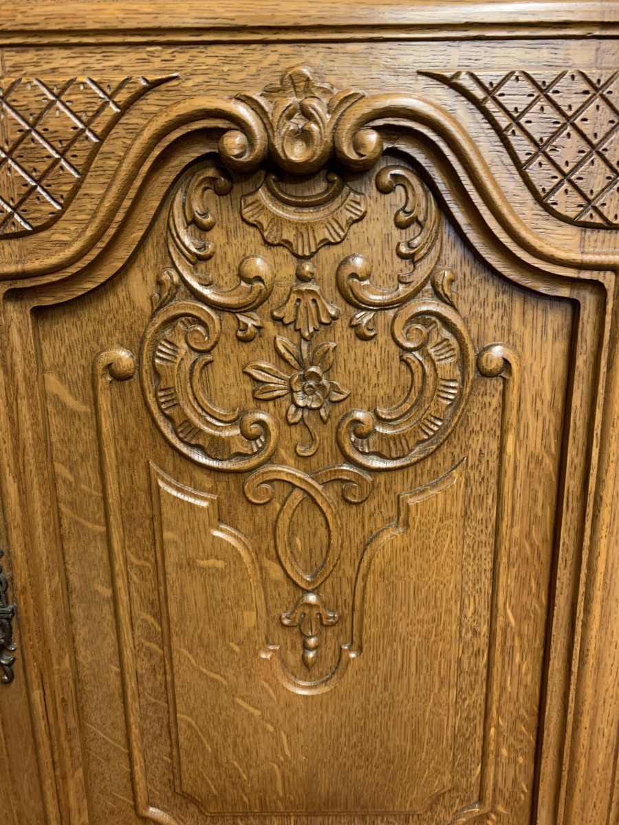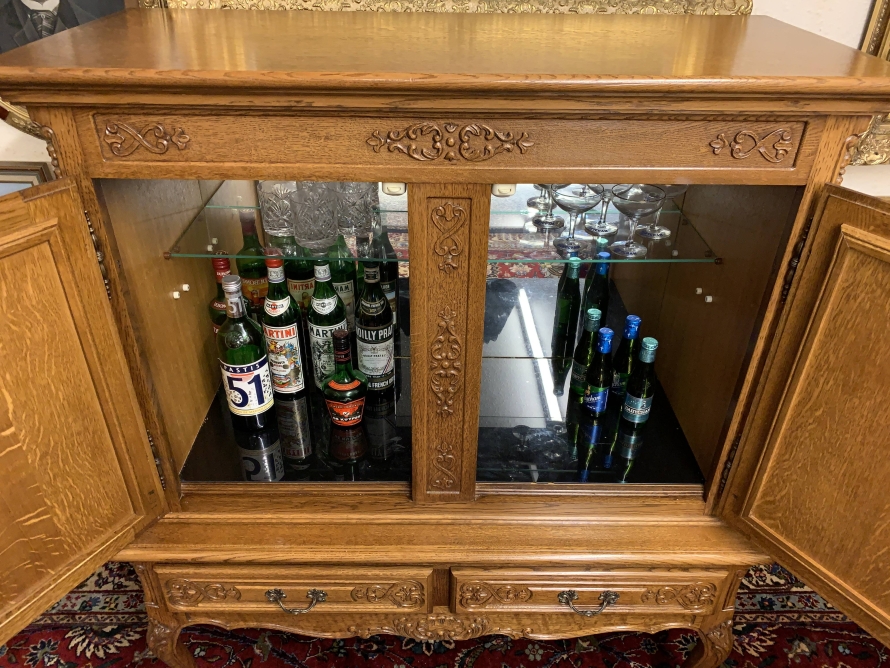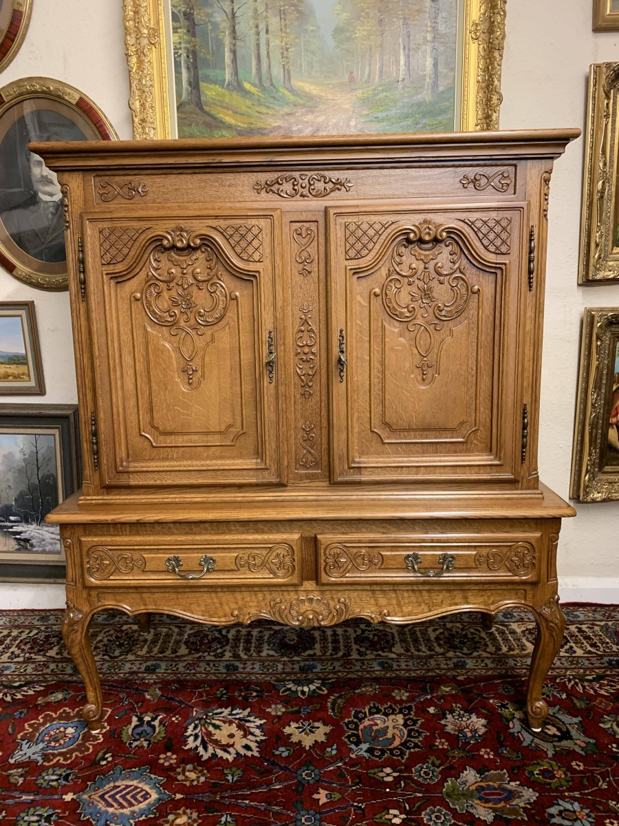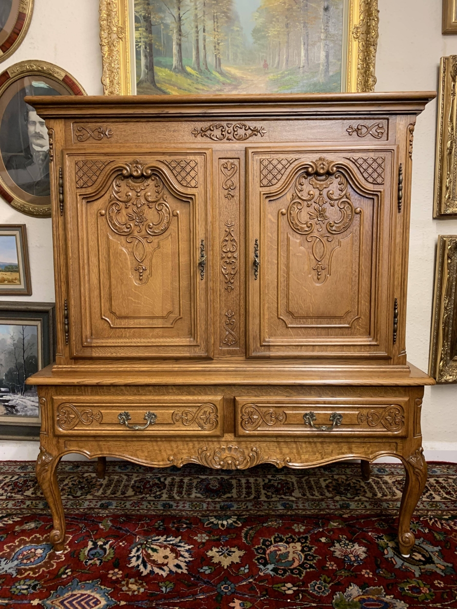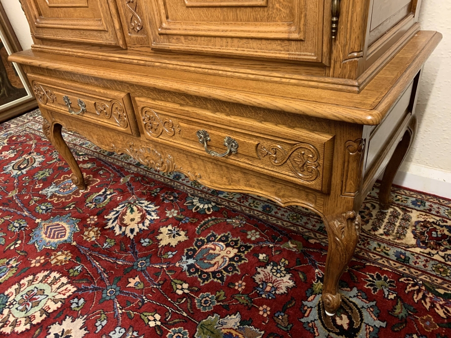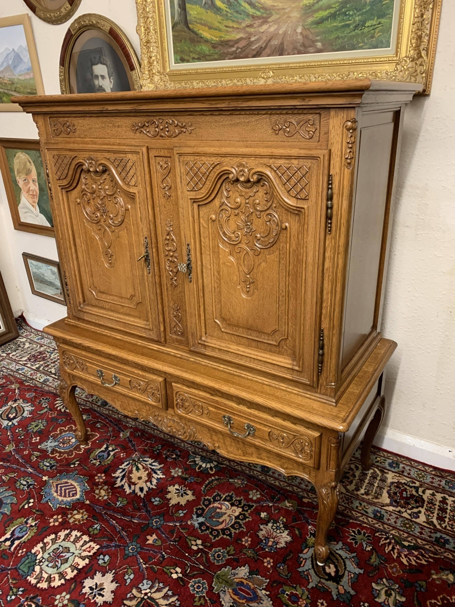 This beautiful carved oak French drinks cabinet is in excellent condition. The shaped oversailing top has decorative carvings below. Having two stunning carved recessed panelled lockable doors, each door having brass hinges, escutcheon and key. There is a carved fixed panel between the doors. The doors open to reveal a glass base, mirrored back and a glass removable shelf. Below are a pair of carved drawers, each drawer having a decorative brass shaped handle. Recessed panelled sides, shaped skirt with central decorative carving this fantastic drinks cabinet stands on four carved cabriole shaped legs.