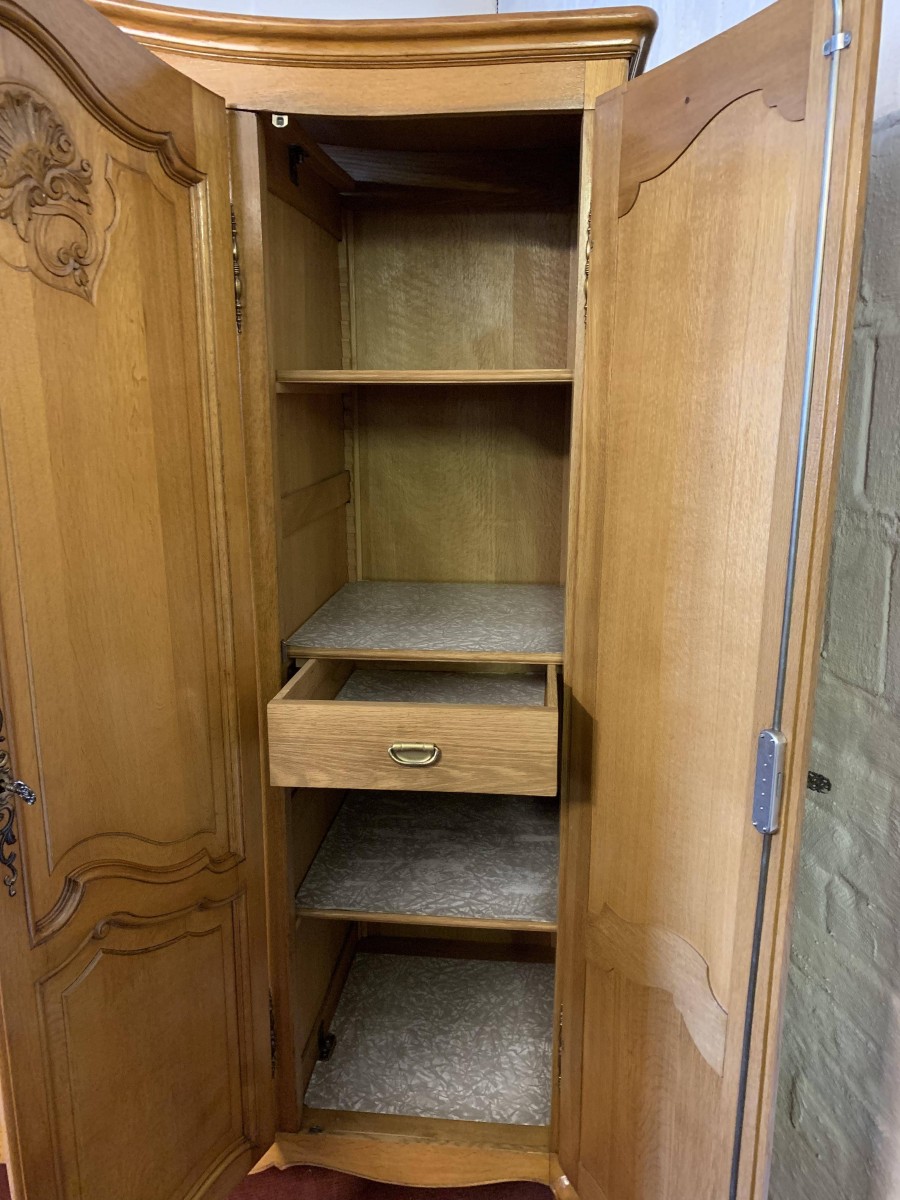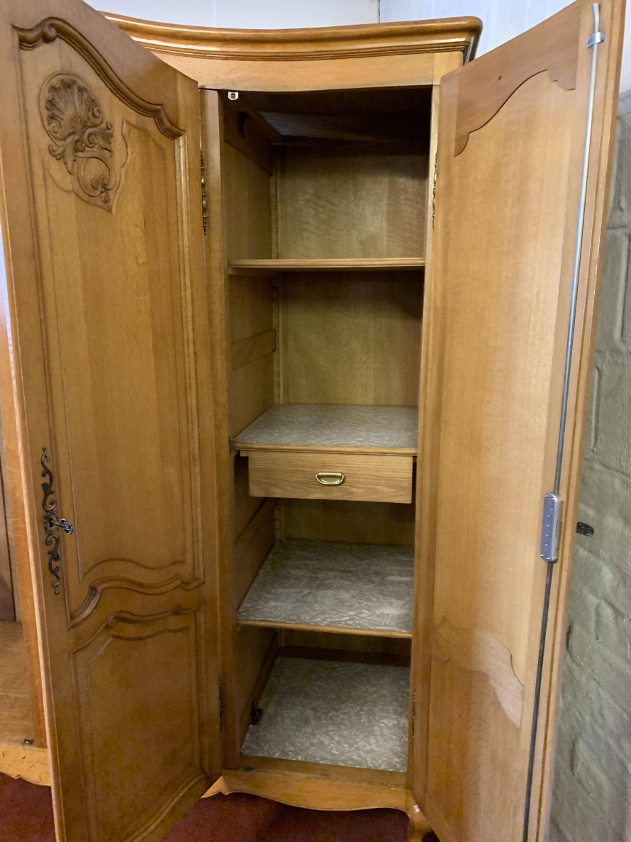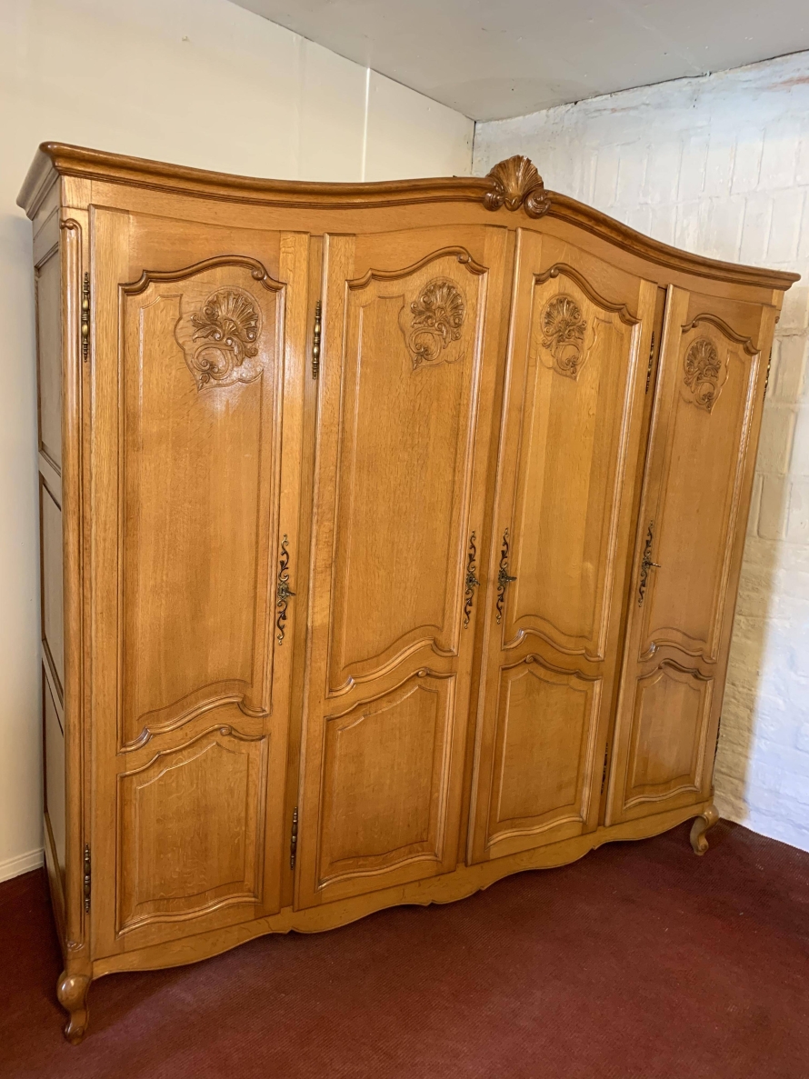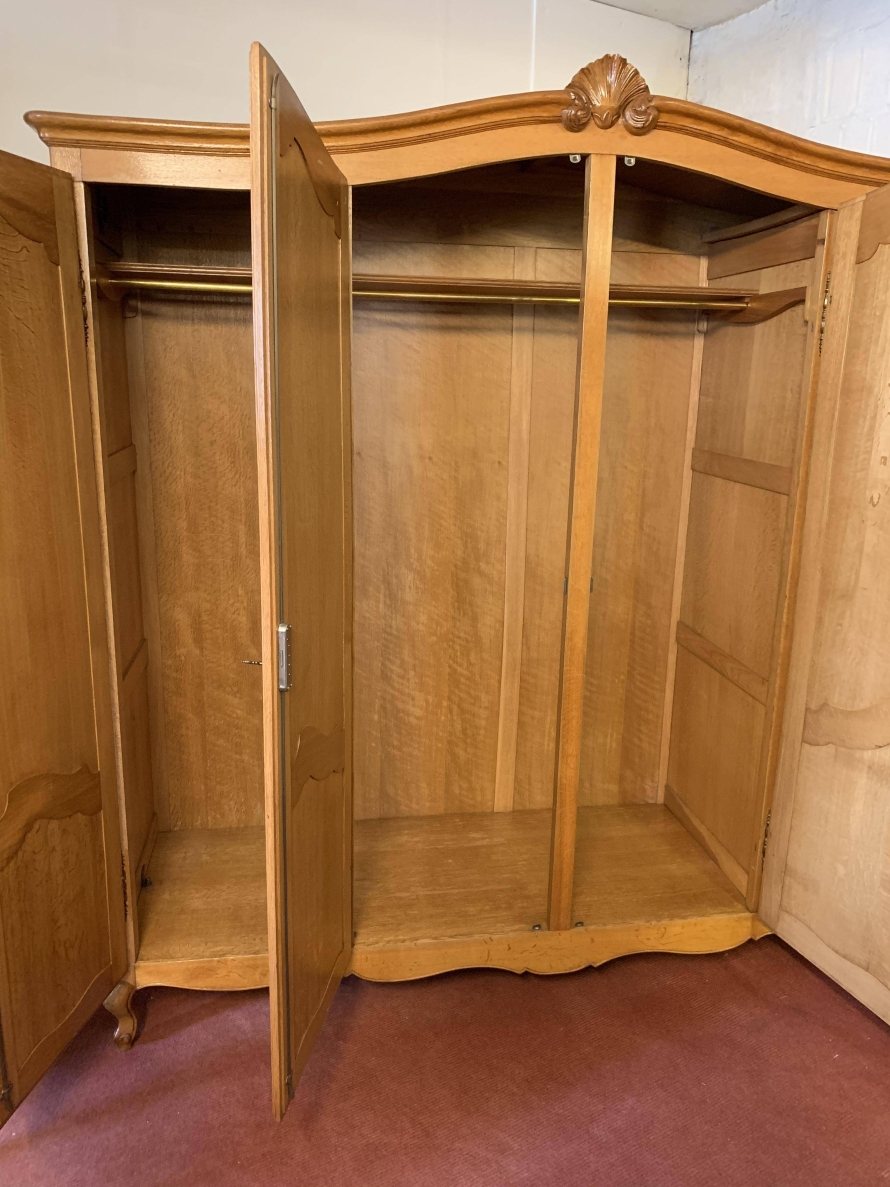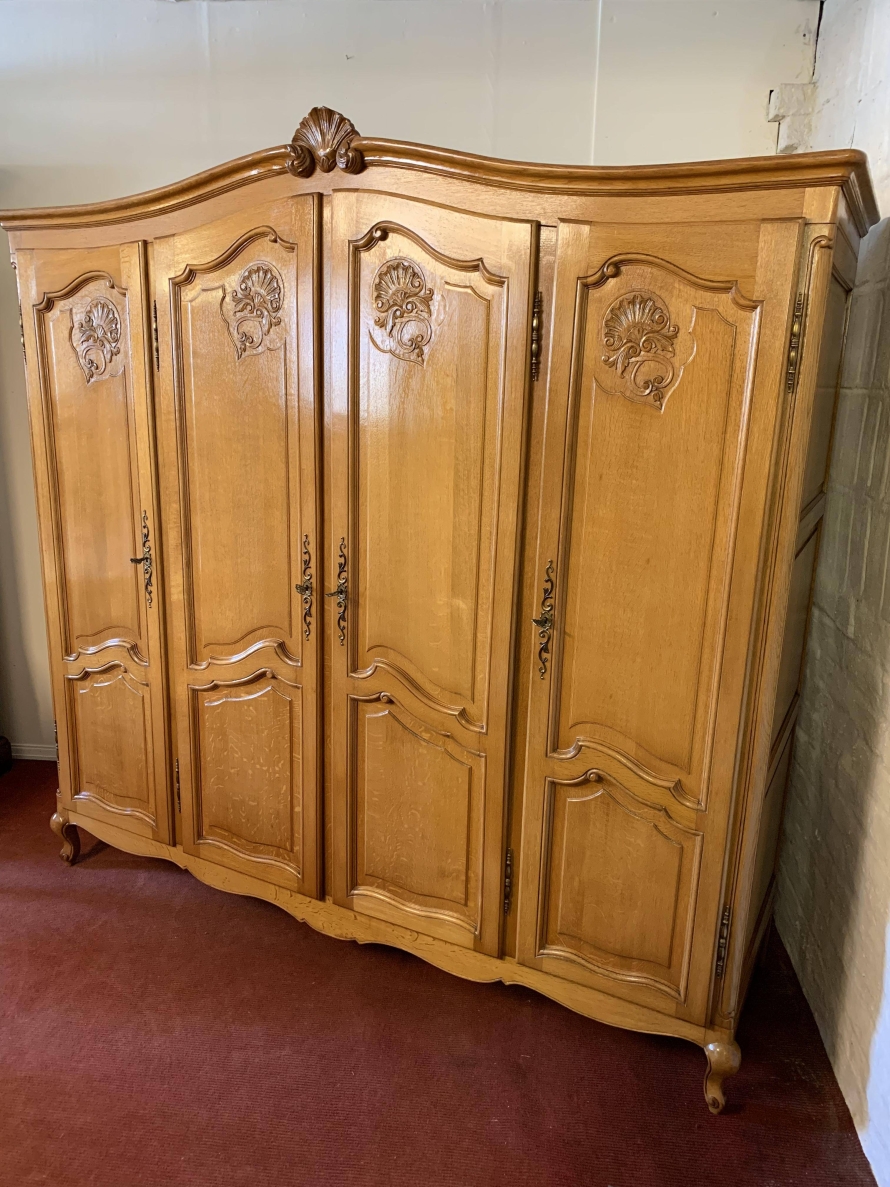 The shaped over sailing top rises to a decorative central fan carving. Below are four carved recessed panelled lockable doors, each door having brass hinges decorative brass escutcheon and key. The left hand door and central pair of doors open to reveal a storage shelf above a brass hanging rail. The right-hand door opens to reveal three adjustable and removable shelves, one shelf having handy sliding drawer below. Recessed panelled sides shaped skirt, this fantastic armoire stands on a pair of shaped carved cabriole legs to the front. Please note this wardrobe splits down for easy transportation and delivery into any home.