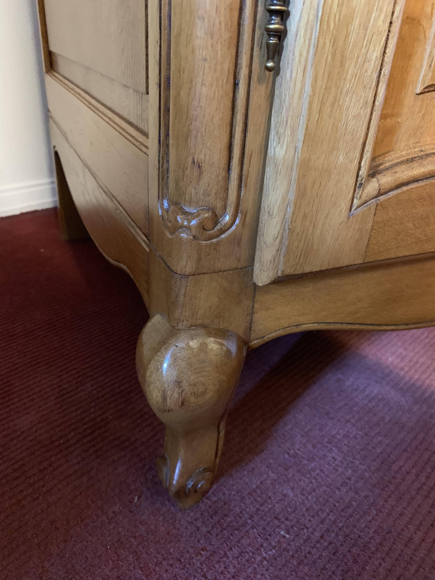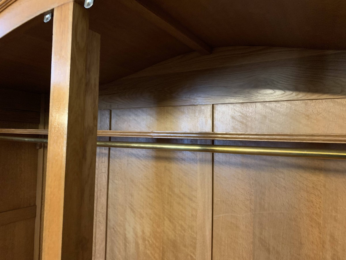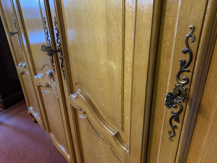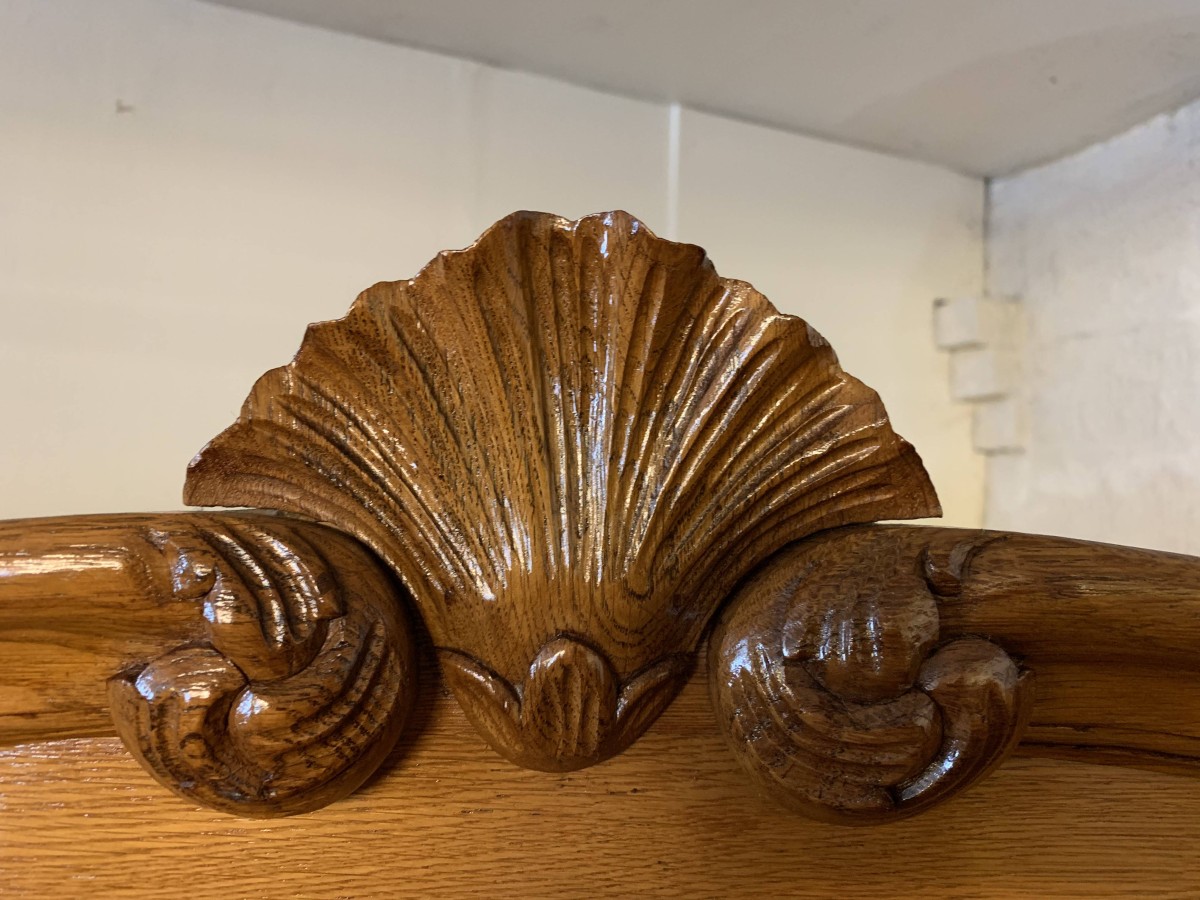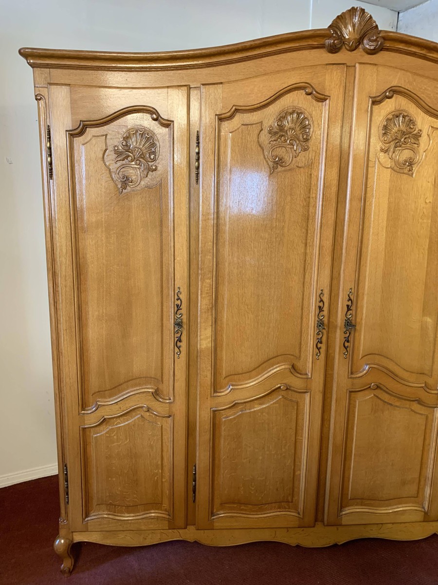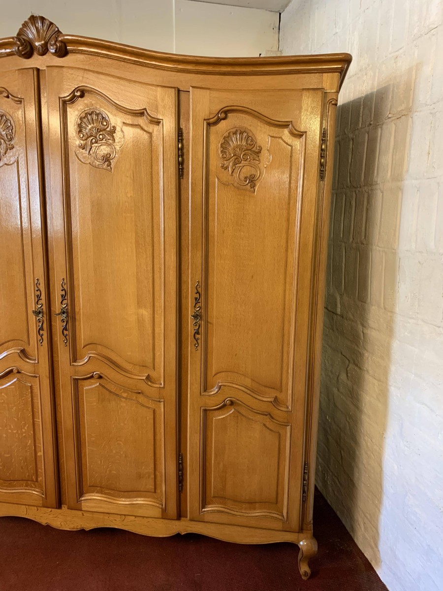 The shaped over sailing top rises to a decorative central fan carving. Below are four carved recessed panelled lockable doors, each door having brass hinges decorative brass escutcheon and key. The left hand door and central pair of doors open to reveal a storage shelf above a brass hanging rail. The right-hand door opens to reveal three adjustable and removable shelves, one shelf having handy sliding drawer below. Recessed panelled sides shaped skirt, this fantastic armoire stands on a pair of shaped carved cabriole legs to the front. Please note this wardrobe splits down for easy transportation and delivery into any home.