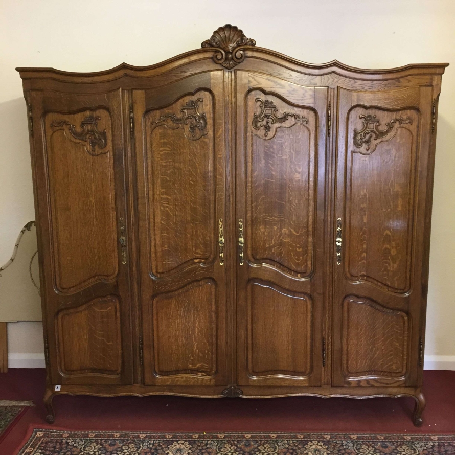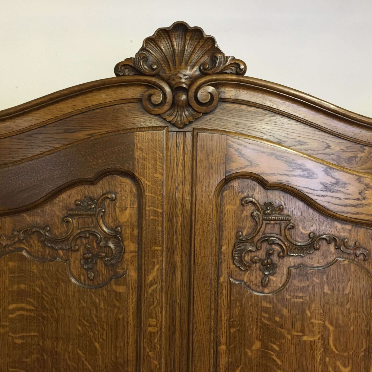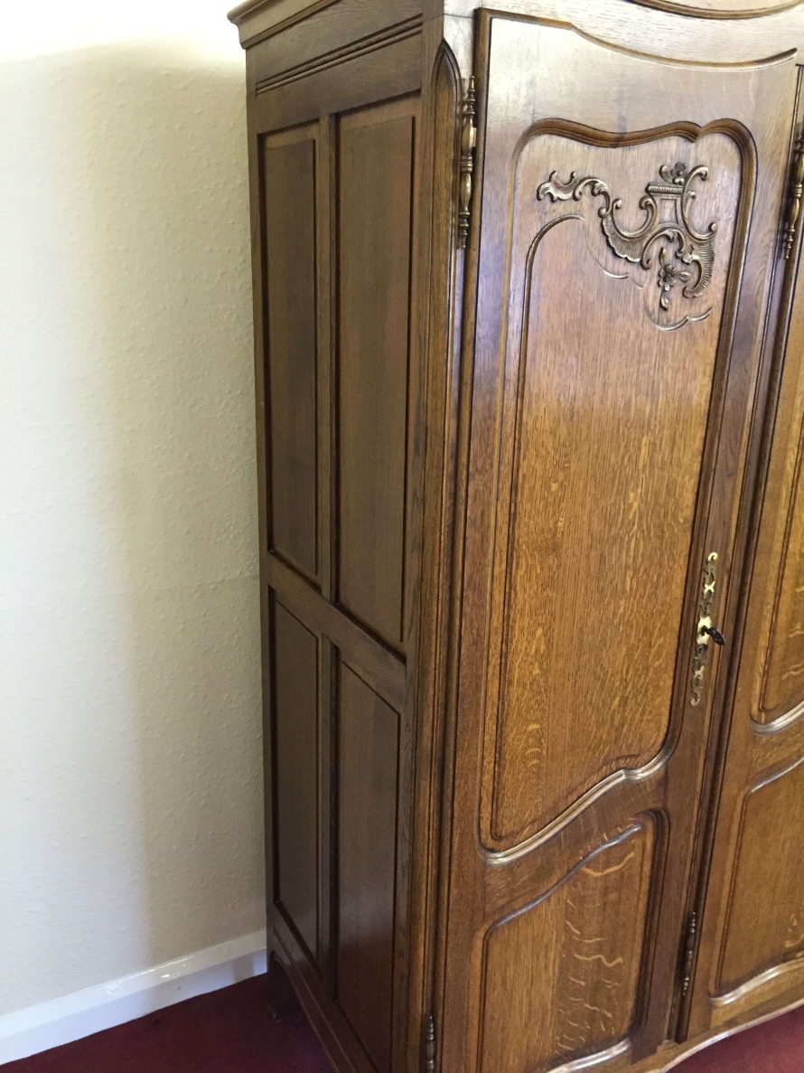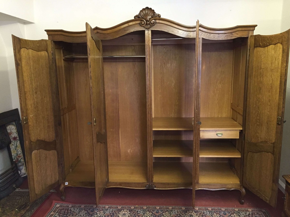 Carved oak paneled doors open to reveal shelving, hanging rail and ample storage space. This wardrobe is made of solid oak and splits down for easy transportation and delivery.