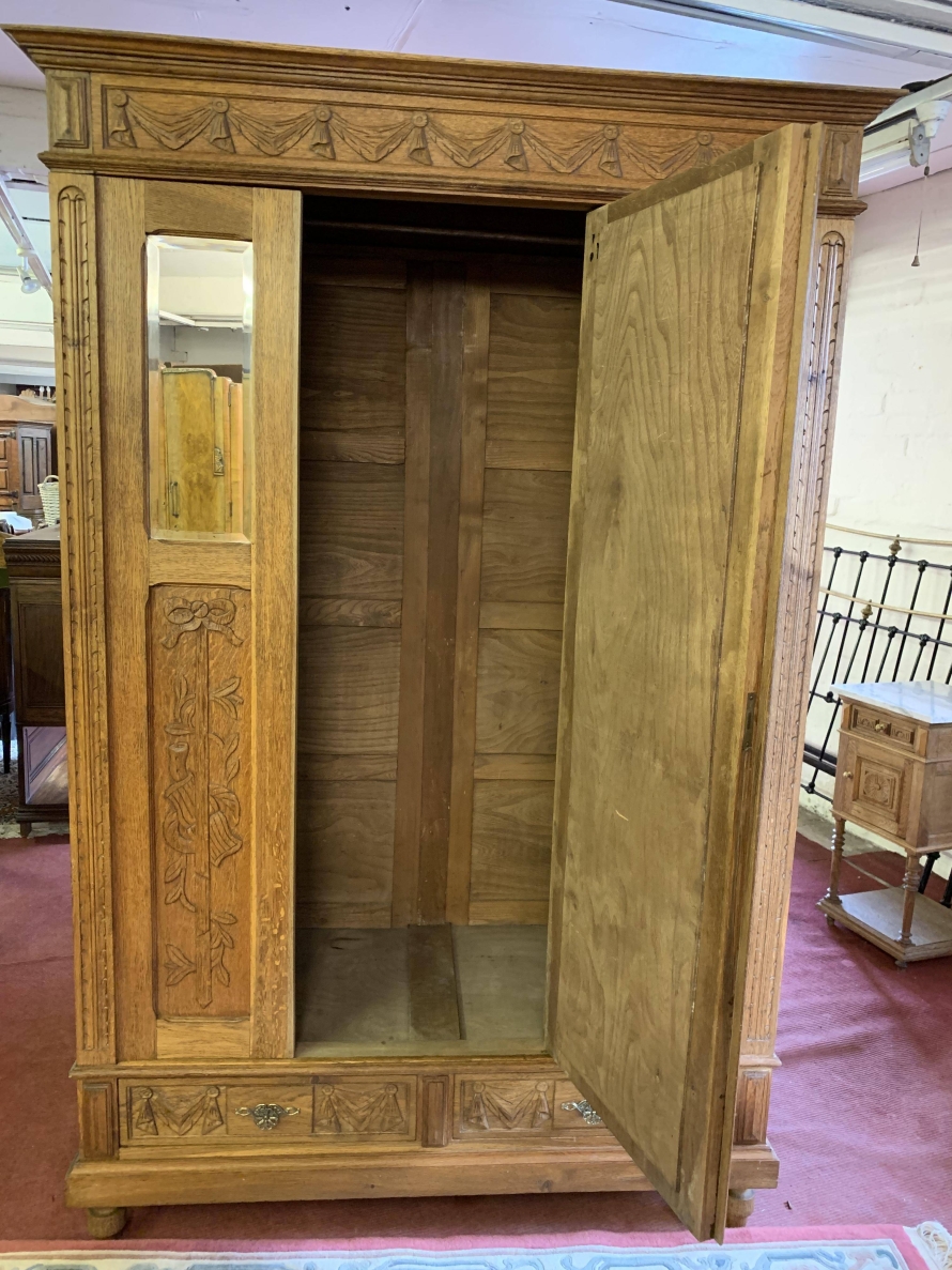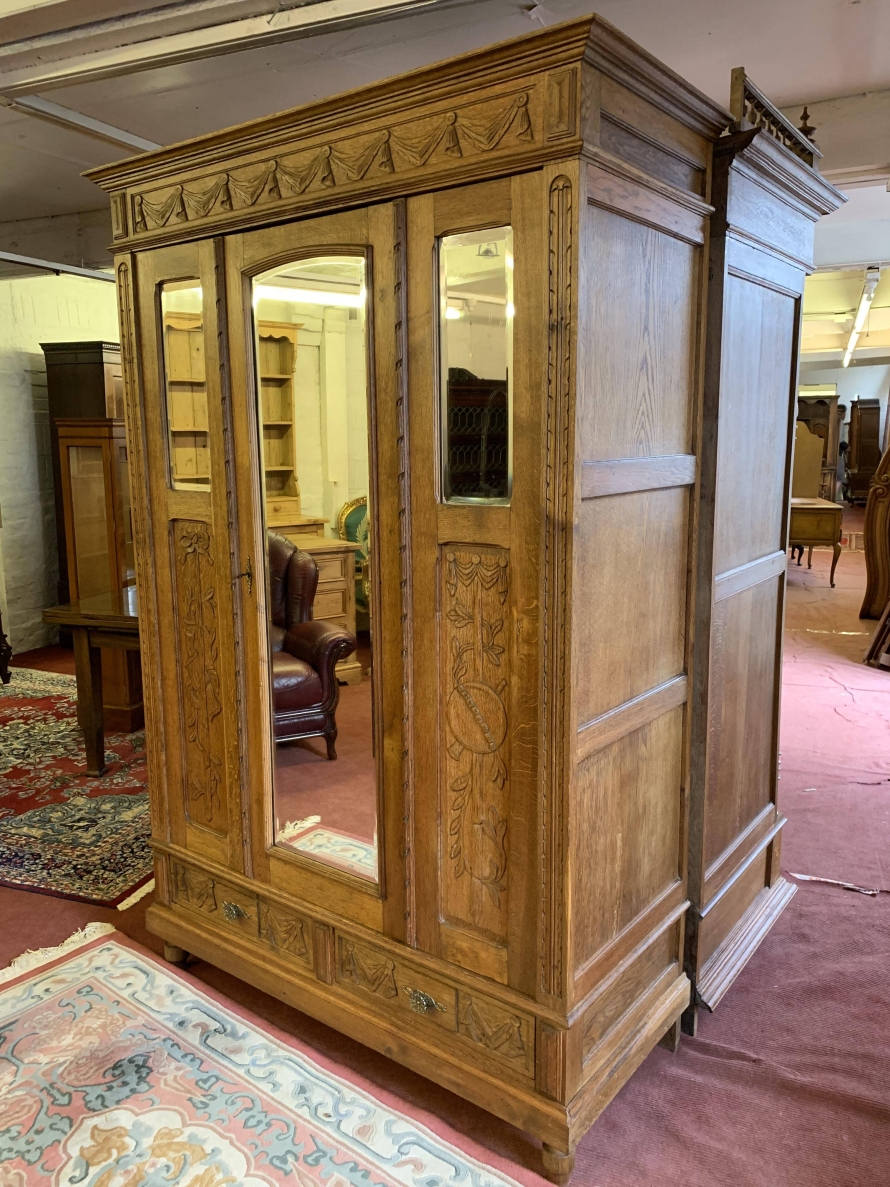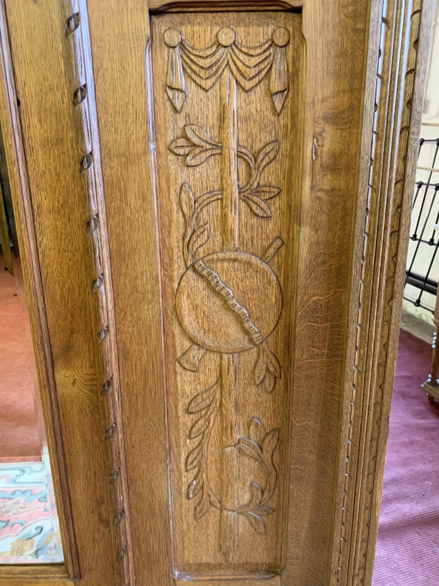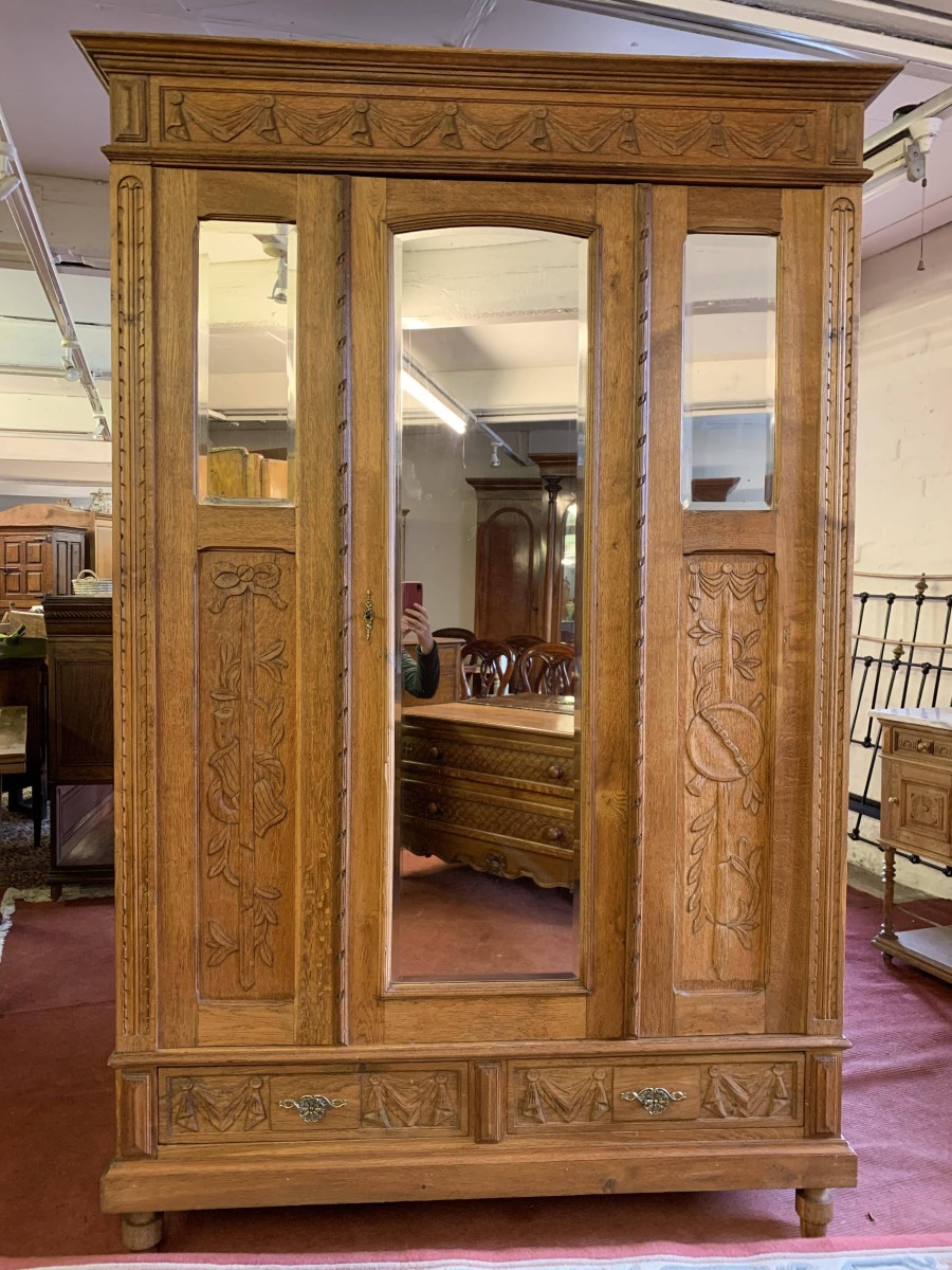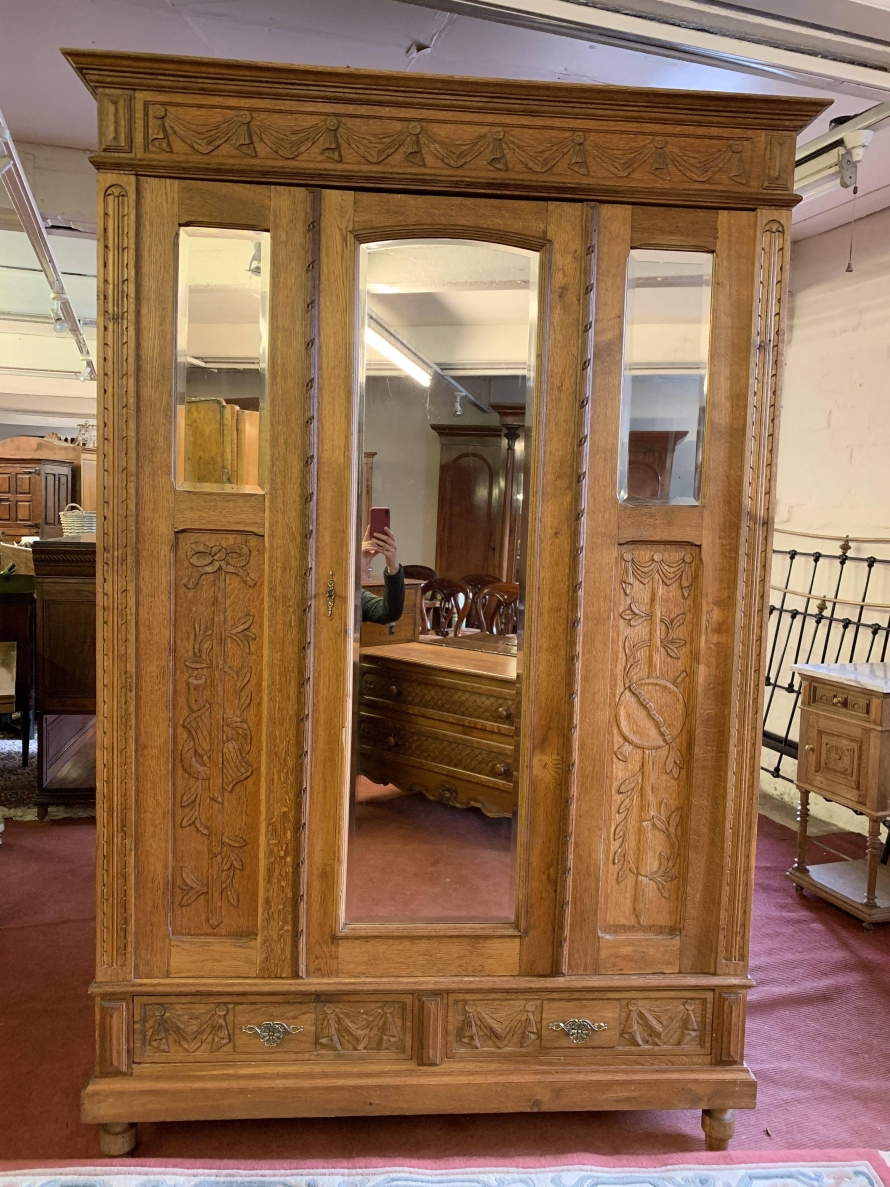 The cornice has a decorative carving. Below is a full length lockable door. To the sides are a pair of bevelled mirrors with fine decorative carvings below. The door opens to reveal a full length hanging rail. Below the door is a pair of carved drawers each drawer having decorative brass handle. This beautiful armoire stands proud on a pair of turned legs to the front. Please note this wardrobe splits down for easy transportation and delivery into any home.