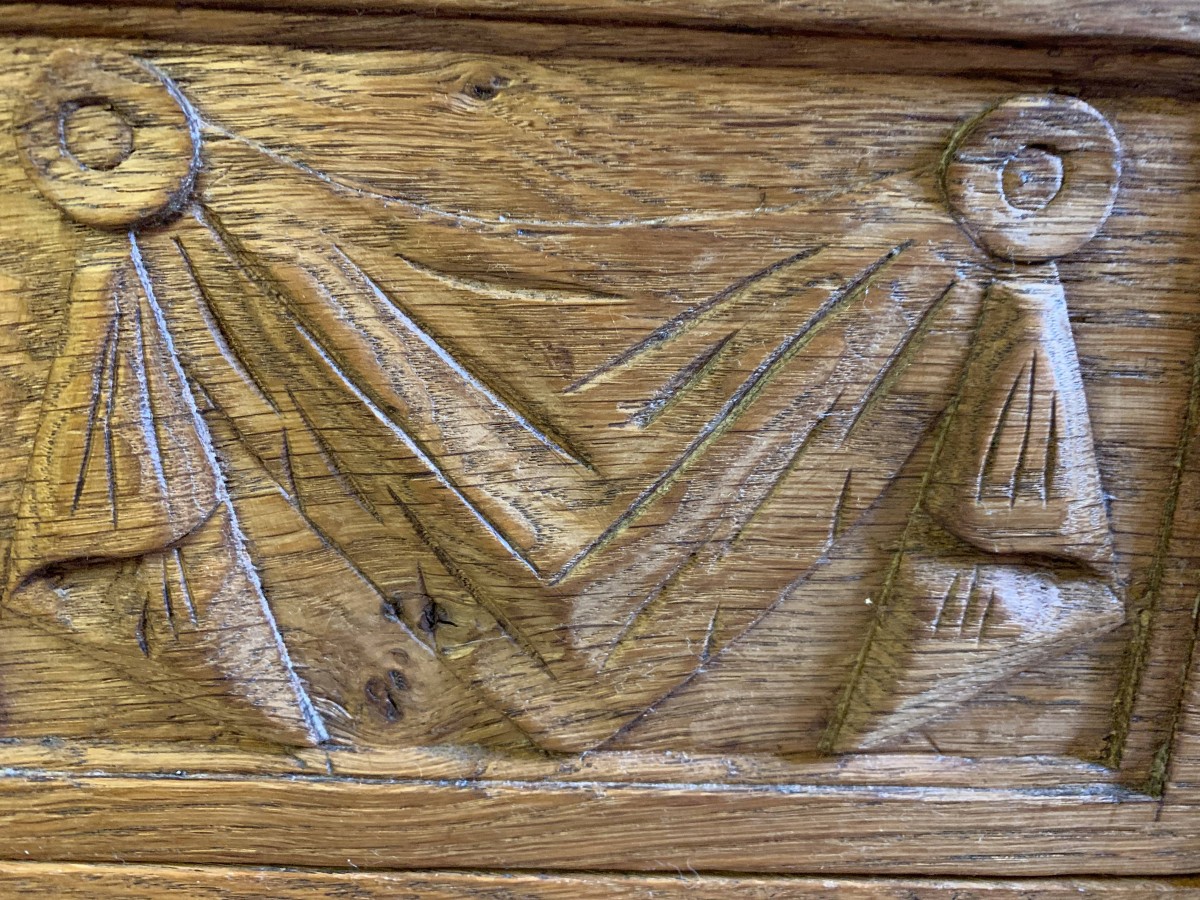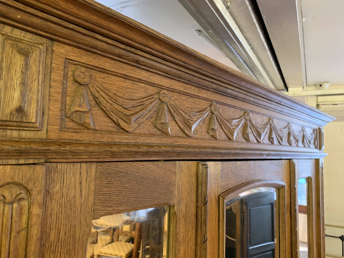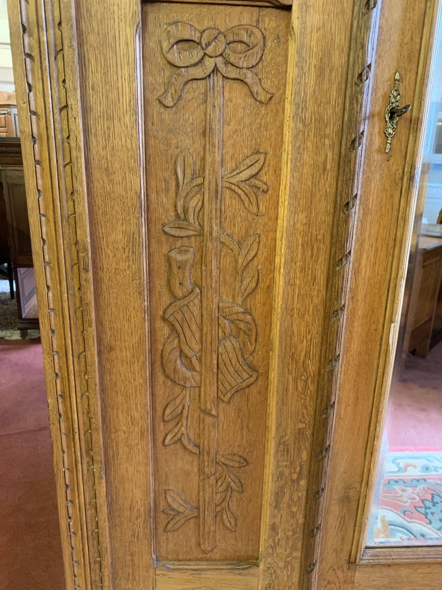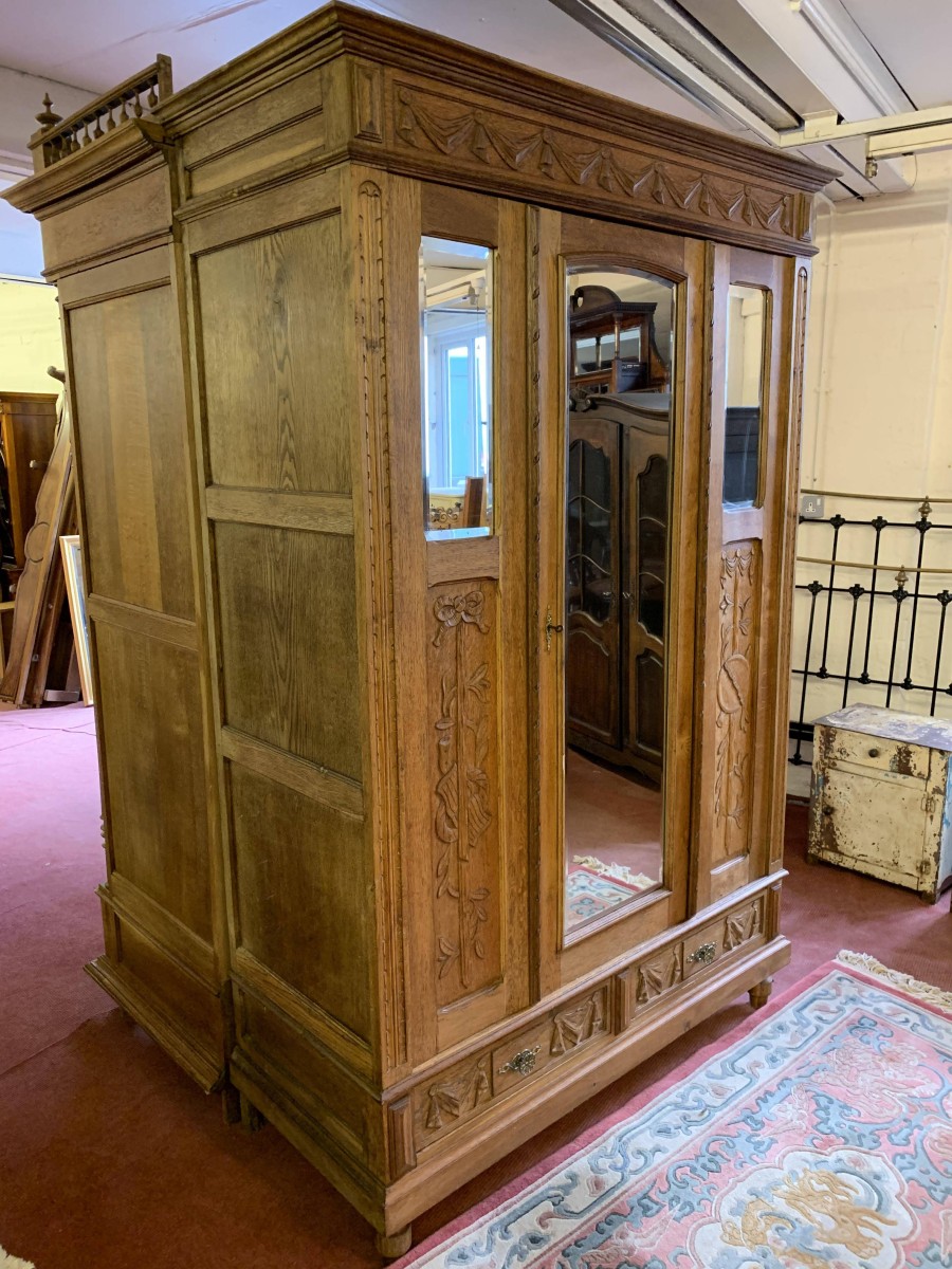 The cornice has a decorative carving. Below is a full length lockable door. To the sides are a pair of bevelled mirrors with fine decorative carvings below. The door opens to reveal a full length hanging rail. Below the door is a pair of carved drawers each drawer having decorative brass handle. This beautiful armoire stands proud on a pair of turned legs to the front. Please note this wardrobe splits down for easy transportation and delivery into any home.