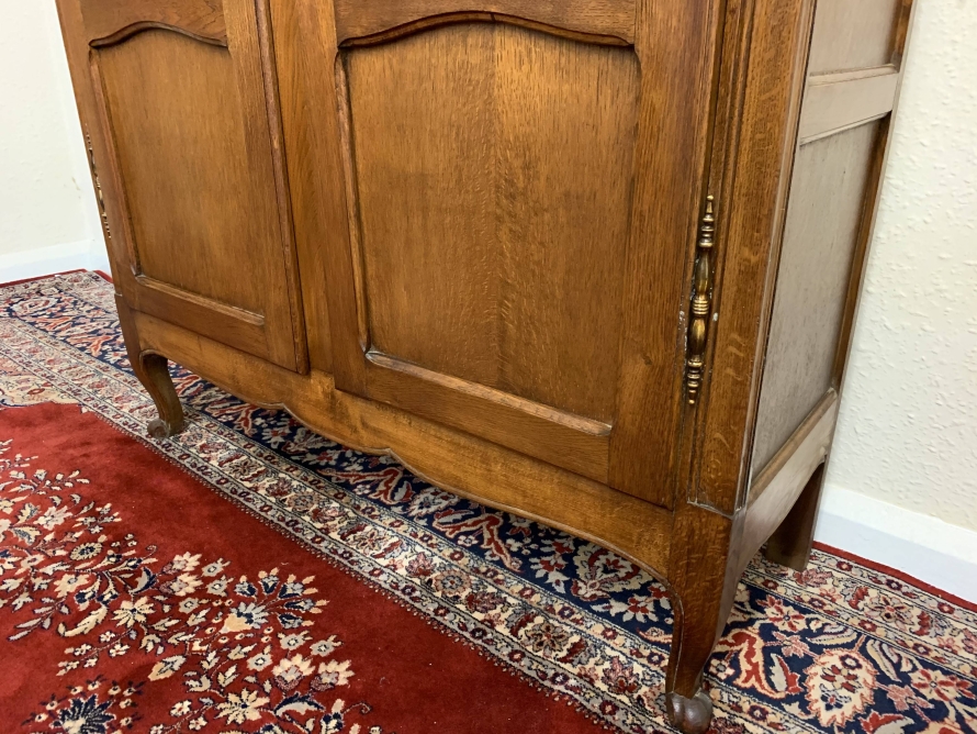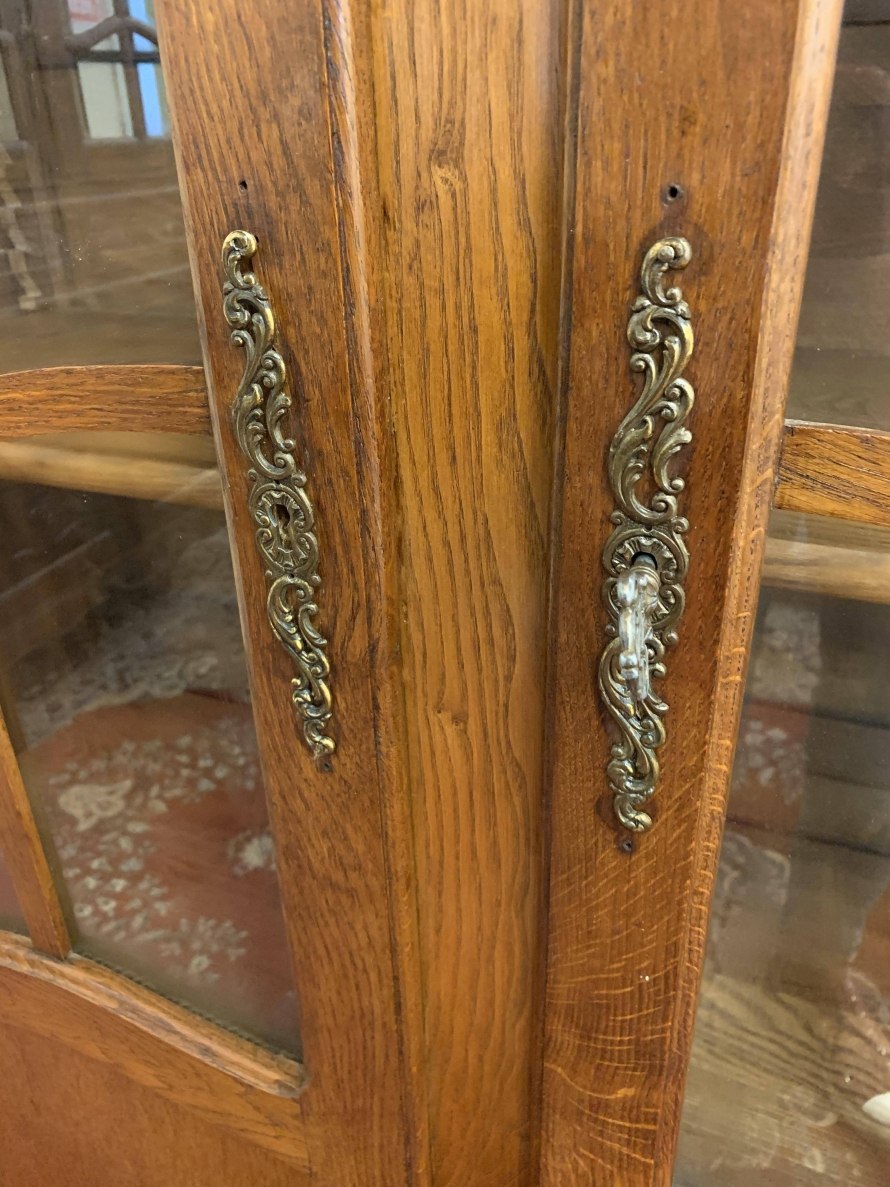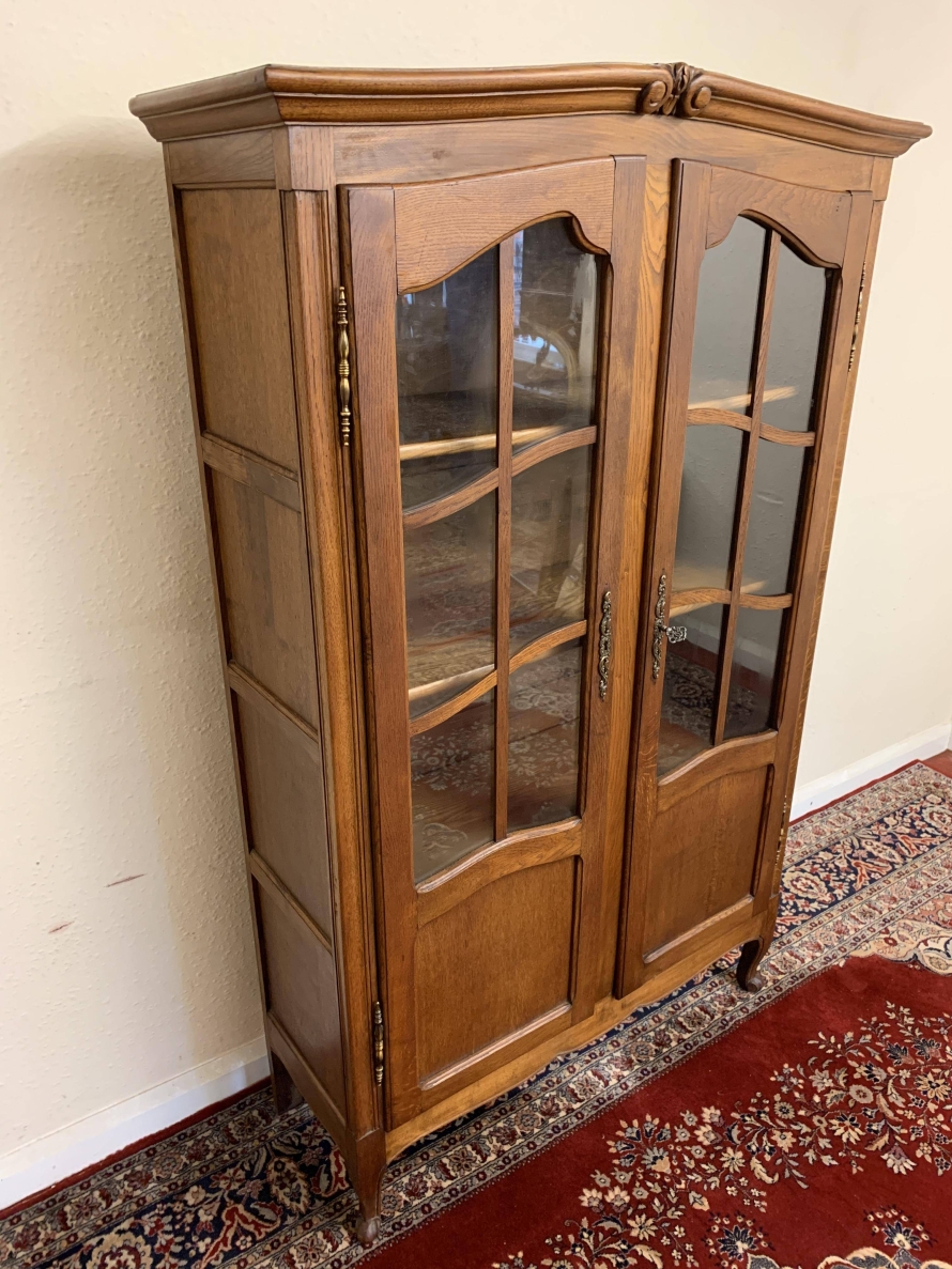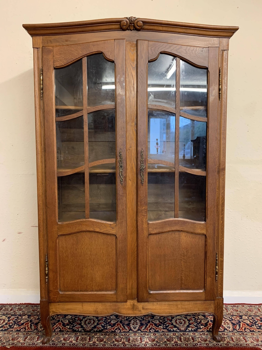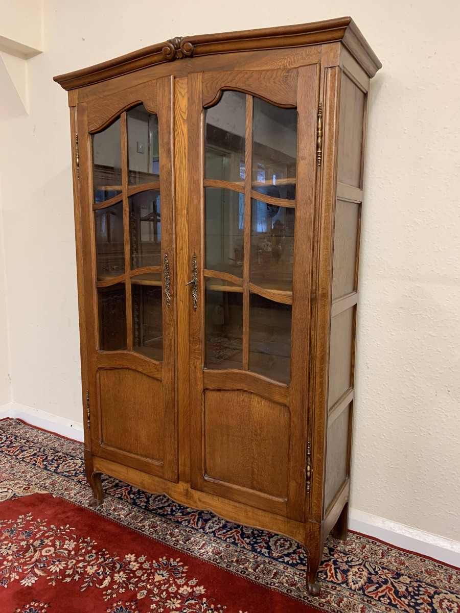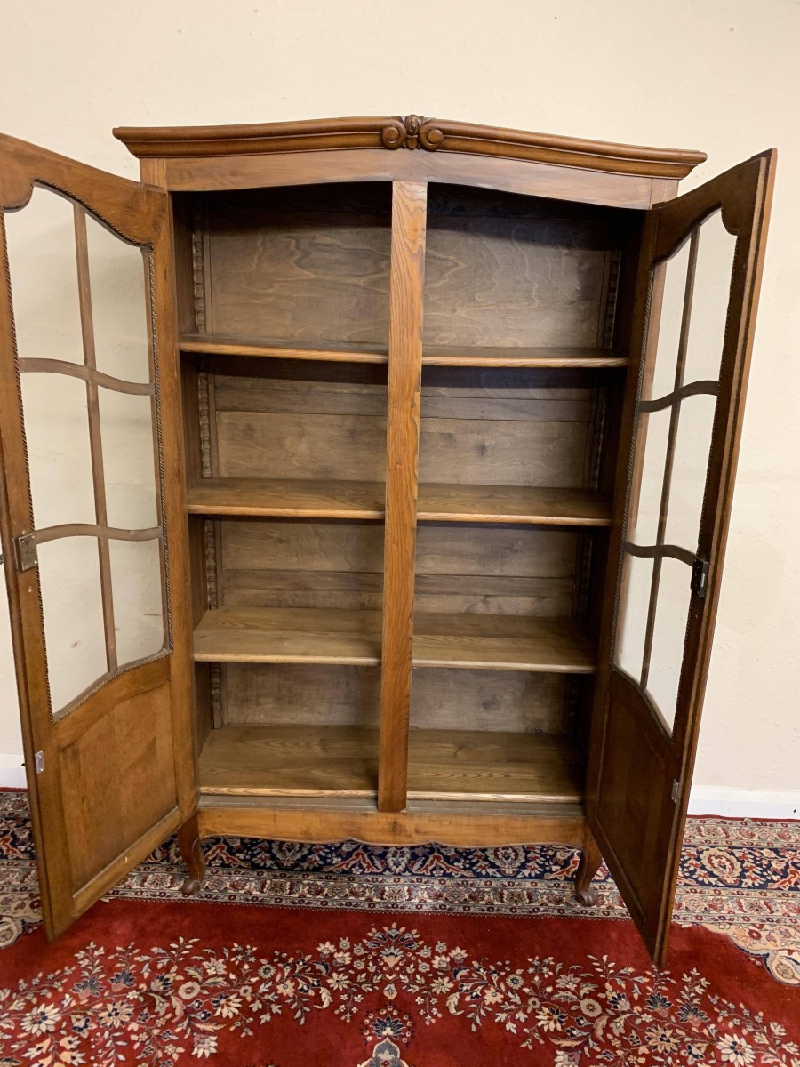 The shaped top rises to a central carving. Below are a pair of lockable doors, each door having glazing above a shaped recessed panel. Each door has brass hinges and decorative brass escutcheon. The doors open to reveal three adjustable and removable shelves. Recessed panelled sides, shaped skirt, this fine bookcase stands on two shaped cabriole legs to the front.