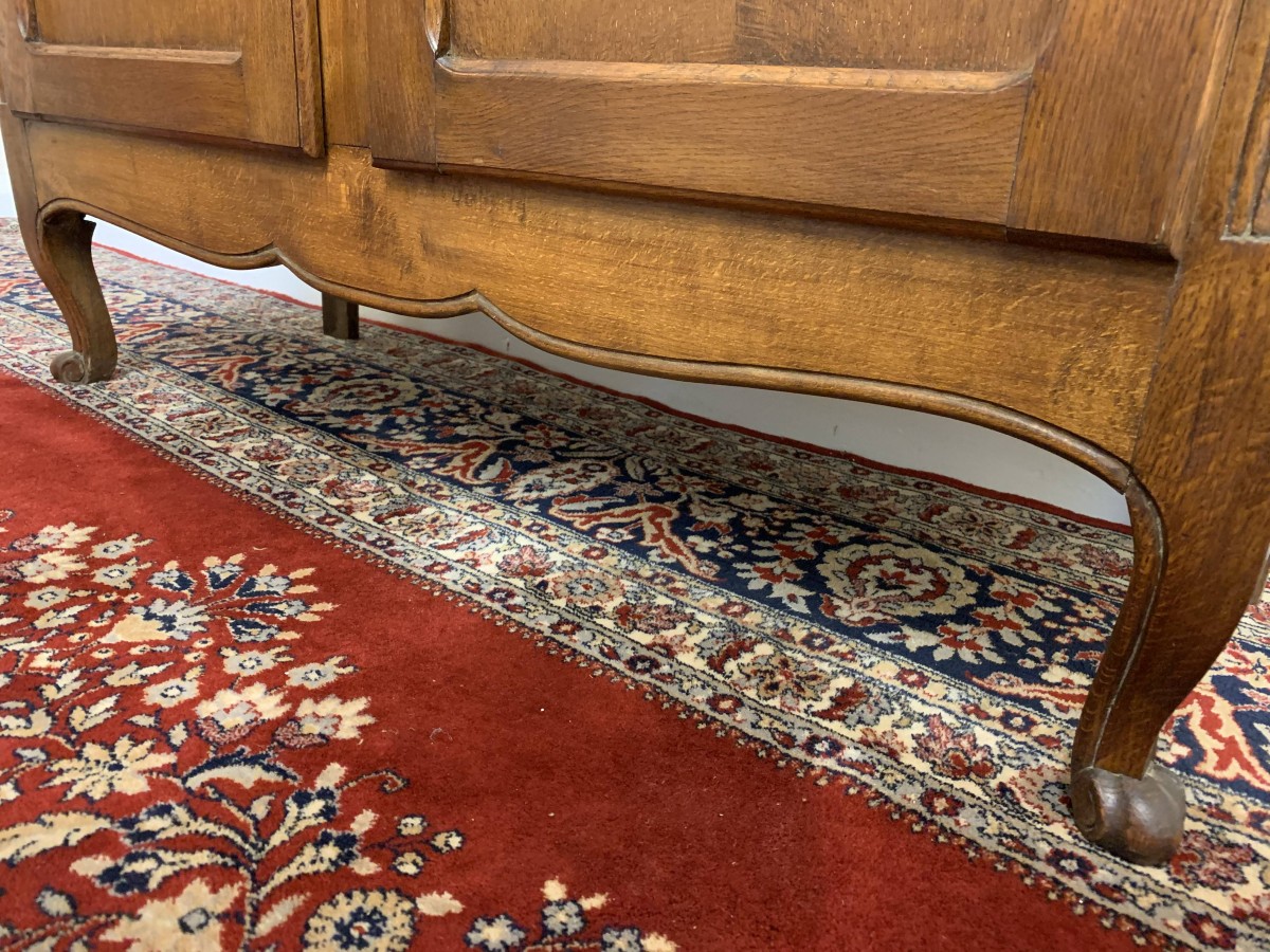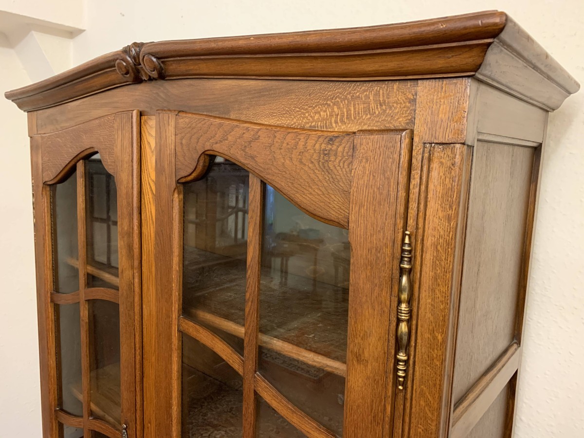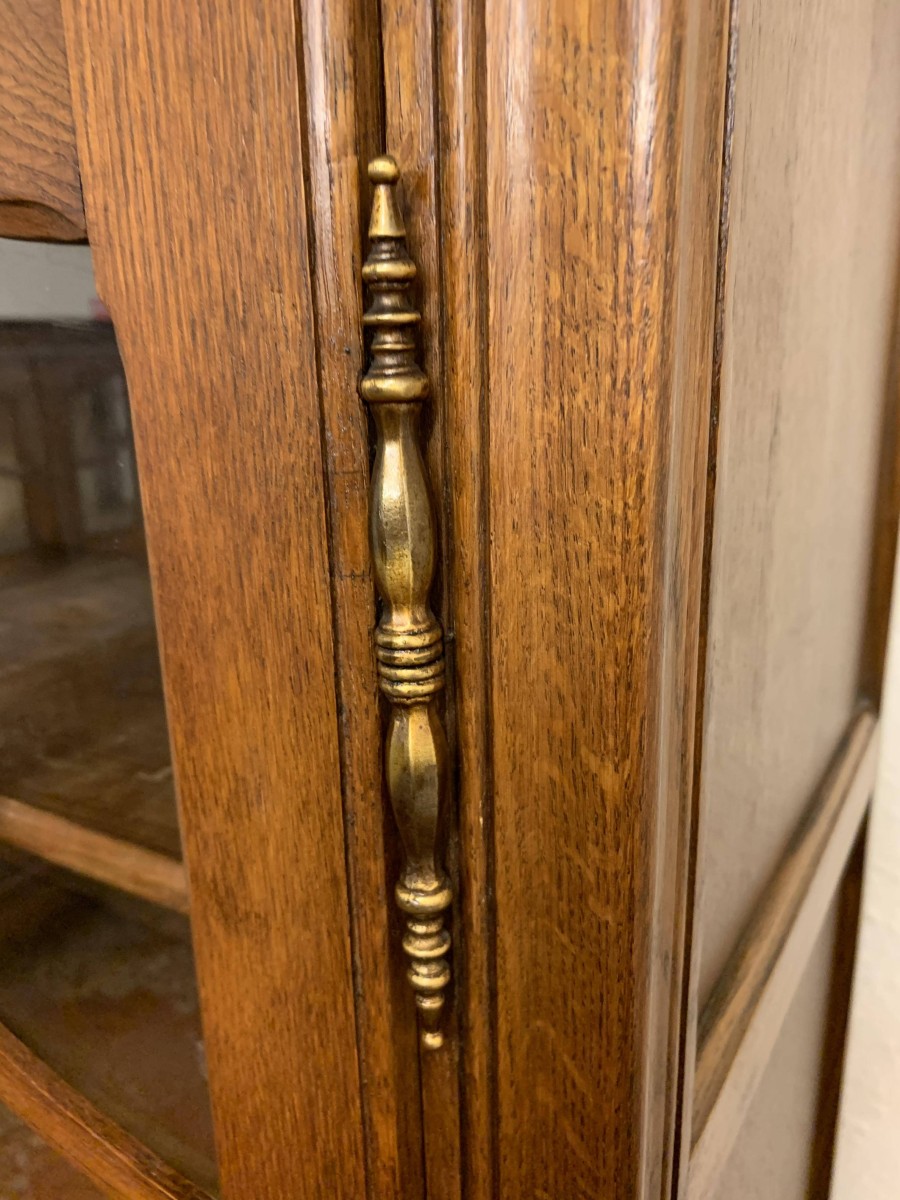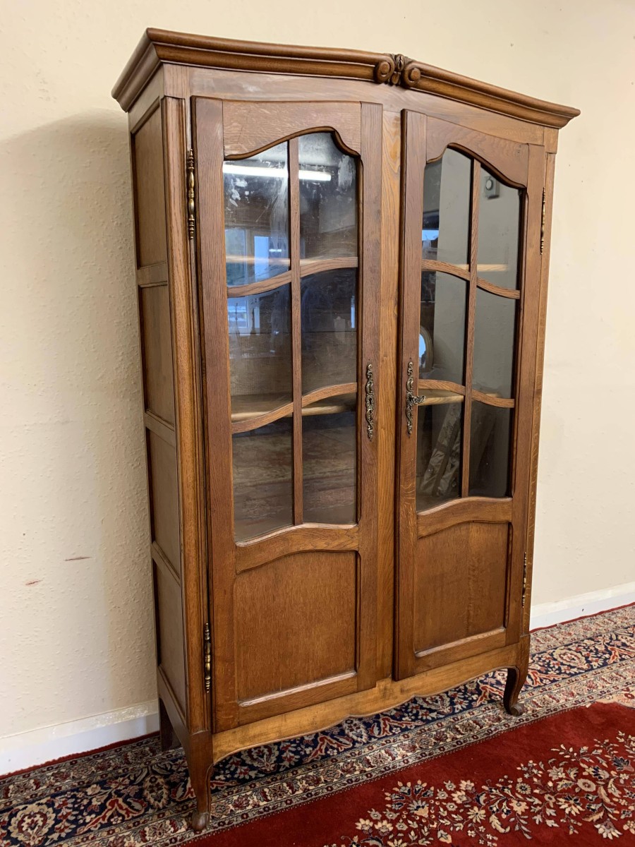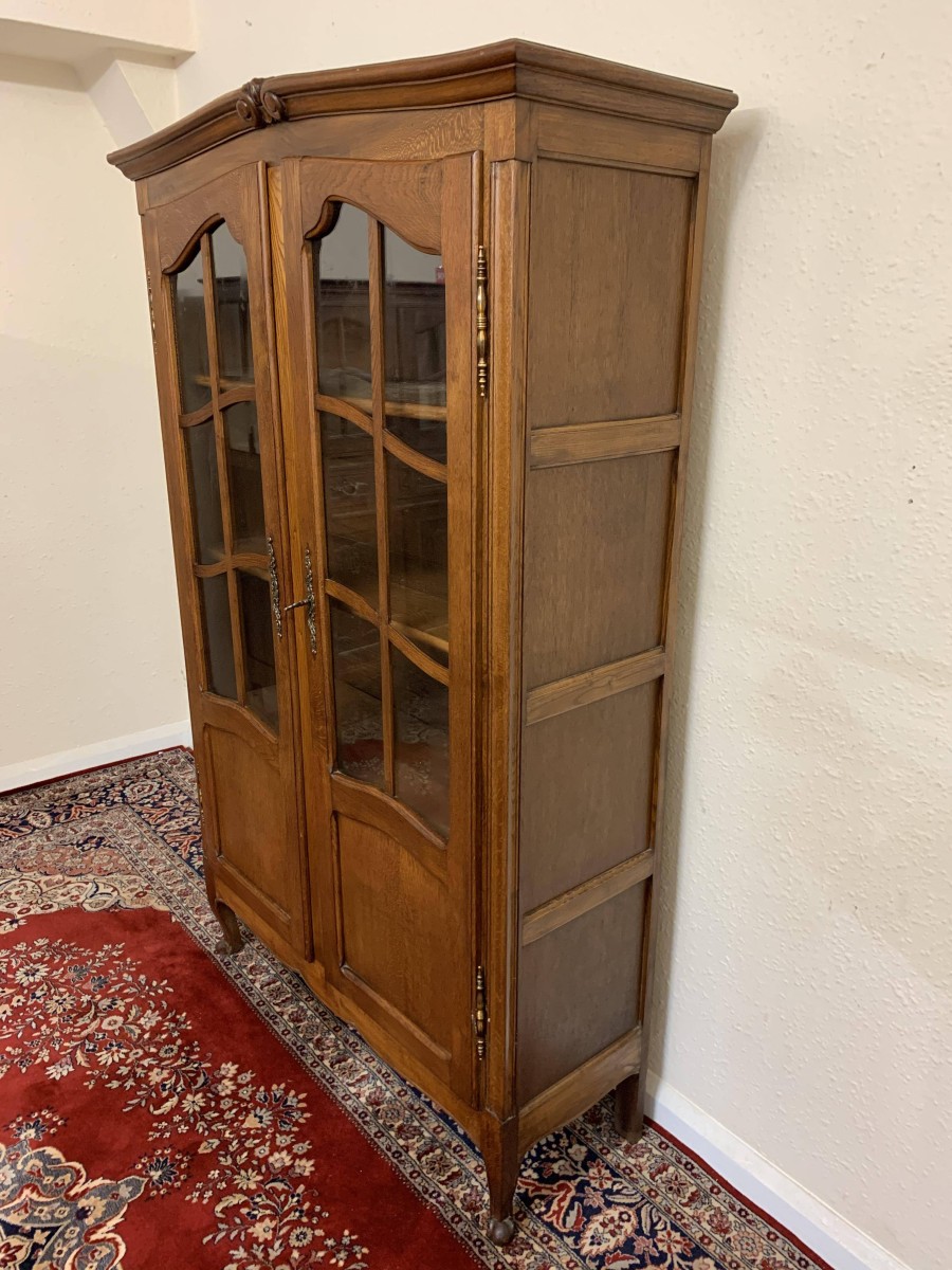 The shaped top rises to a central carving. Below are a pair of lockable doors, each door having glazing above a shaped recessed panel. Each door has brass hinges and decorative brass escutcheon. The doors open to reveal three adjustable and removable shelves. Recessed panelled sides, shaped skirt, this fine bookcase stands on two shaped cabriole legs to the front.