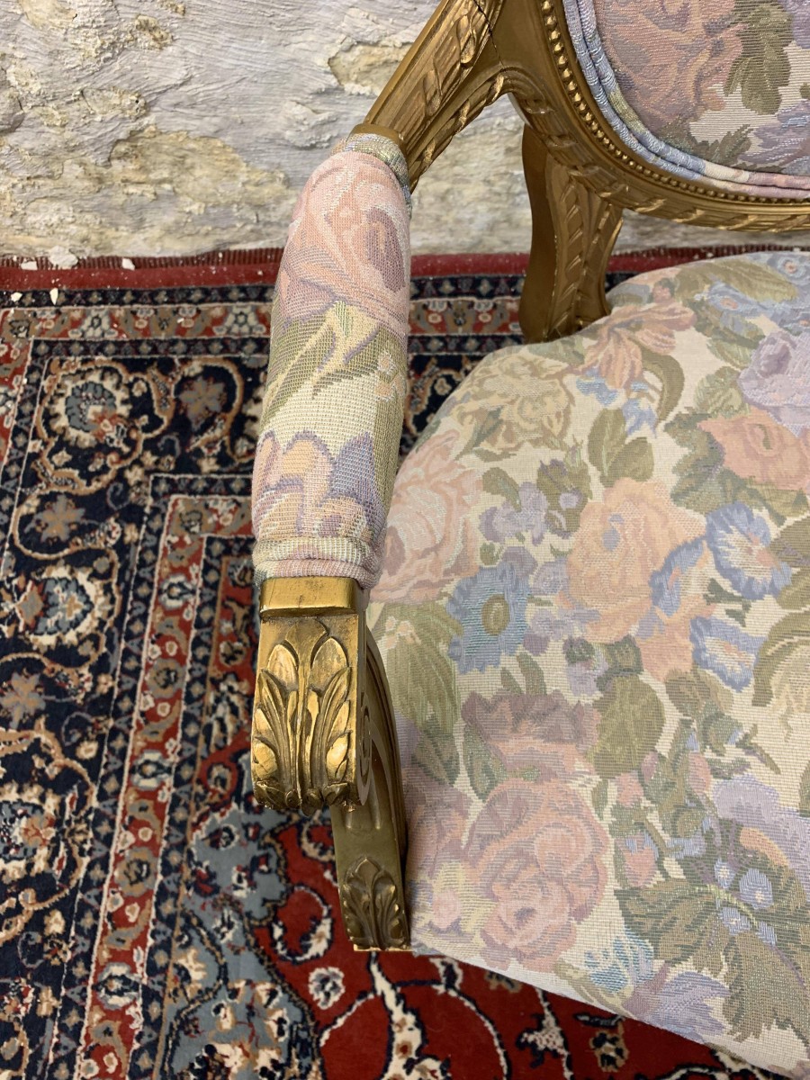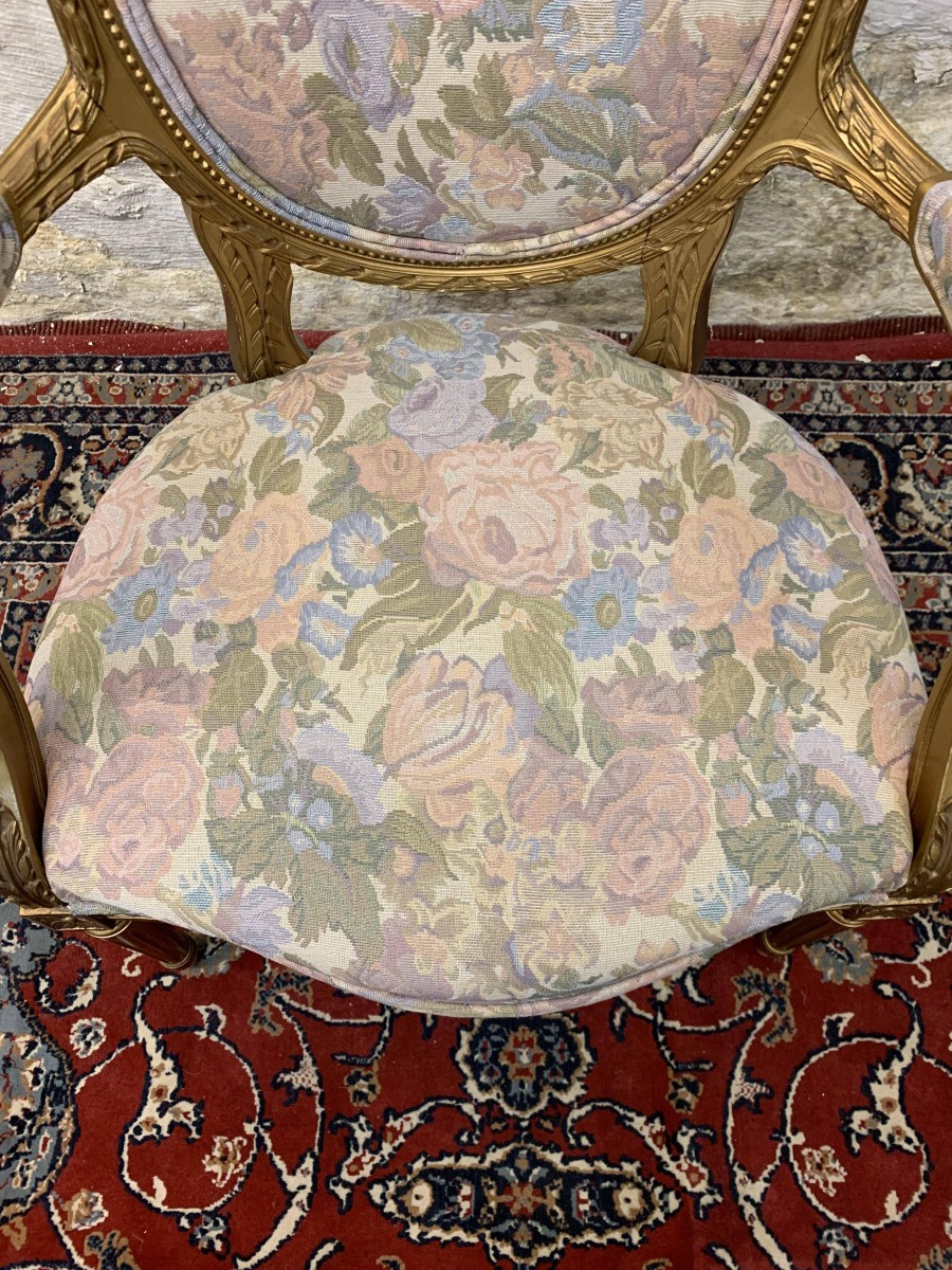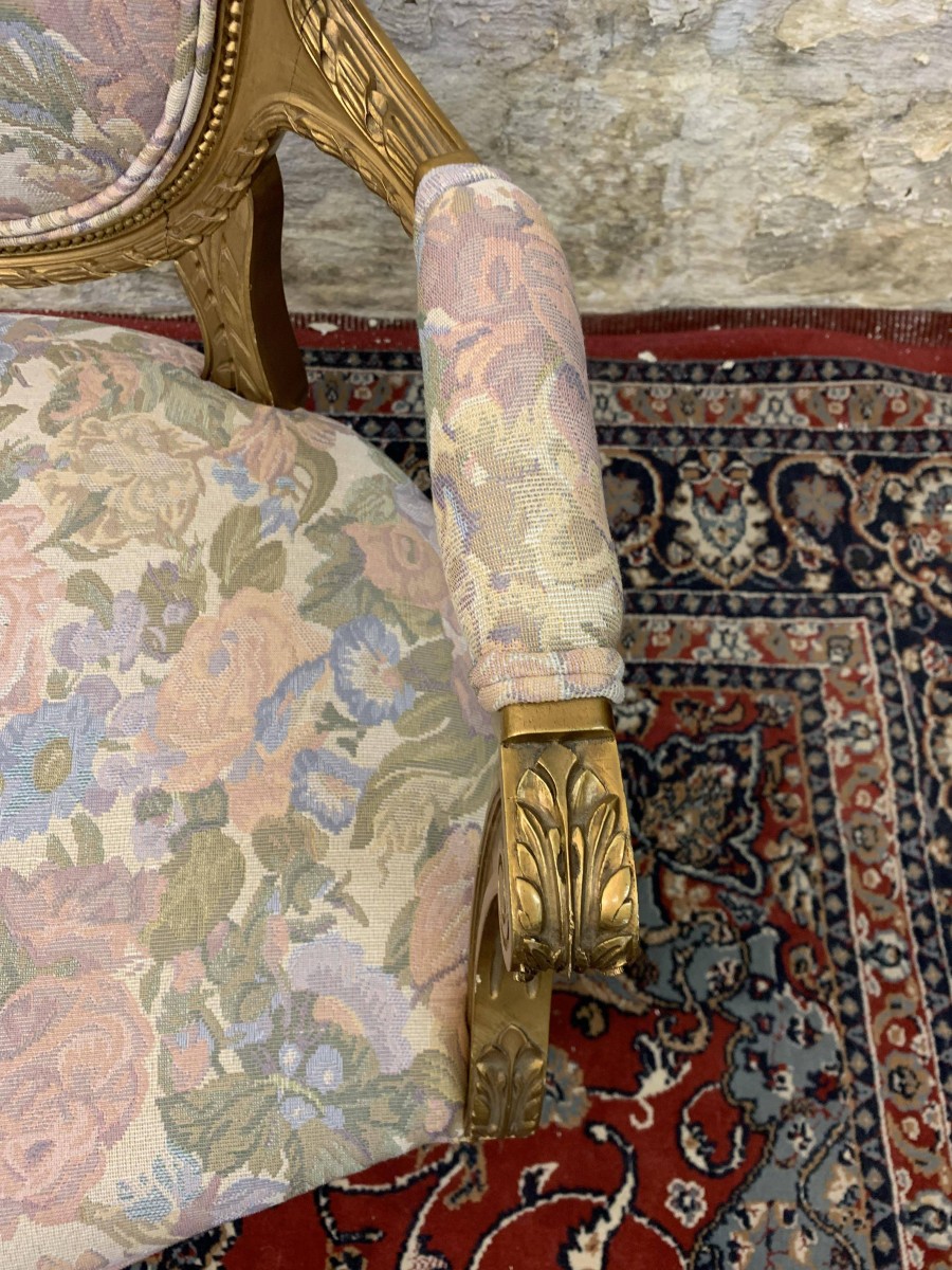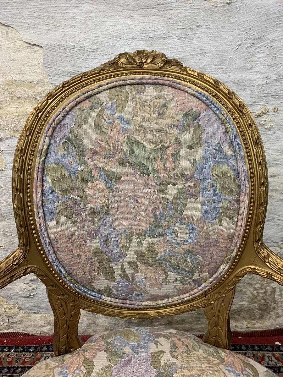 This lovely French chair is in excellent condition. The cameo back having a carved gilt frame with a upholstered cushioned back rest. Two shaped carved arms having two upholstered cushioned armrests. Cushioned upholstered seat, shaped carved skirt this super chair stands on four reeded tapered legs. The chair has floral upholstery which is in excellent condition.