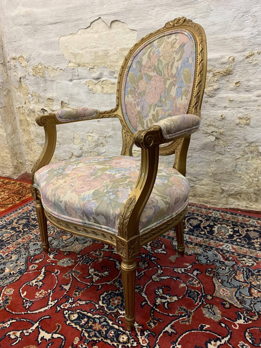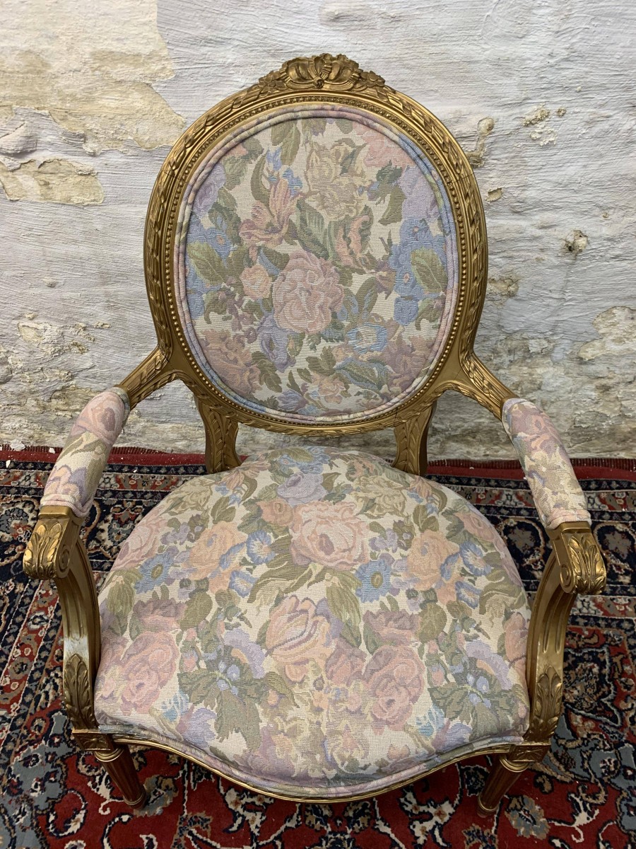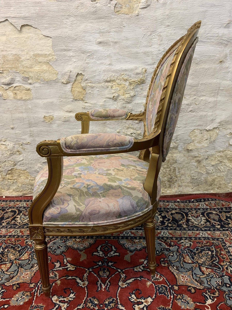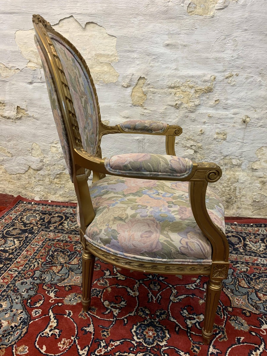 This lovely French chair is in excellent condition. The cameo back having a carved gilt frame with a upholstered cushioned back rest. Two shaped carved arms having two upholstered cushioned armrests. Cushioned upholstered seat, shaped carved skirt this super chair stands on four reeded tapered legs. The chair has floral upholstery which is in excellent condition.
