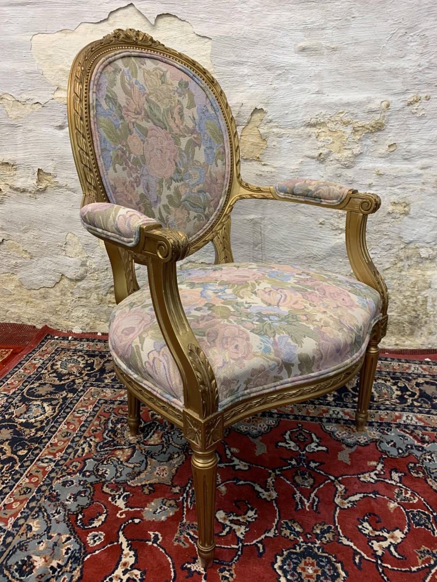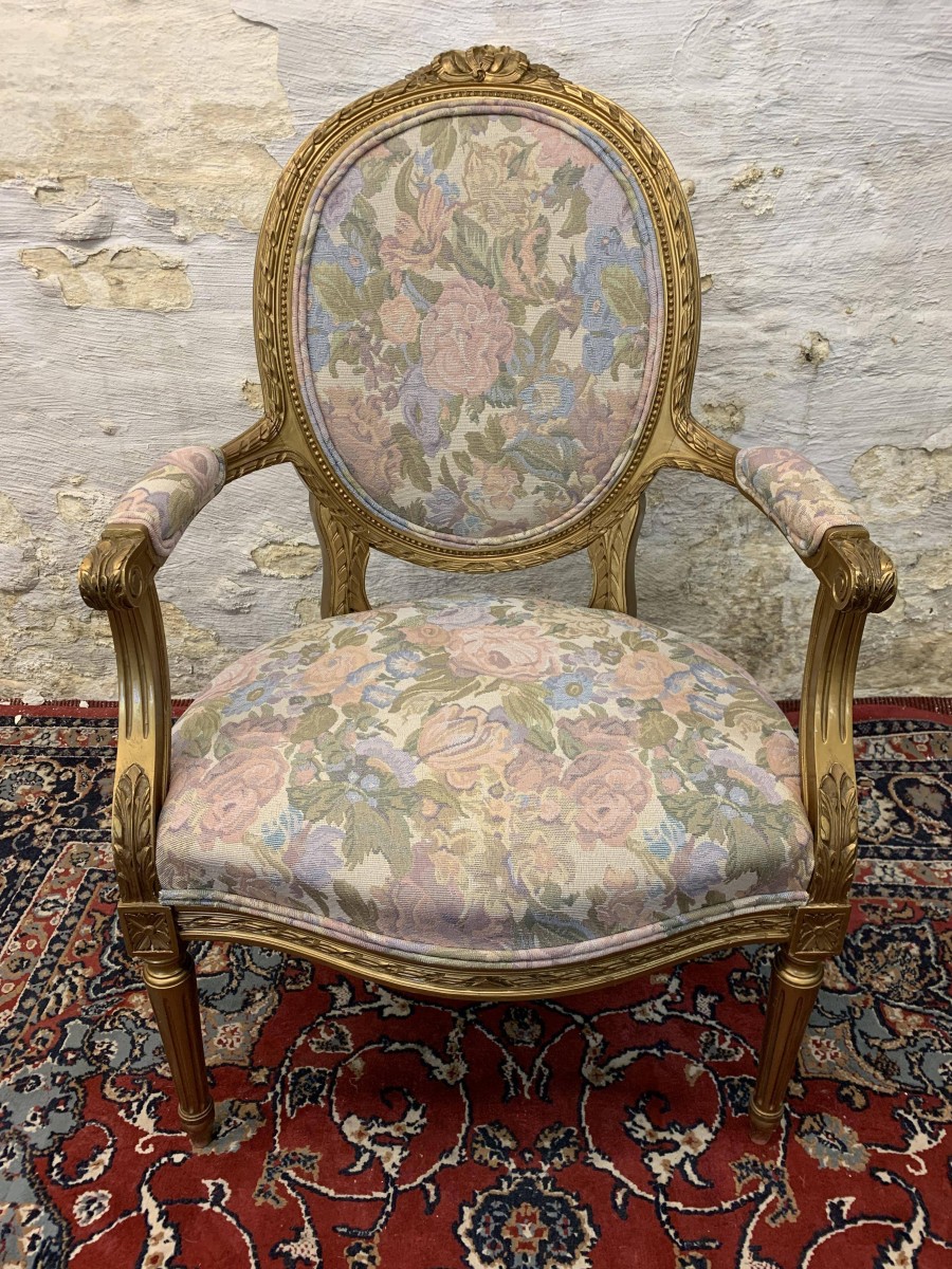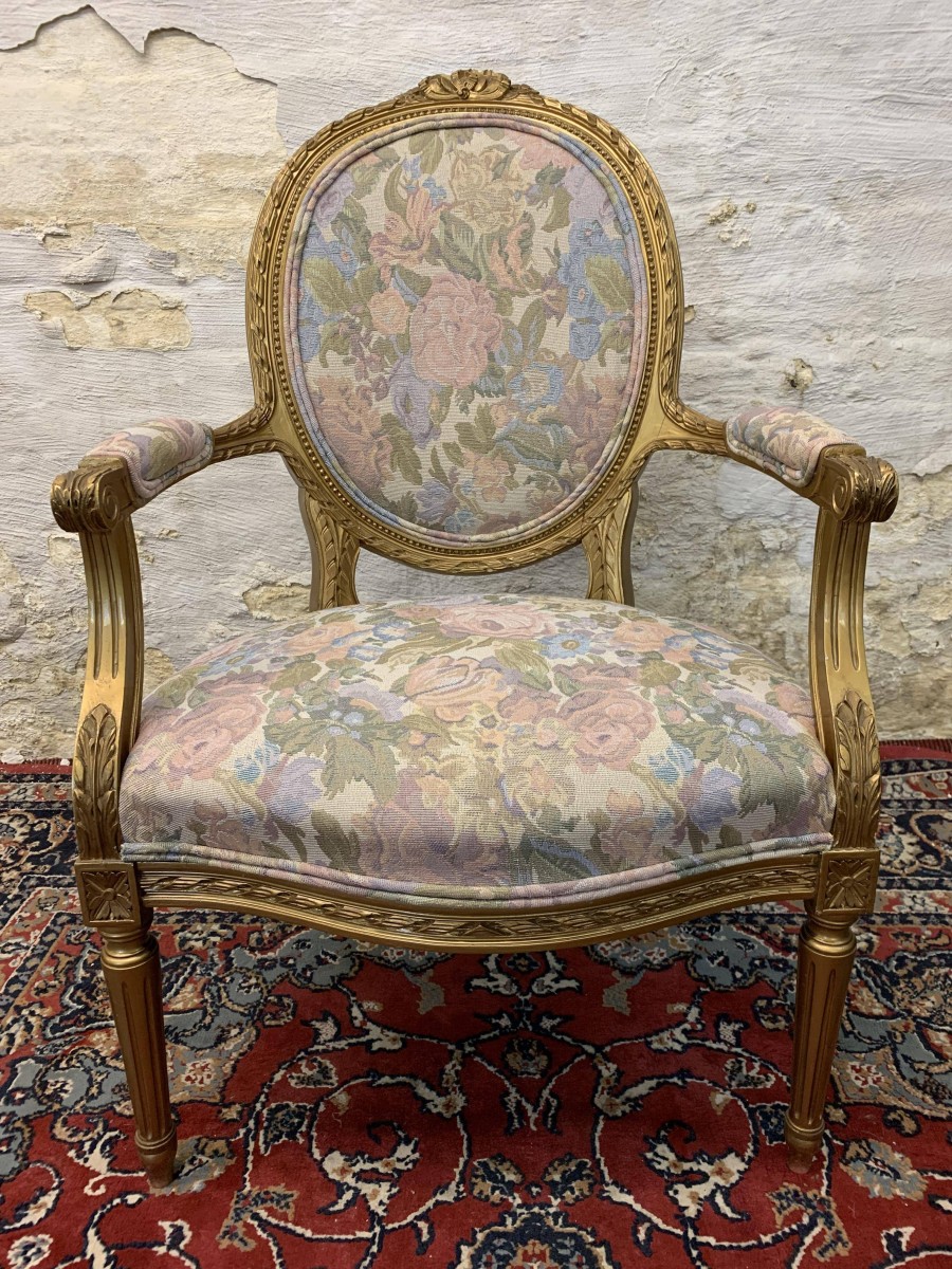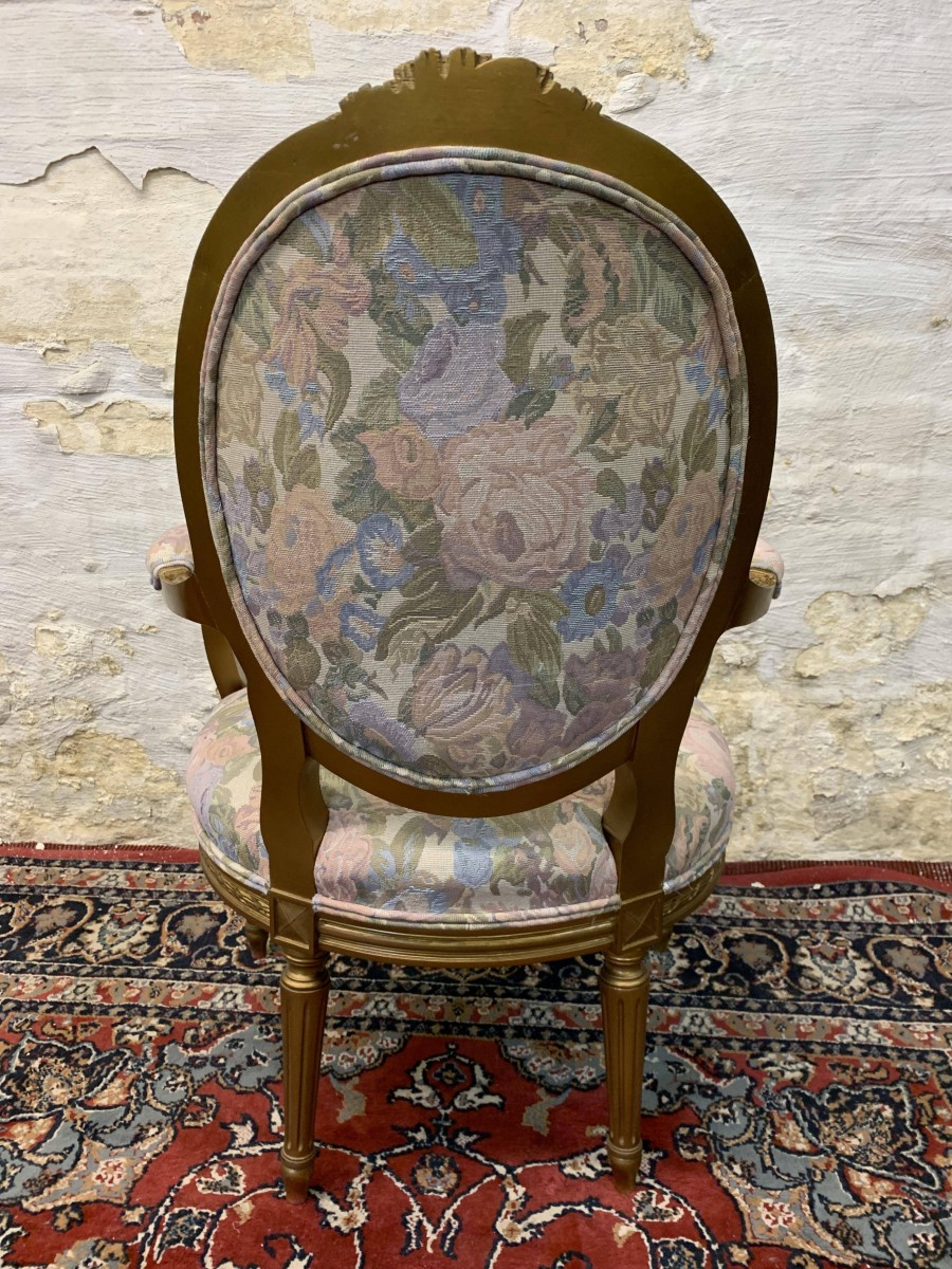 This lovely French chair is in excellent condition. The cameo back having a carved gilt frame with a upholstered cushioned back rest. Two shaped carved arms having two upholstered cushioned armrests. Cushioned upholstered seat, shaped carved skirt this super chair stands on four reeded tapered legs. The chair has floral upholstery which is in excellent condition.