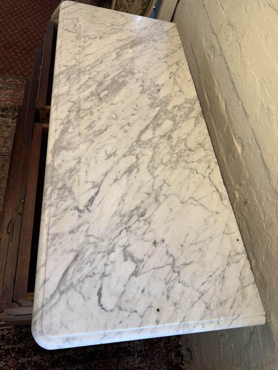 The carrara white marble top sits above a pair of short drawers below which are three long drawers, each short drawer having an ornate brass handle and each long drawer having a pair of ornate brass handles. Shaped skirt and standing on carved cabriole shaped legs to the front.