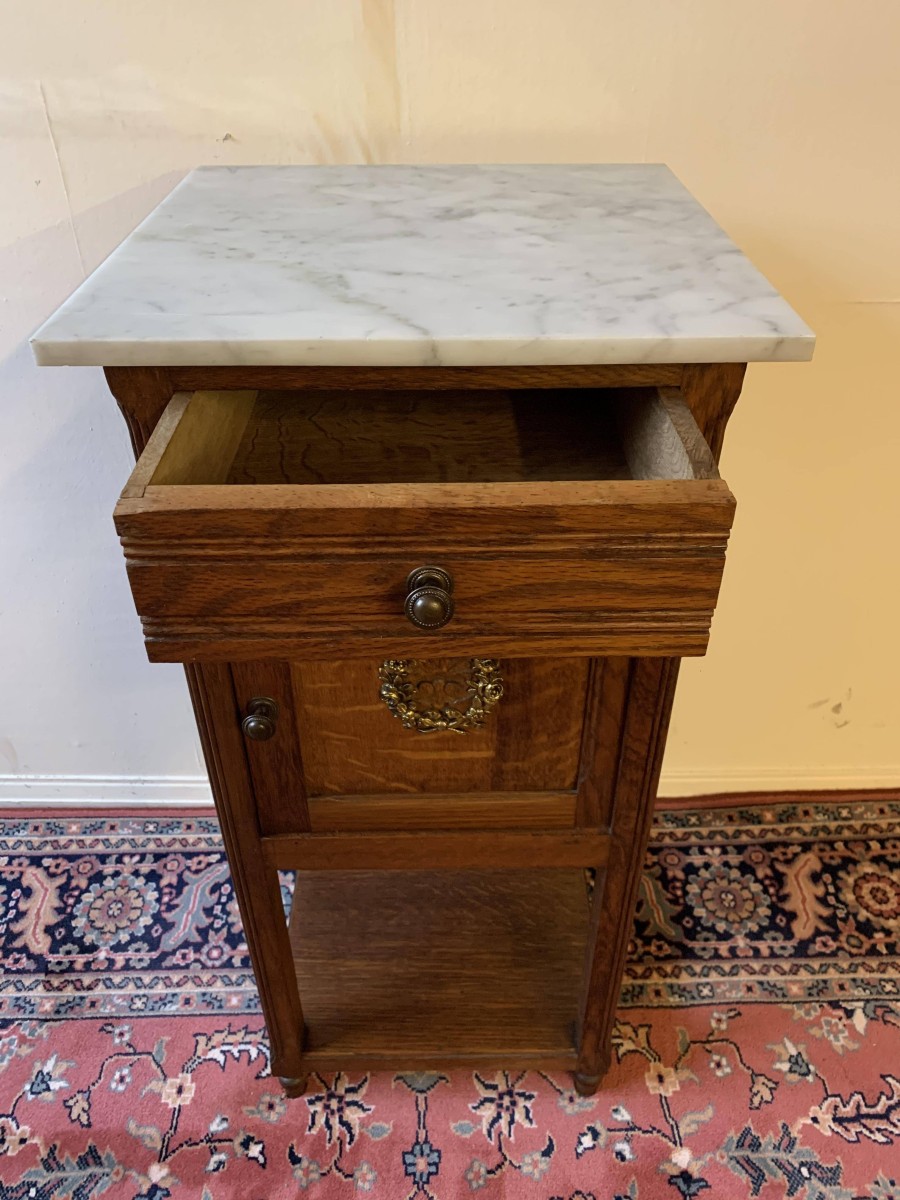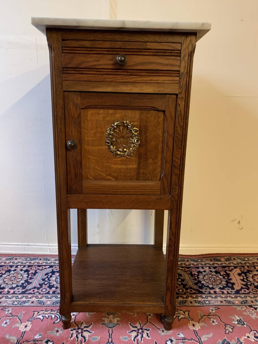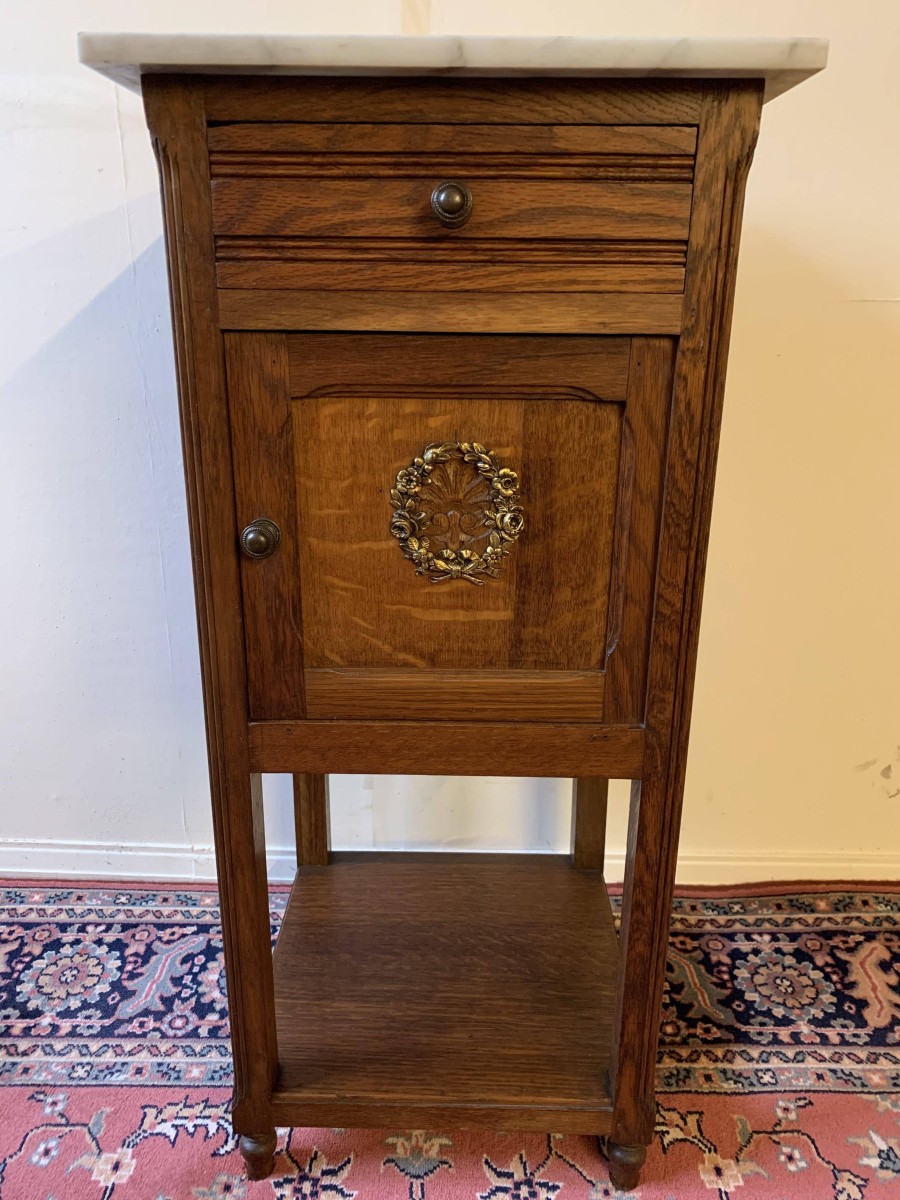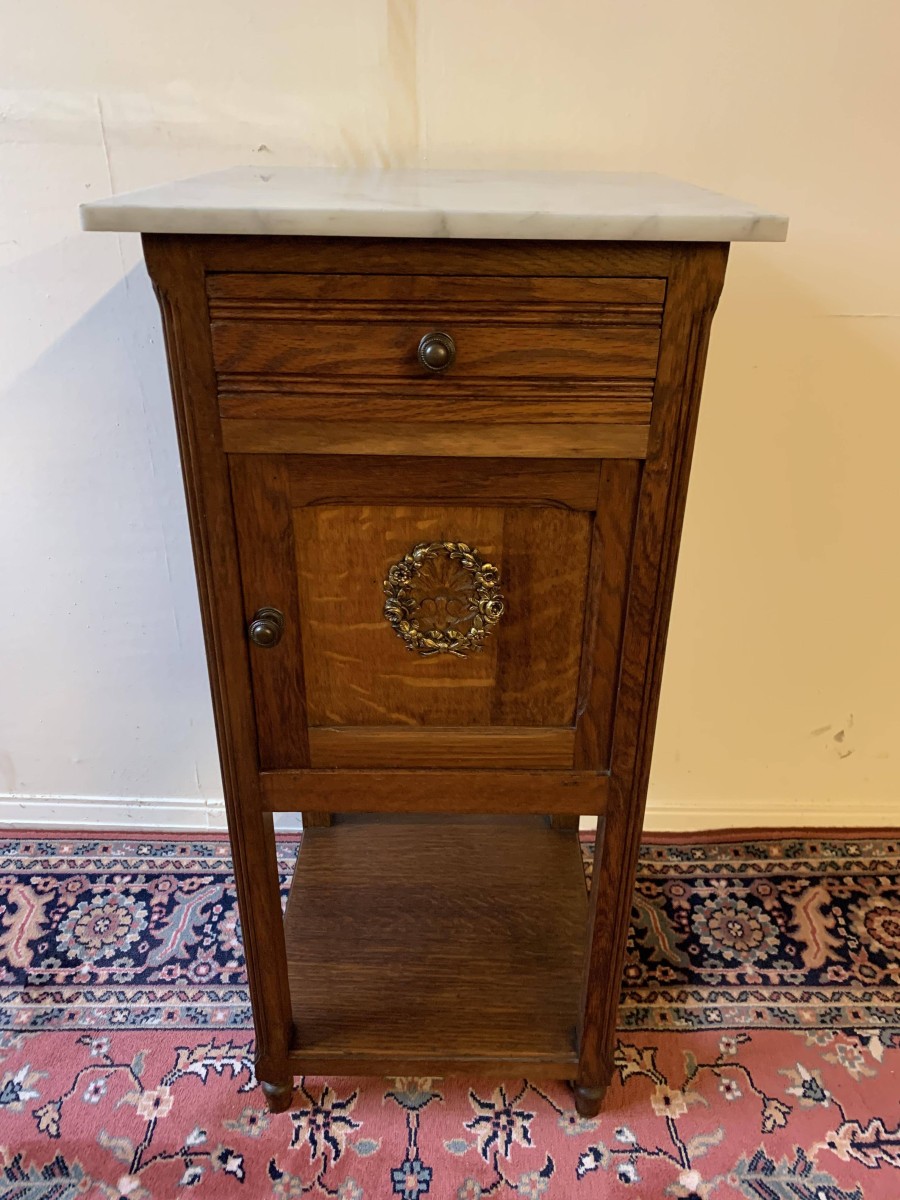This stylish cabinet has a marble top which sits above a carved drawer, the drawer has a brass handle below is a recessed panelled cupboard door having central carving and wonderful ormolu carved crest. The door opens to reveal good sized storage. Recessed panelled sides, shelf below the cabinet has reeded carving to the sides and stands on four elegant turned legs. We are also listing a matching armoire and dressing chest.