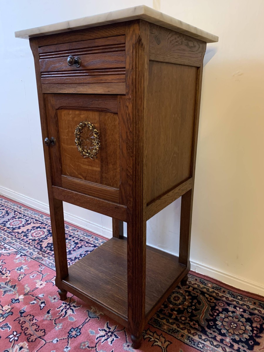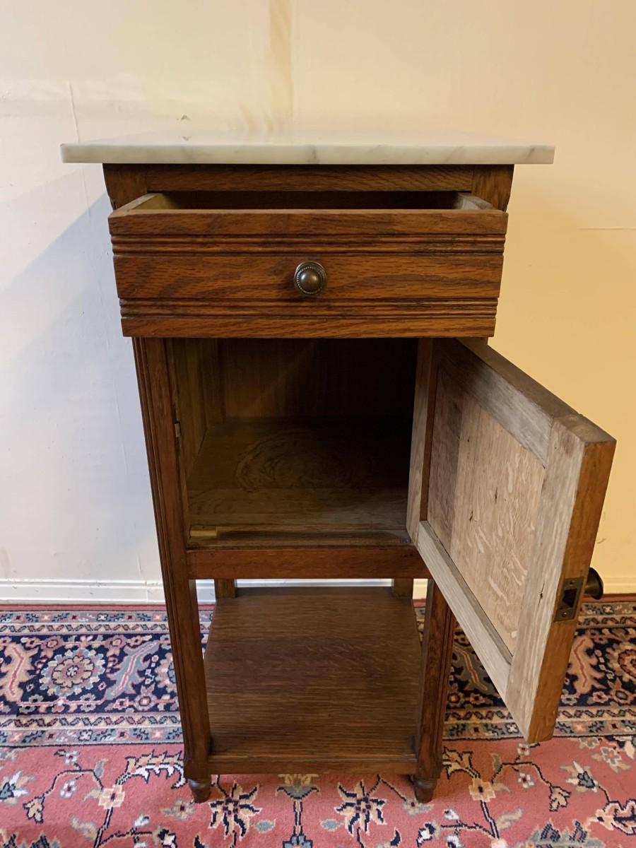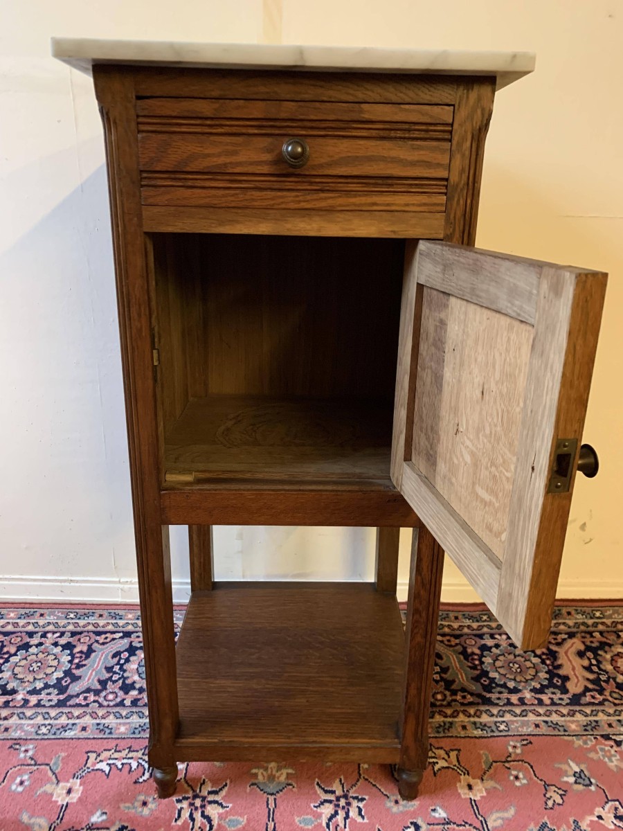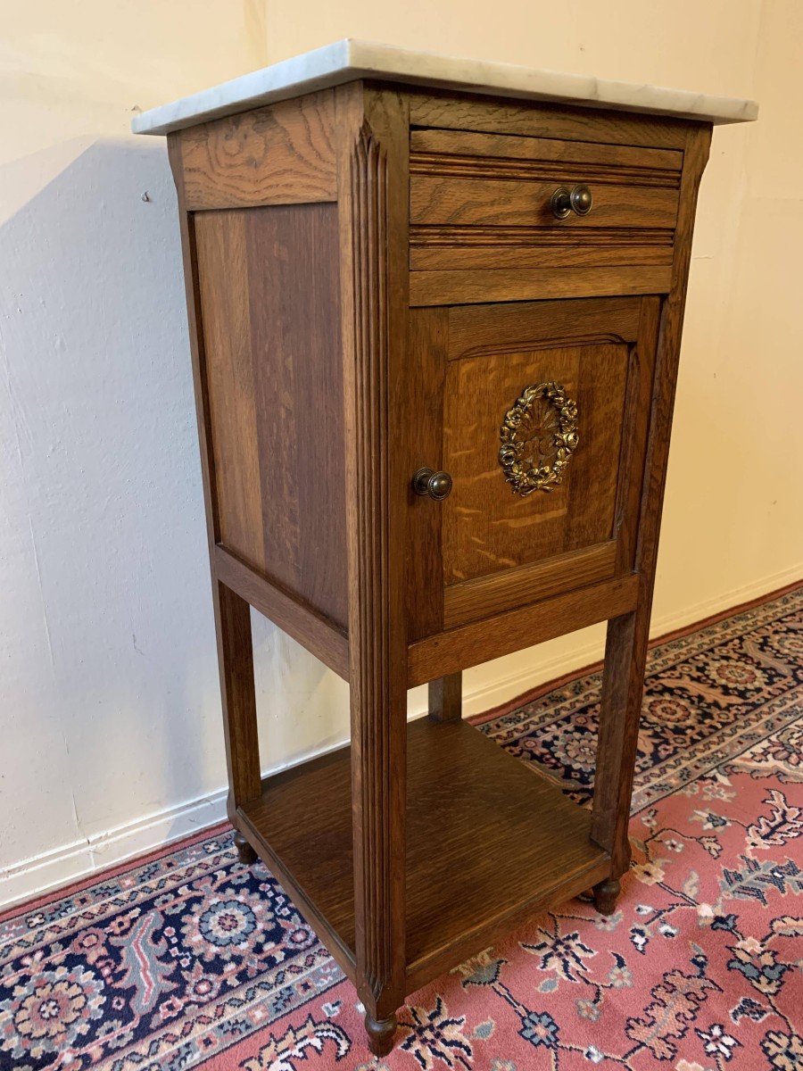 This stylish cabinet has a marble top which sits above a carved drawer, the drawer has a brass handle below is a recessed panelled cupboard door having central carving and wonderful ormolu carved crest. The door opens to reveal good sized storage. Recessed panelled sides, shelf below the cabinet has reeded carving to the sides and stands on four elegant turned legs. We are also listing a matching armoire and dressing chest.
