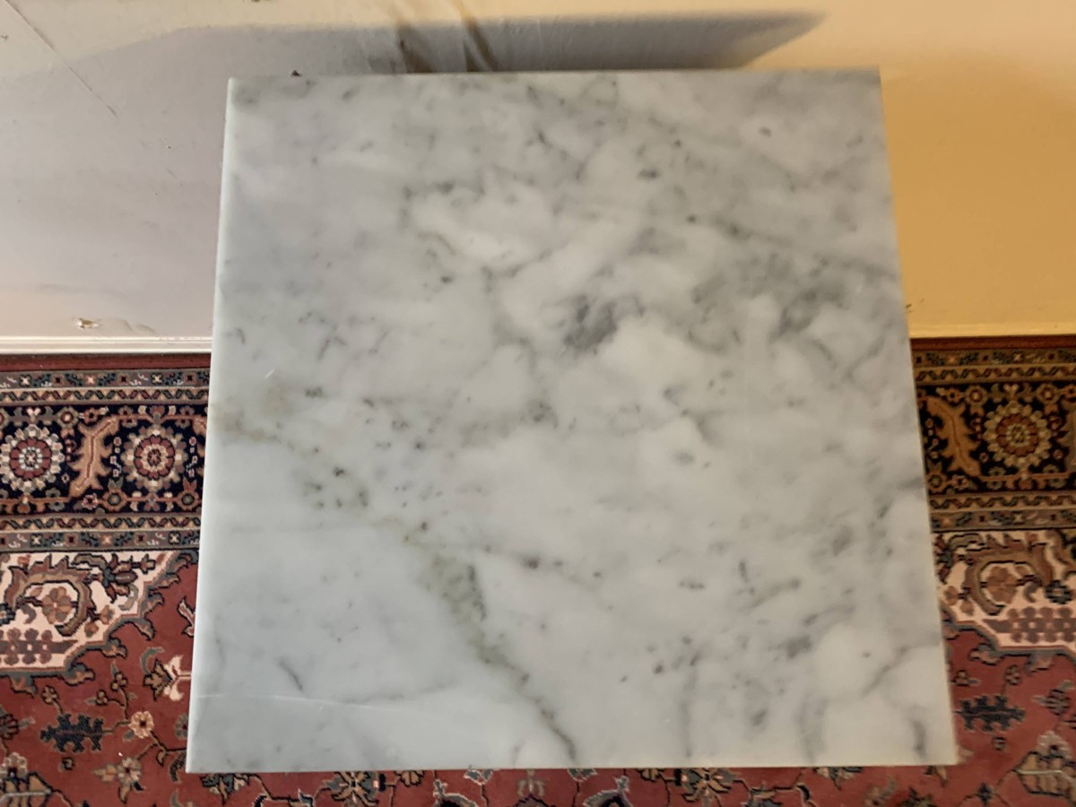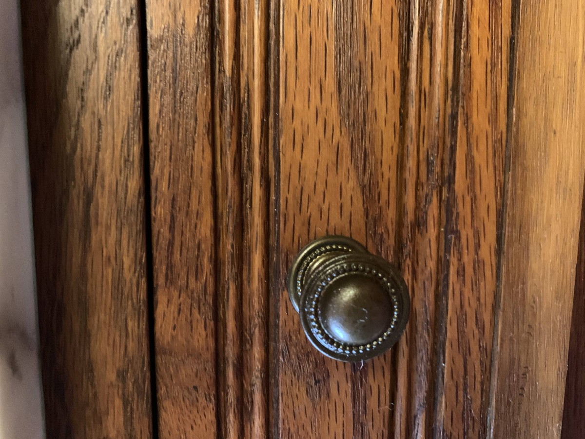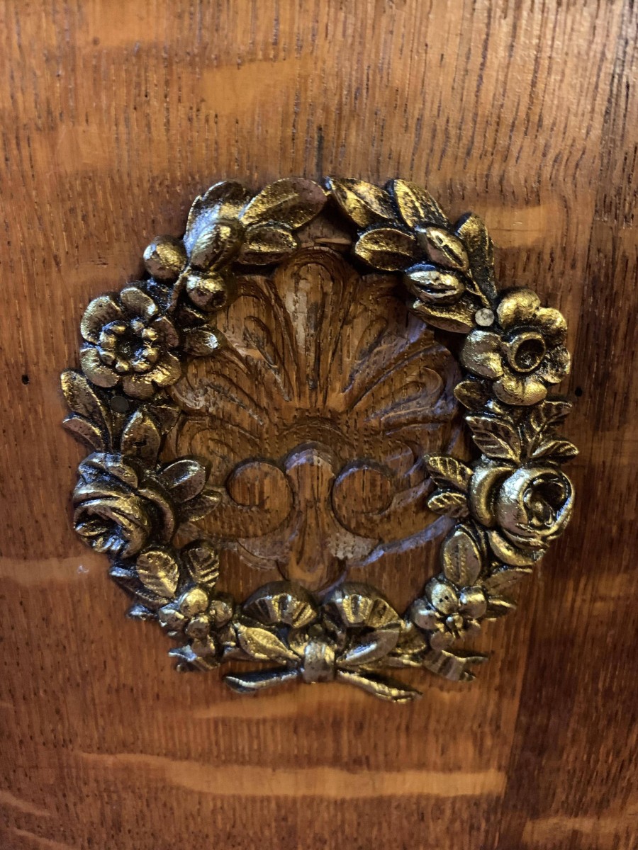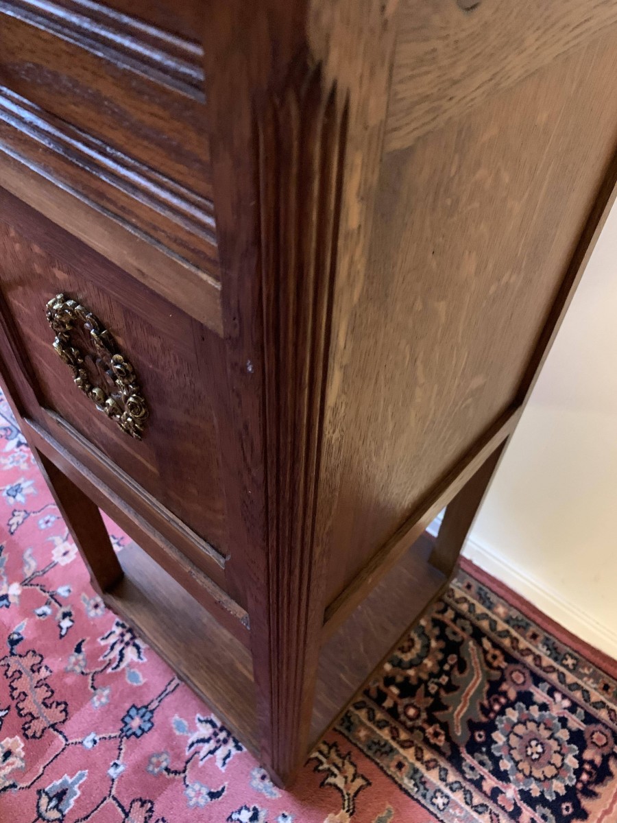 This stylish cabinet has a marble top which sits above a carved drawer, the drawer has a brass handle below is a recessed panelled cupboard door having central carving and wonderful ormolu carved crest. The door opens to reveal good sized storage. Recessed panelled sides, shelf below the cabinet has reeded carving to the sides and stands on four elegant turned legs. We are also listing a matching armoire and dressing chest.