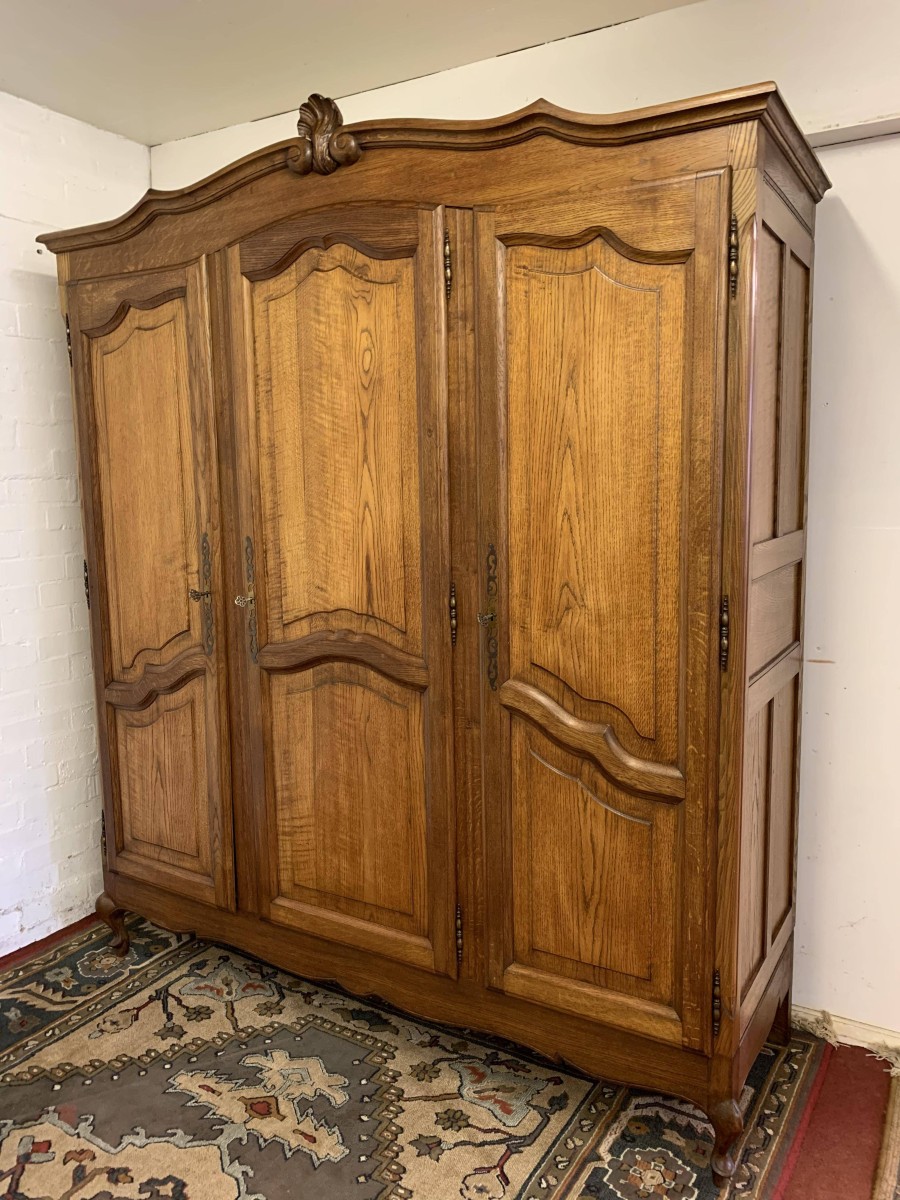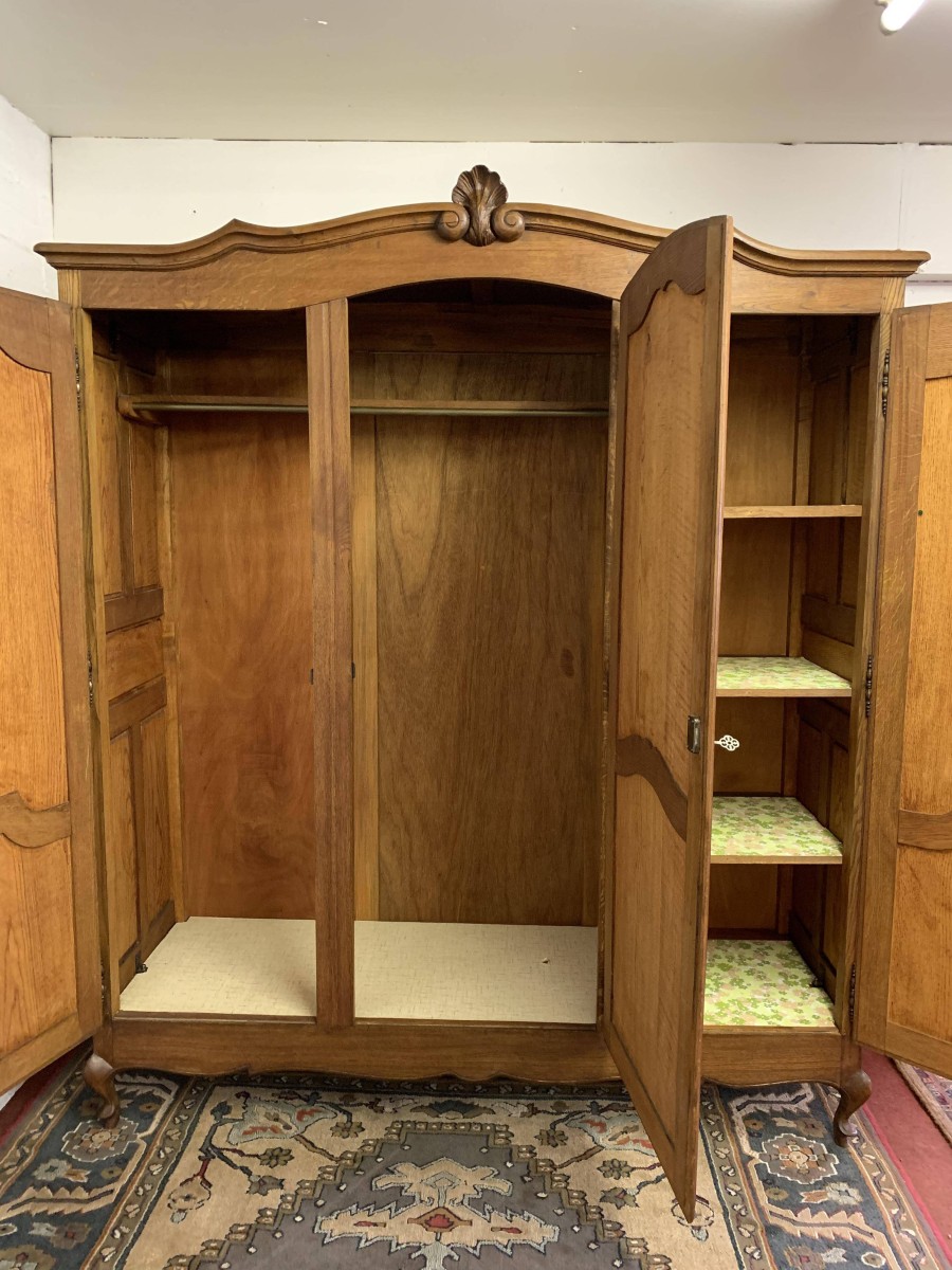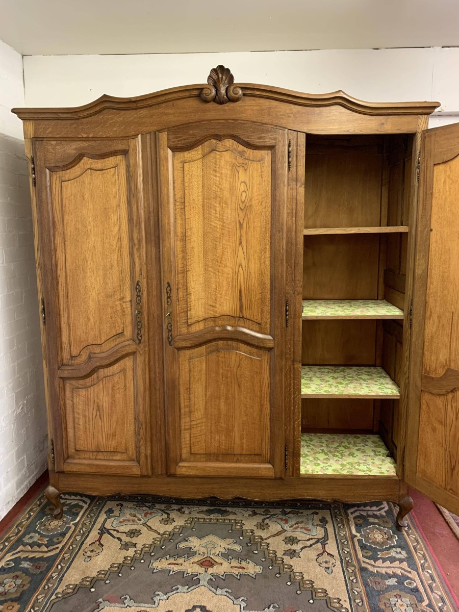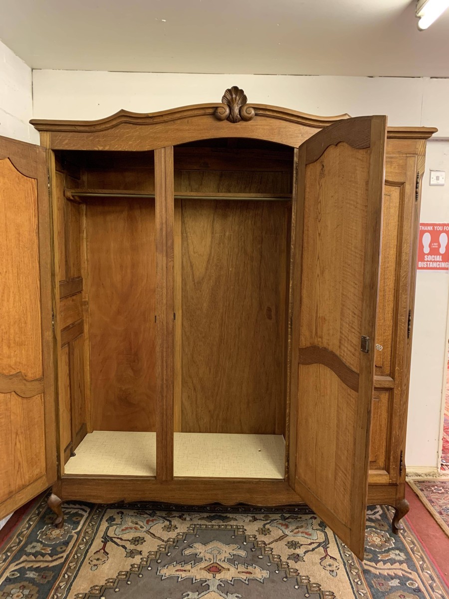 The shaped oversailing top rises to a decorative central carving. Below are three shaped recessed panelled lockable doors, each door having brass hinges decorative brass escutcheon and key. The central and left-hand door open to reveal a shelf above a brass hanging rail. The right-hand door opens to reveal three adjustable and removable shelves. Recessed panelled sides, shaped skirt, this armoire stands on two cabriole shaped legs to the front. Please note this wardrobe splits down for easy transportation and delivery into any home.