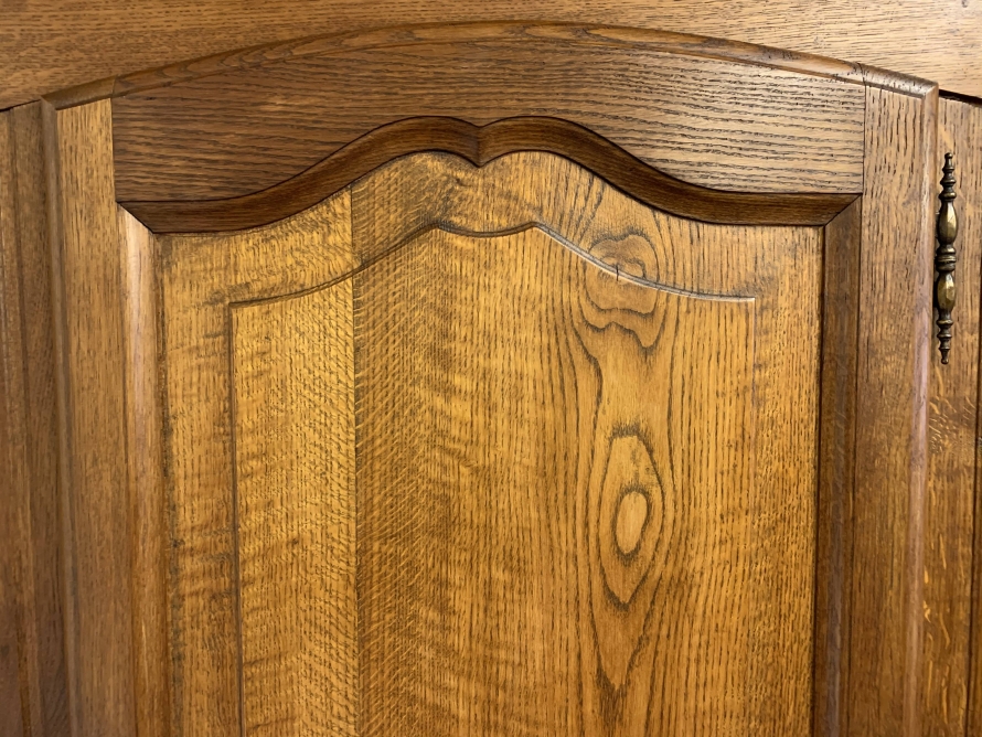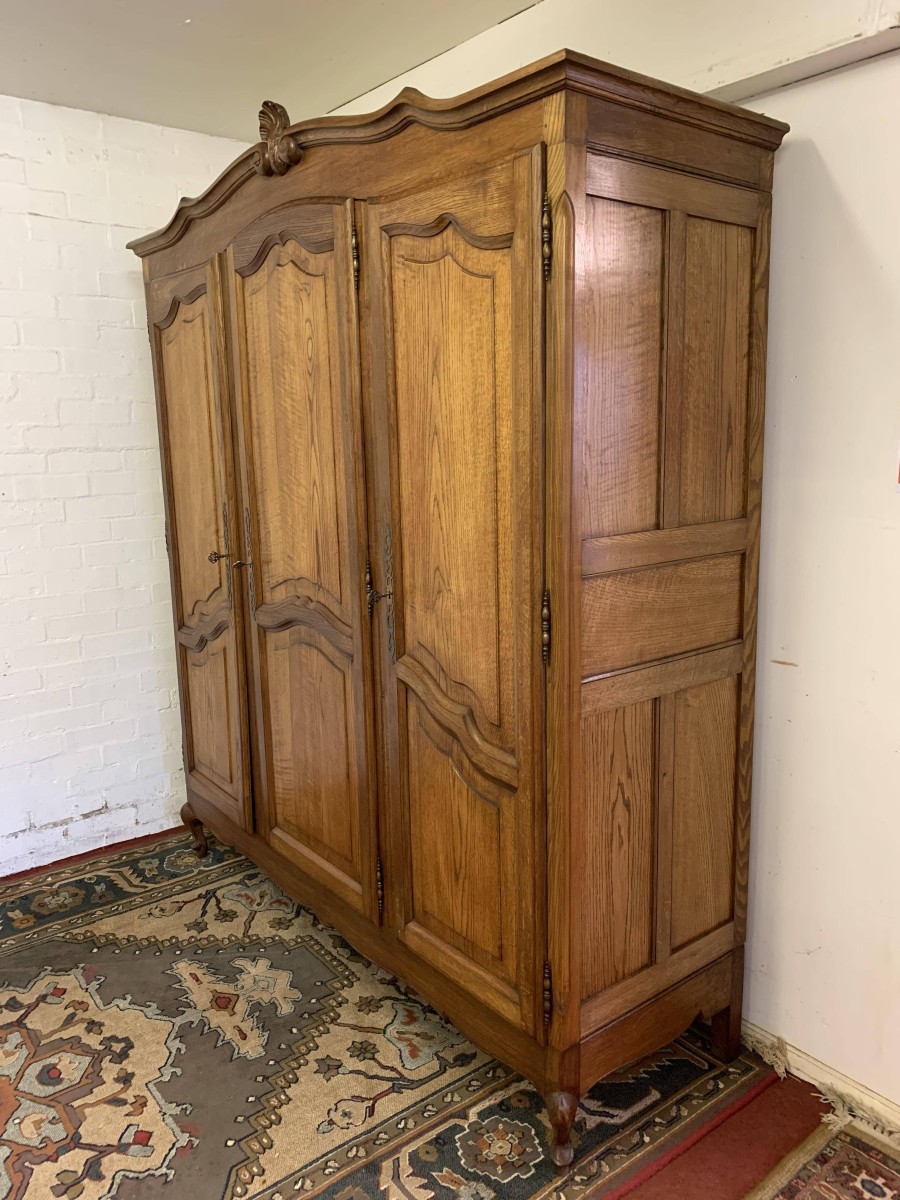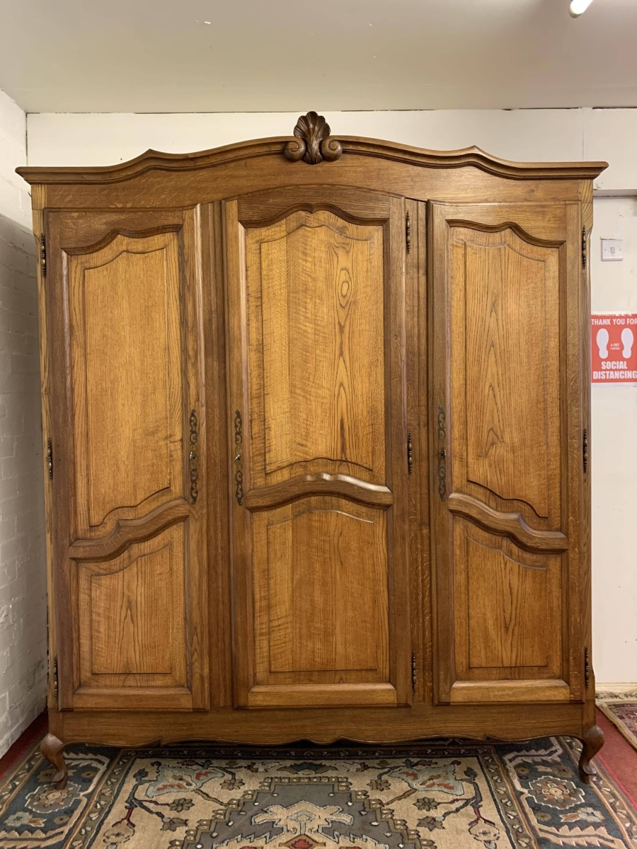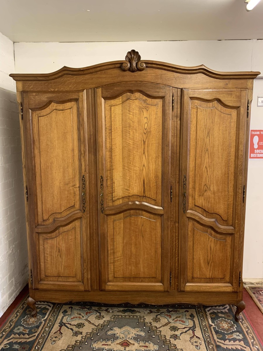 The shaped oversailing top rises to a decorative central carving. Below are three shaped recessed panelled lockable doors, each door having brass hinges decorative brass escutcheon and key. The central and left-hand door open to reveal a shelf above a brass hanging rail. The right-hand door opens to reveal three adjustable and removable shelves. Recessed panelled sides, shaped skirt, this armoire stands on two cabriole shaped legs to the front. Please note this wardrobe splits down for easy transportation and delivery into any home.