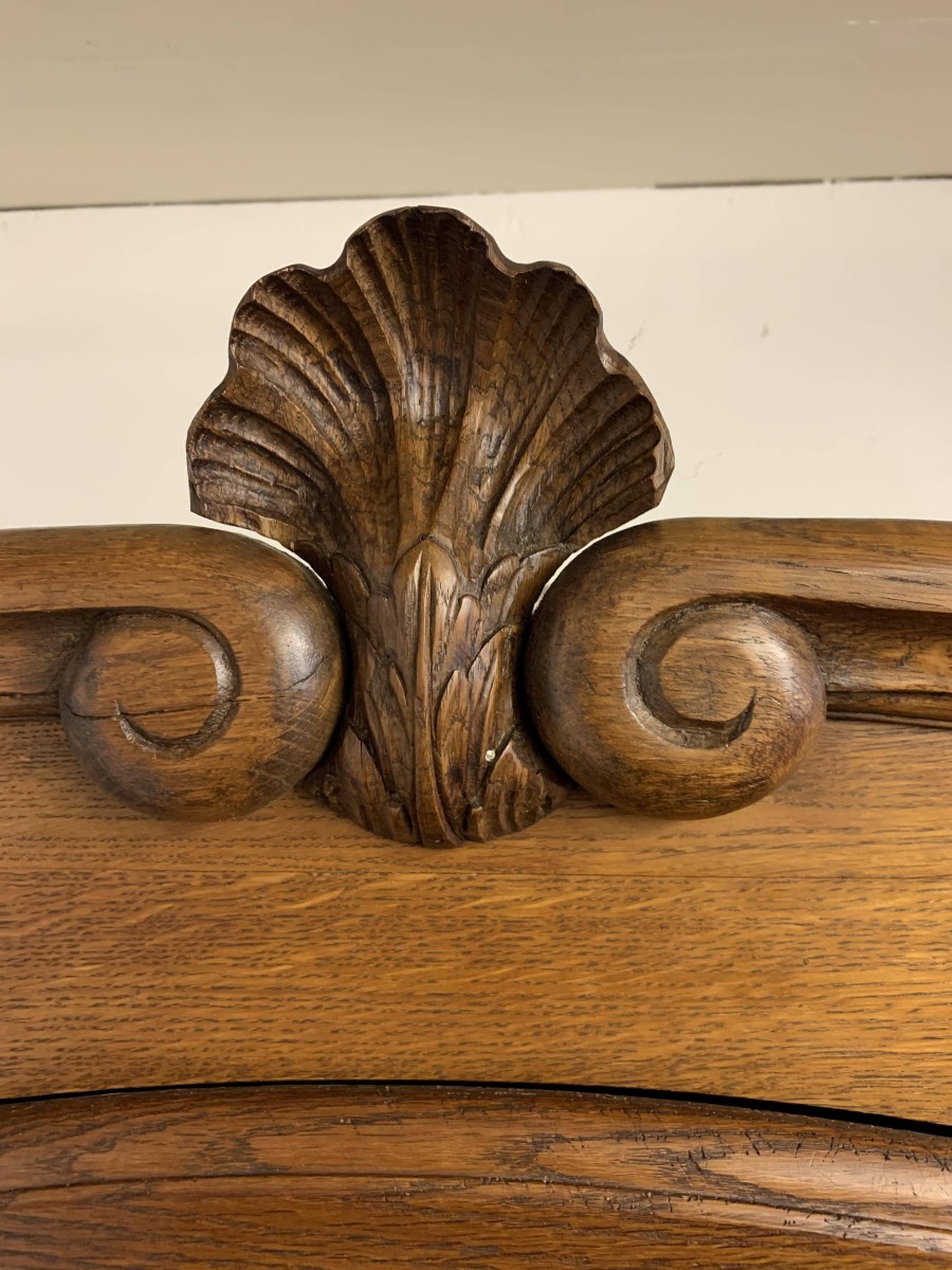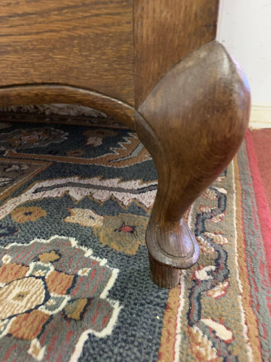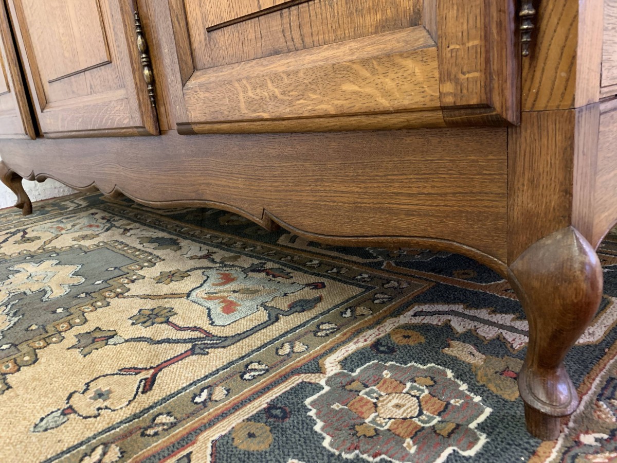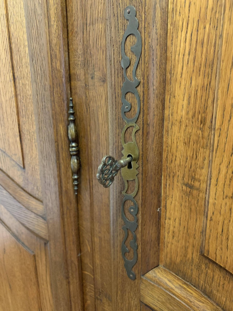 The shaped oversailing top rises to a decorative central carving. Below are three shaped recessed panelled lockable doors, each door having brass hinges decorative brass escutcheon and key. The central and left-hand door open to reveal a shelf above a brass hanging rail. The right-hand door opens to reveal three adjustable and removable shelves. Recessed panelled sides, shaped skirt, this armoire stands on two cabriole shaped legs to the front. Please note this wardrobe splits down for easy transportation and delivery into any home.