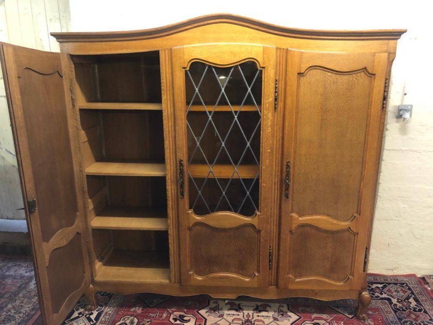The over sailing top rises to the centre. Below is a central glazed lockable door which is flanked by a pair of shaped recess panelled lockable doors. Each door has brass hinges, key and decorative escutcheon. Each door opens to reveal three adjustable and removable shelves. Recessed panelled sides shaped skirt this elegant bookcase stands on two shaped carved cabriole legs to the front. Please note this bookcase splits down for easy transportation and delivery into any home.
