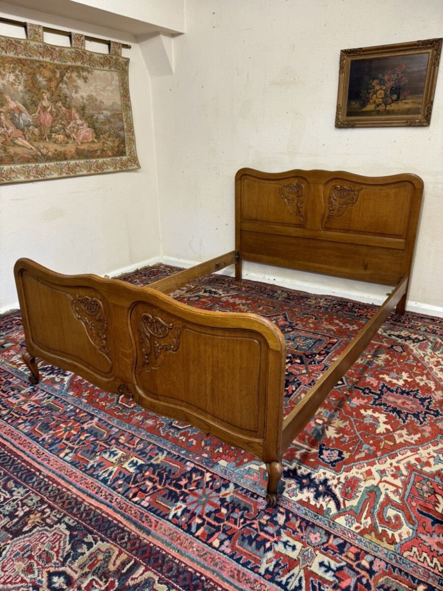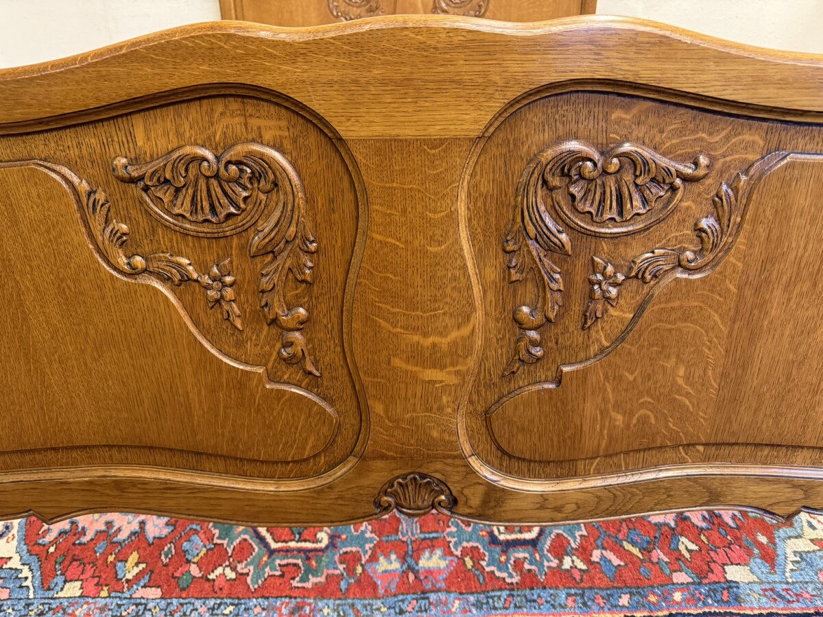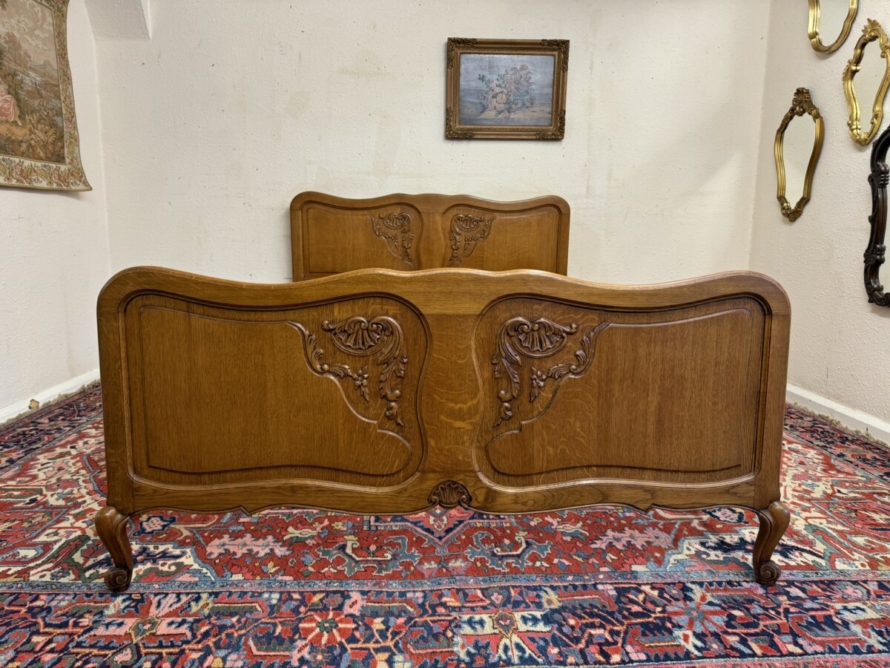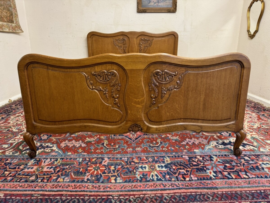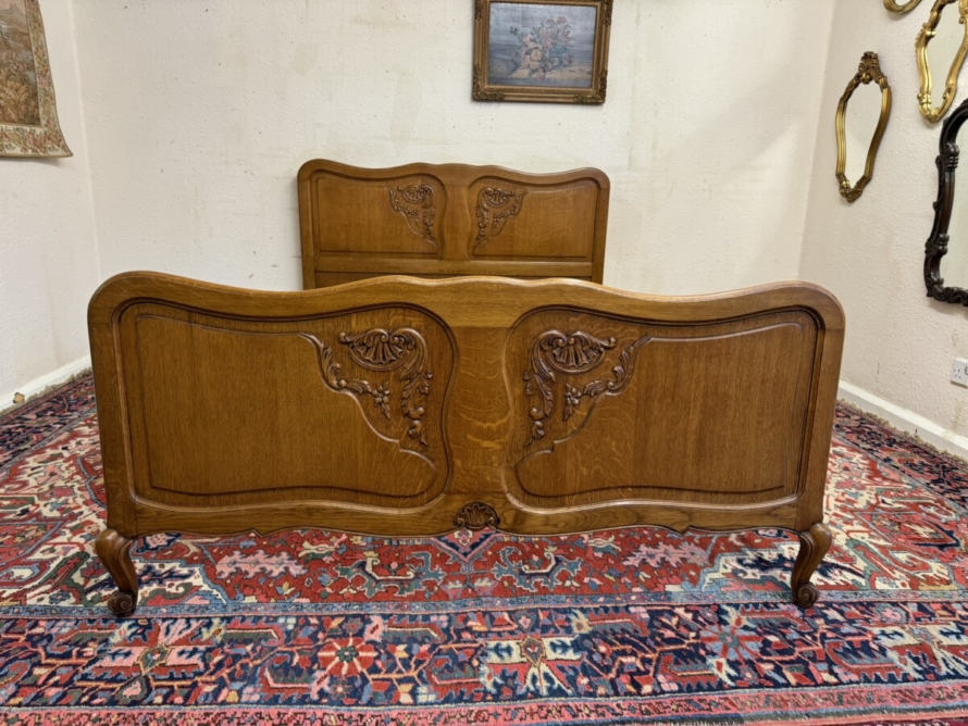 The shaped headboard has a pair of carved shaped panels. The footboard also has a matching pair of carved panels with central carving to the skirt and standing on two carved cabriole legs. The head and footboard are connected by shaped side rails.