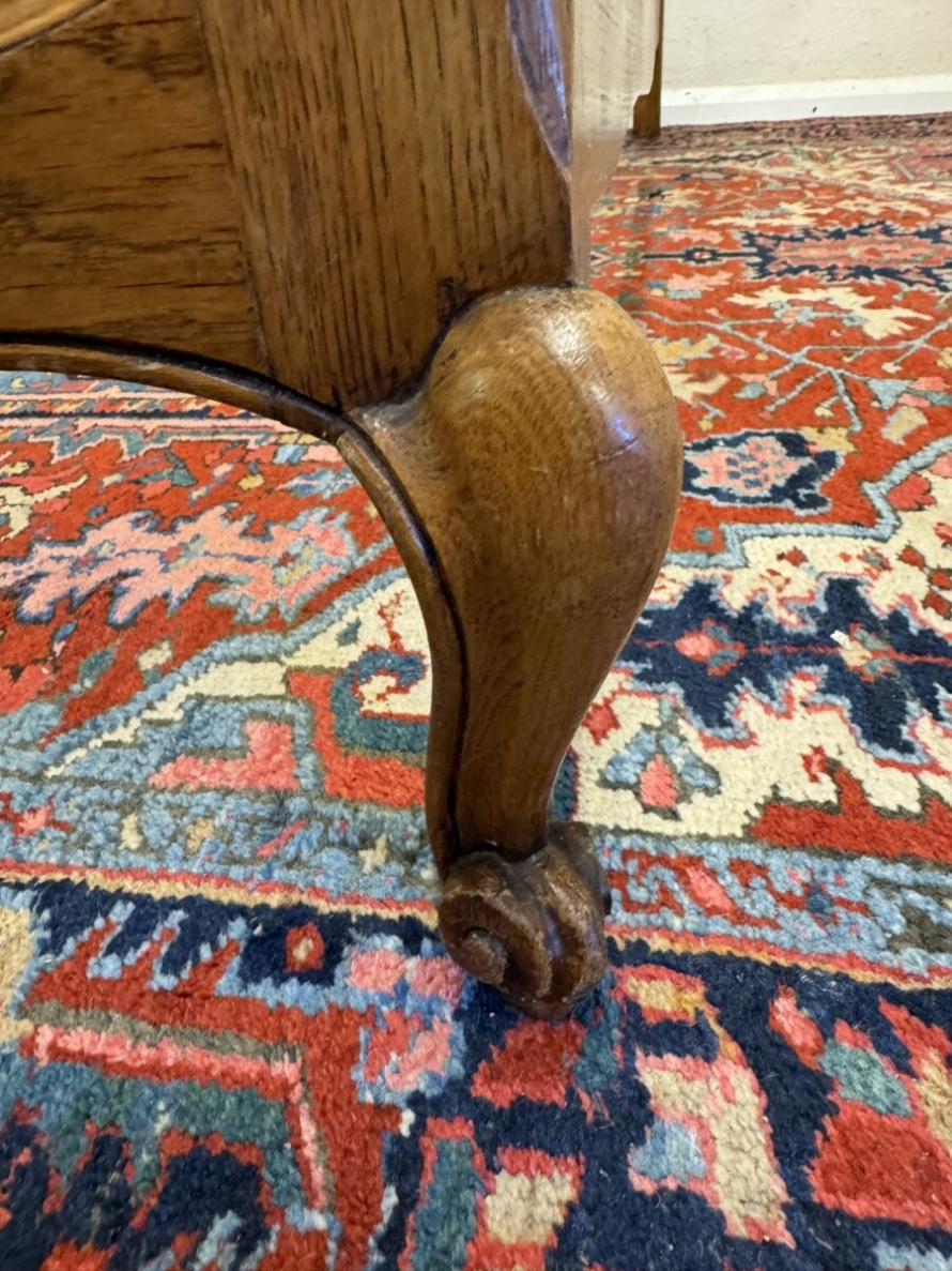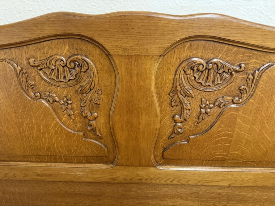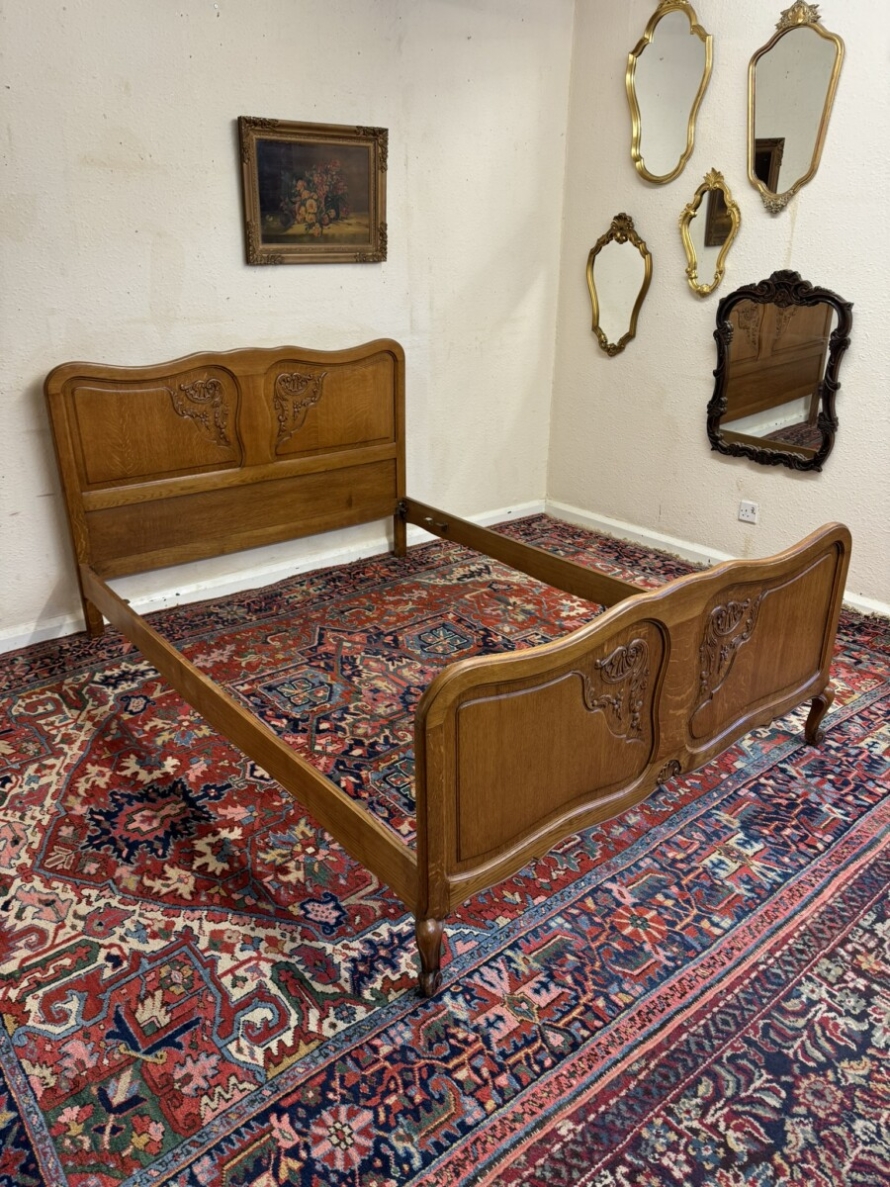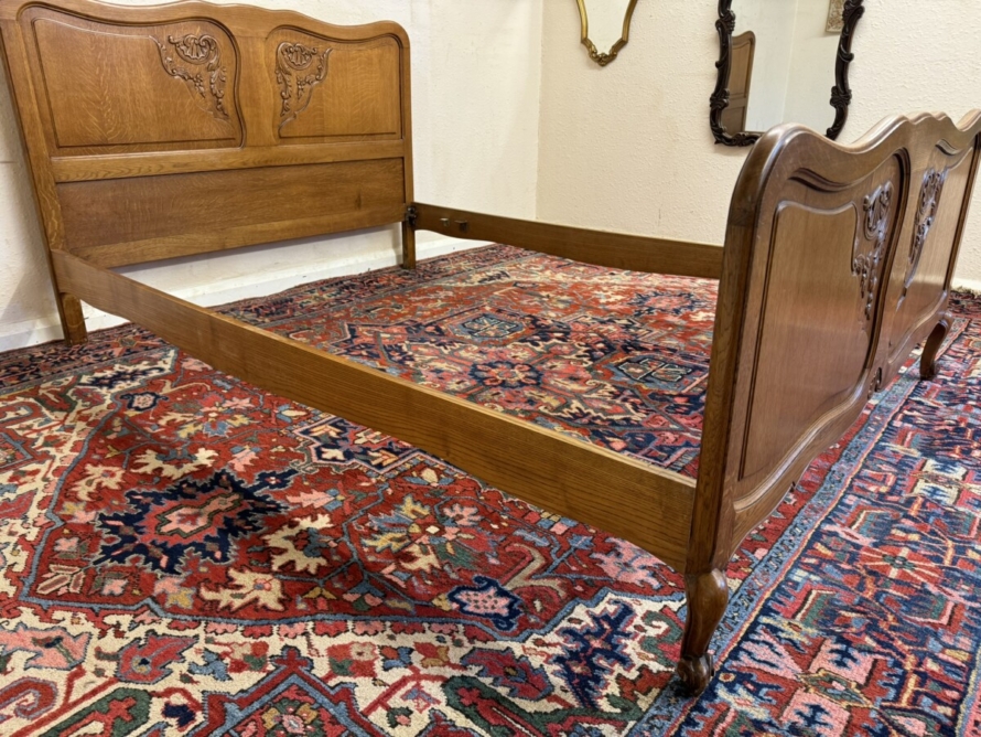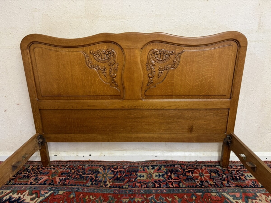 The shaped headboard has a pair of carved shaped panels. The footboard also has a matching pair of carved panels with central carving to the skirt and standing on two carved cabriole legs. The head and footboard are connected by shaped side rails.