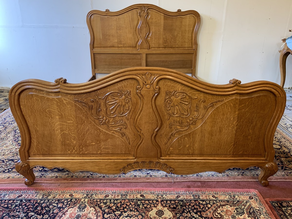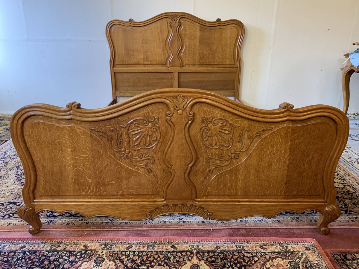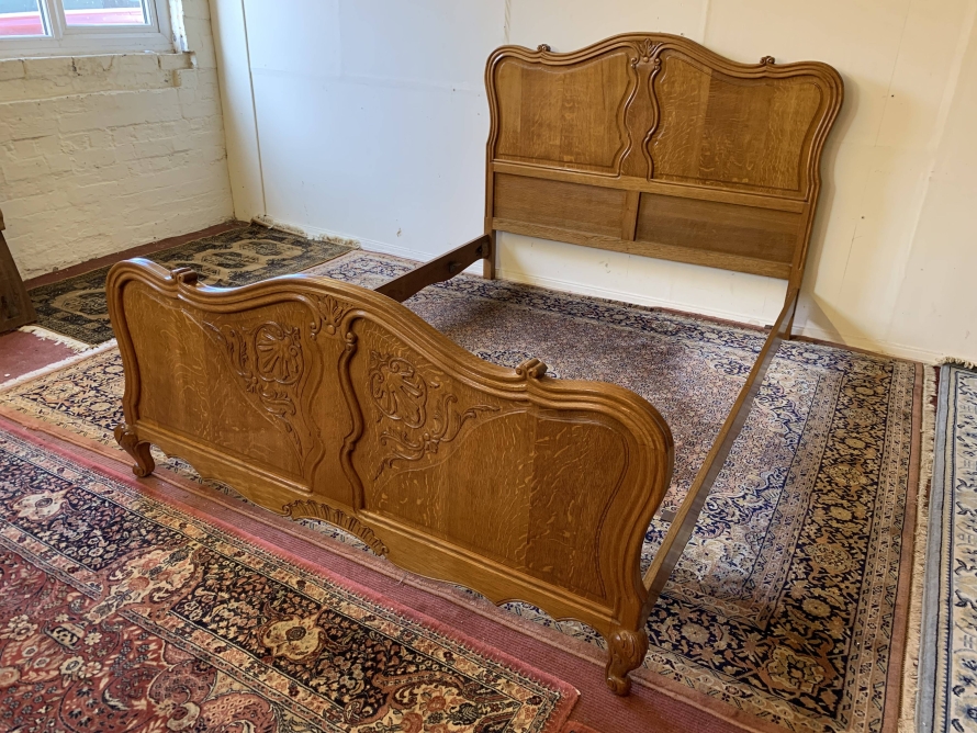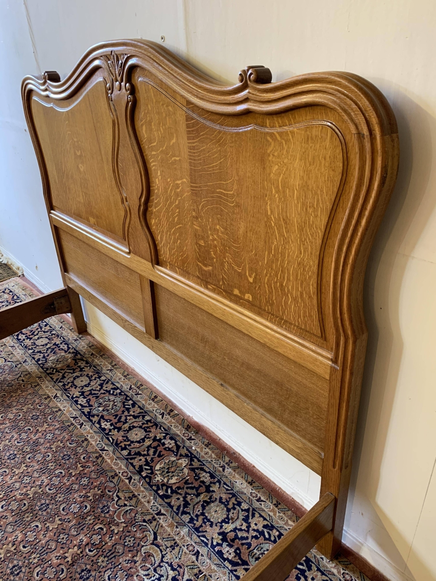The shaped headboard has carvings and two shaped recessed panels. The footboard is also shaped with two shaped recessed carved panels with carvings below and the bed stands on two carved cabriole legs. The bed has two shaped side rails. The bed takes a standard double mattress.