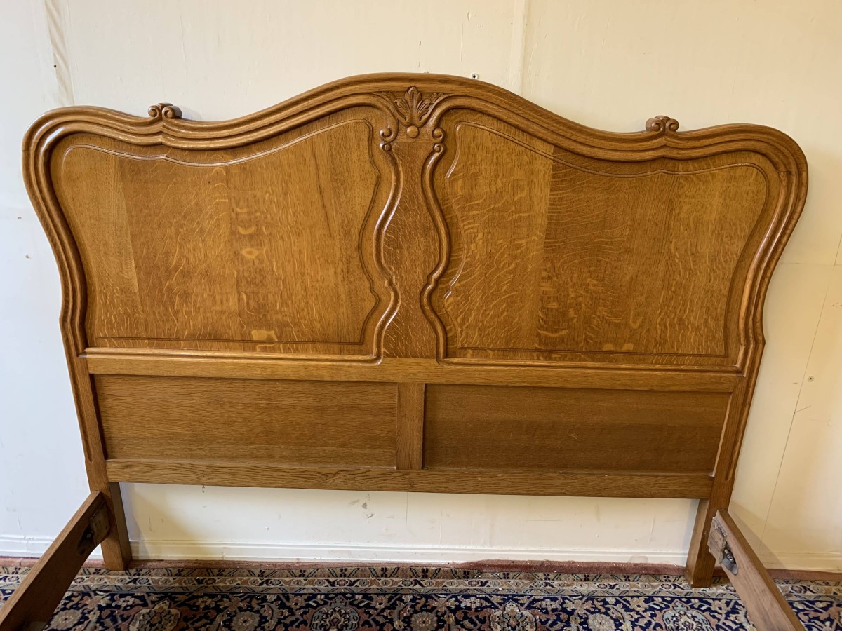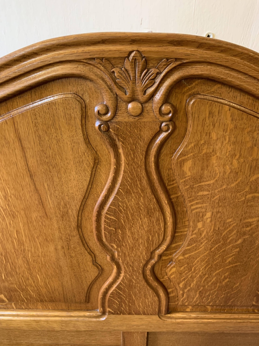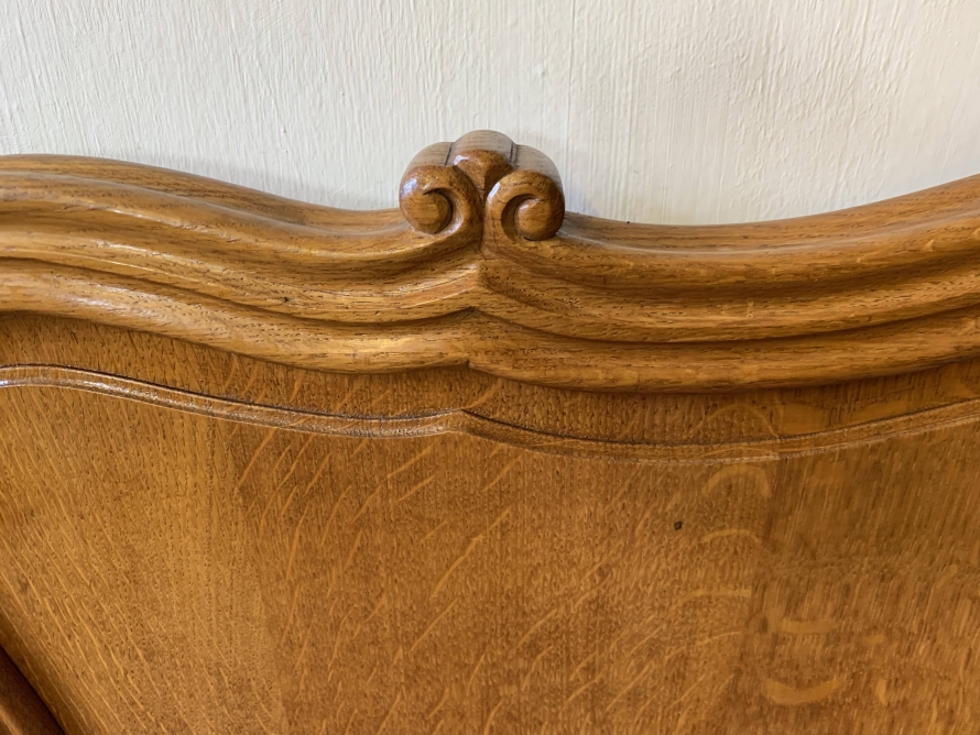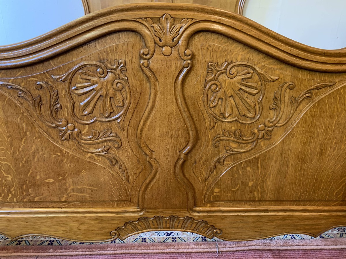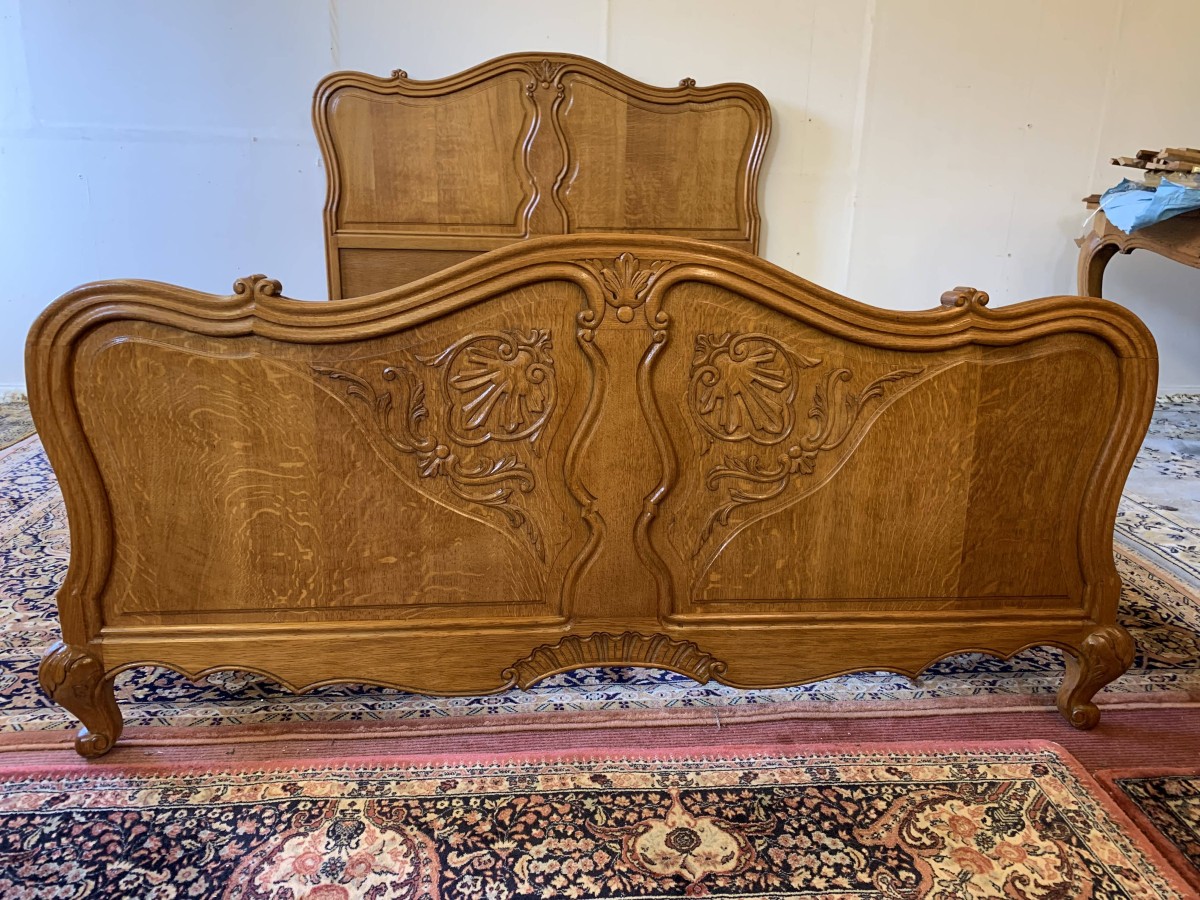 The shaped headboard has carvings and two shaped recessed panels. The footboard is also shaped with two shaped recessed carved panels with carvings below and the bed stands on two carved cabriole legs. The bed has two shaped side rails. The bed takes a standard double mattress.
